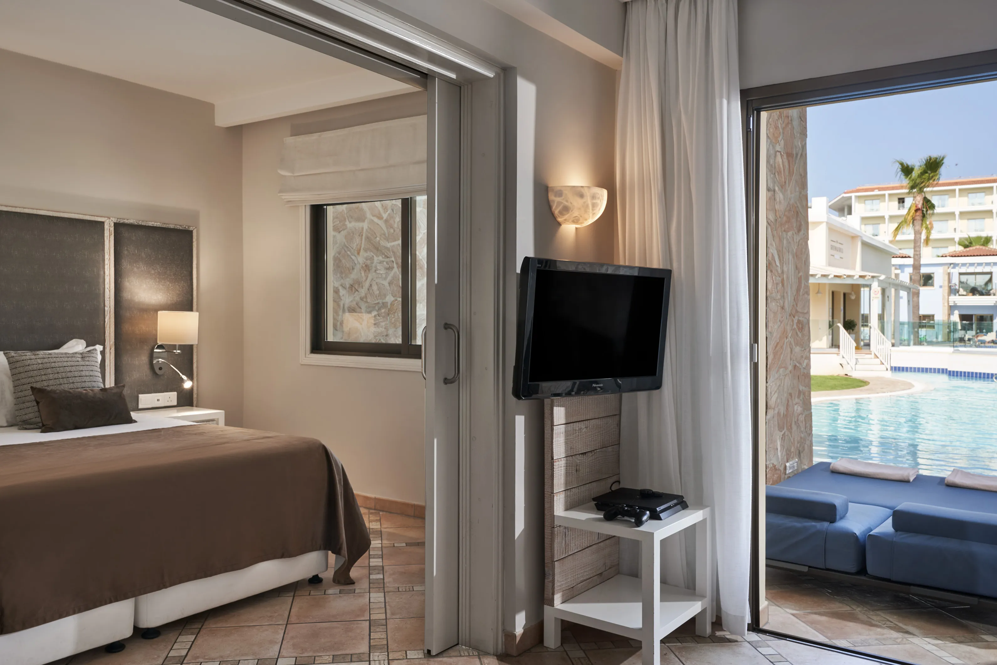Atlantica Aeneas Resort is a welcoming 5-star getaway, centered around one of Cyprus' largest free-form pools. With Mediterranean-inspired decor, Cypriot architecture, and friendly service, it offers the perfect blend of relaxation and excitement, ensuring a memorable holiday in a peaceful, beautifully designed setting. Nestled in a tranquil spot, Atlantica Aeneas Resort is just a short stroll from the stunning beach. The Resort offers 414 spacious room and suites designed for comfort and relaxation for families or couples. Each comes with modern amenities and serene views, perfect for unwinding after a day of adventure. Location:326 Total number of rooms; 3 Number of floors (main building); Connecting rooms Hotel type:hotel Methods of payment:American Express; MasterCard; Visa; Maestro; Visa Electrón Distances (in meters):City centre (2500); Nearest Bus / Metro Stop (150); Harbour (2500); Beach (90) Room facilities (Standard room):Bathroom; Disability-friendly bathroom; Bathtub; Hairdryer; Toiletries; Bathrobes; Slippers; Wi-fi; Direct dial telephone; TV; Satellite TV ; Radio; 220V power supply; Minibar (Extra Fee); Mini fridge; Tea and coffee making facilities ; Centrally regulated air conditioning; Central heating; Safe; Balcony; Terrace; Wheelchair-accessible; Wake-up service; Pillow menu; Turndown service; Smoking rooms; Smoke detector; Housekeeping; Cot on demand Facilities:Small pets allowed (under 5 kg); Large pets allowed (over 5 kg); Wheelchair-accessible; Car park; Garage; 24-hour reception; Check-in hour; Check-out hour; Mobile phone coverage; Wi-fi; Local and international calls; Car hire; Room service; Laundry service; Medical service (Extra Fee); Babysitting service; Multilingual staff; Air conditioning in public areas; Currency exchange facilities; Lift access; Shop; Garden; Gym; Luggage room Catering:Café; Bar; 3 Restaurant; Non-smoking area; Smoking area; Highchairs; Poolside snack bar; Swim-up bar; Air conditioning in Restaurant Business:5 Conference room Entertainment:1 Indoor freshwater pool; 1 Indoor heated pool; 4 Outdoor freshwater pool; Children’s swimming area; Sun loungers; Parasols; Children playground; Kids’ club; Entertainment programme for adults; Entertainment programme for children; TV lounge; Game room Health:Sauna; Steam bath; Massage (Extra Fee); Spa treatments (Extra Fee); Hairdressing salon; Spa centre