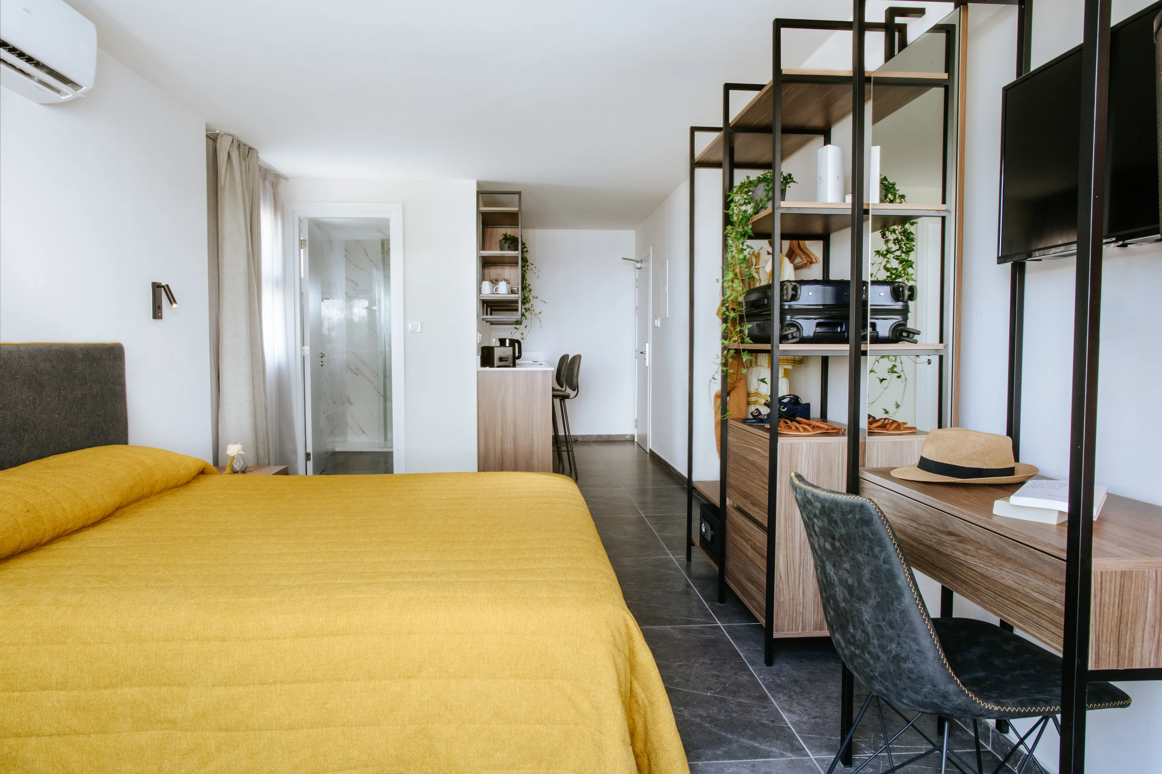 The Cosmo Napa Hotel is situated in a fabulous location in the heart of Ayia Napa, walking distance from the Town Hall and all amenities like taverns, restaurants, minimarkets, car and bike rentals pubs and clubs. Due to its exceptional location guests can be close to the hustle and bustle of the city but at the same time they can enjoy the ultimate relaxation at the area of the property which features a private pool as well. New, elegantly decorated; all air-conditioned rooms also include a flat-screen TV, fridge, kettle, toaster and microwave oven. Private parking is available at the property. Location:2020 Year of most recent renovation; 99 Total number of rooms; 2 Number of floors (main building); 3 Number of floors (annexe); 98 Studios; 1 Family rooms Hotel type:boutique hotel Methods of payment:American Express; MasterCard; Visa Distances (in meters):City centre (400); Airport (49000); Harbour (1600); Entertainment Area (400) Room facilities (Standard room):1 Number of bedrooms; Living room; Disability-friendly bathroom; Shower; Toiletries; Wi-fi; Internet access; TV; Satellite TV ; Mini fridge; Individually adjustable air conditioning; Safe; Wheelchair-accessible; Wake-up service; Smoking rooms; Smoke detector; Housekeeping; Extra beds on demand (Extra Fee); Cot on demand; 1 Electric Kettle Facilities:Wheelchair-accessible; Car park; 24-hour reception; Check-in hour; Check-out hour; Wi-fi; Car hire (Extra Fee); Room service; Smoke detector; Hotel safe; Garden; Sun terrace; Luggage room; Toaster; Towels and bed linen Catering:Café; Bar; Restaurant; Highchairs; Poolside snack bar Business:Printer; Fax Entertainment:1 Indoor freshwater pool; Sun loungers