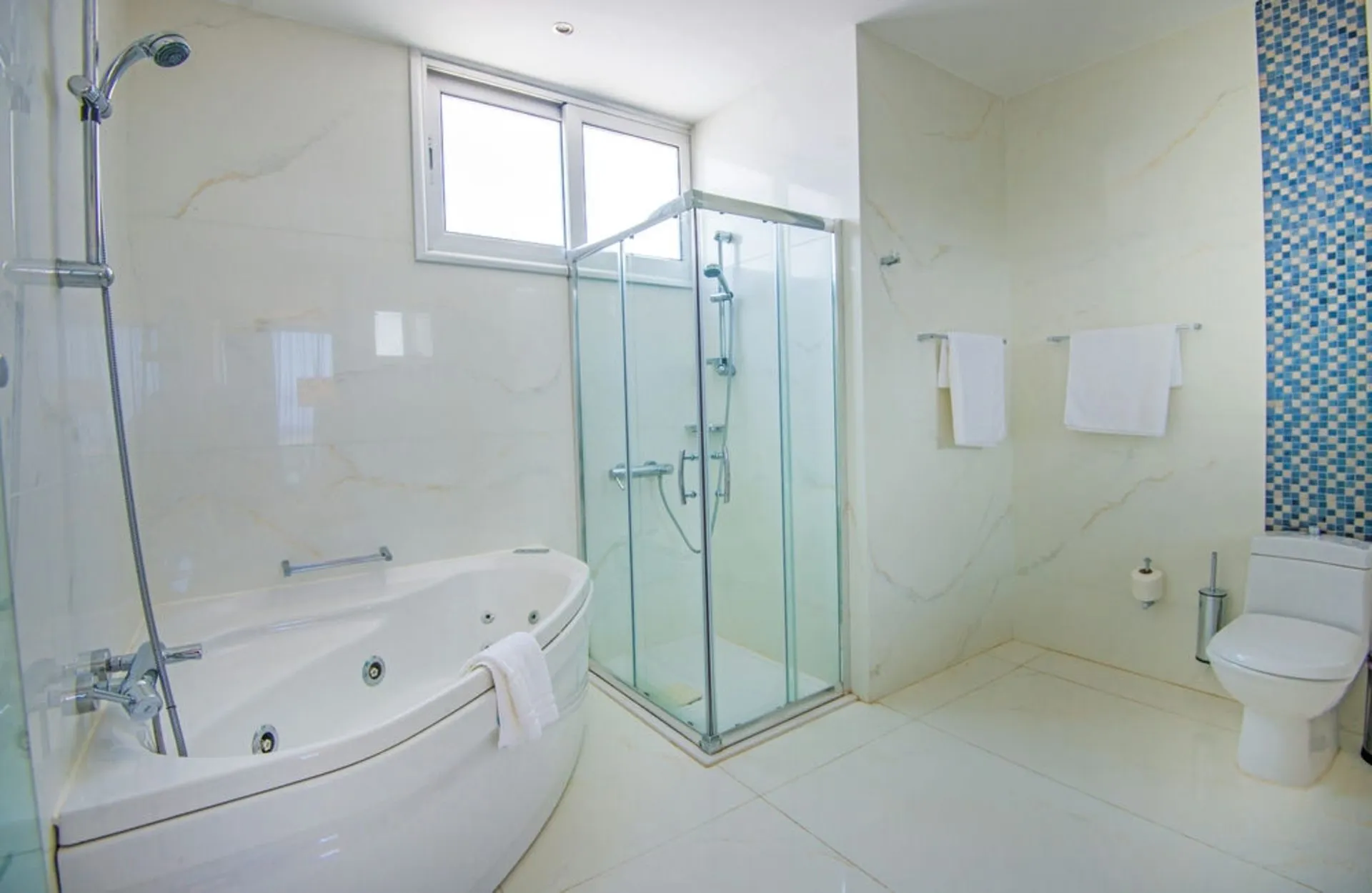 Just a few meters from the hotel`s own sandy beach lies the 4 star hotel Dome Beach Hotel & Resort. The beach is awarded a blue flag. Here, there are cushions, sun umbrellas and beach towels available. The hotel is equipped with a lobby bar, Wi-Fi (for a fee), internet access, 2 lifts, a jacuzzi as well as a TV lounge. In the outdoor area you will find a pool that is open seasonally. For children there is also a children's pool. Inside the hotel you can use an indoor pool. There is also a laundry service available at an additional cost to customers. If you want to explore the holiday region, you can use the car rental service close to the hotel (extra fee). Catering Breakfast is offered from the buffet. Lunch and dinner are also served from the buffet. Your physical well-being is catered for by a buffet restaurant. Distances