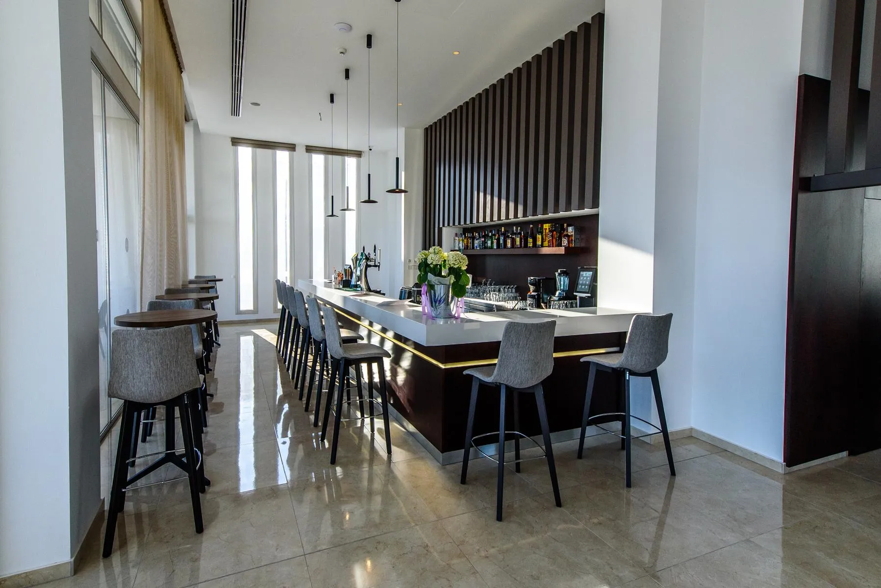 The 6-storey beach hotel has 116 rooms in total. It is equipped with a reception (check-in from 14:00, check-out until 12:00), a lobby with bar, a lift, an air conditioning, a shop, a parking area (for free) as well as a money changing facility. For the meals, there is a restaurant (air-conditioned). You will be warmly welcomed in both the hotel’s bars. WiFi is available for free. For guests dependent on a wheelchair the accommodation provides a barrier-free access and a number of wheelchair accessible bathrooms. Room cleaning and concierge service are free of charge. Laundry / ironing service is available for a fee. Pool: In the outdoor area of the modern hotel you will find one fresh water pool. Here, there are sun umbrellas and sun loungers for free available. A bar at the pool offers guests refreshing beverages (open from 10:00 - 19:00).