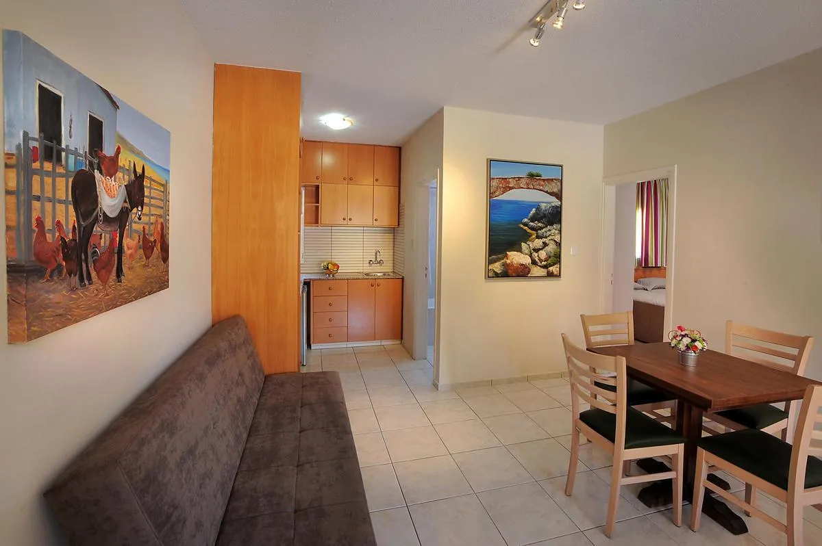 The hotel Nelia Gardens lies approx. 200 m from the Grecian Bay, a sandy beach. At the beach are sun loungers and sun umbrellas for a fee available. The tourist centre is about 200 m away. The town Paralimni is around 9 km away (Larnaca around 50 km, Nicosia around 85 km). A supermarket and other shopping facilities can be reached after 400 m. It is only 200 m from the hotel to the nearest bars and restaurants. For evening dancing you will find a nightclub in a distance of approx. 400 m.