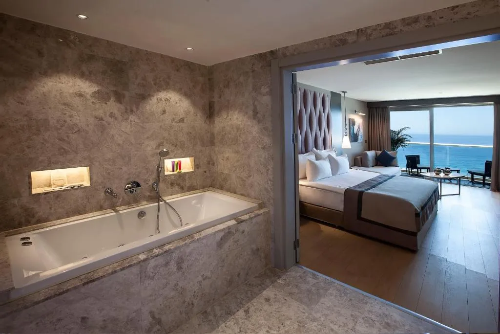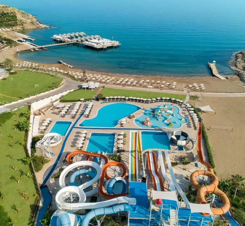Minibar alimentat zilnic, anumite restaurante a la carte (cu specific turcesc, italian si asiatic), seif in camera, piscine in aer liber, tobogane, piscine interioare, baie turceasca, sauna, sala de fitness, petreceri tematice, muzica live, de tenis, alee de alergat, boccia, darts, aerobic, stretching, aerobic in apa, volei pe plaja, baschet, fotbal, tenis de masa, cluburi pentru copii.