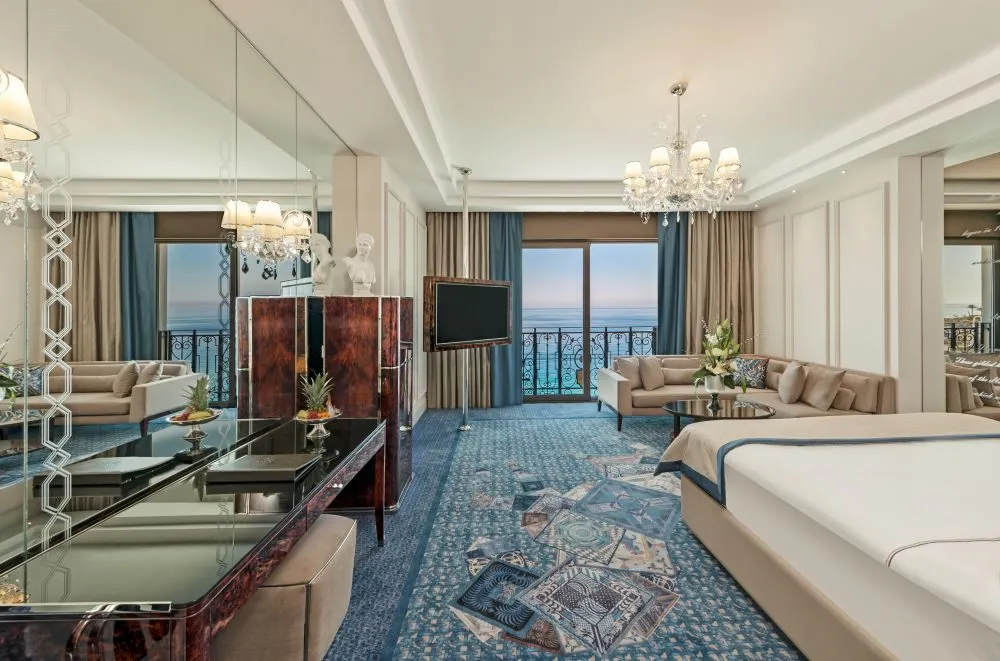 - Royal Suite Sea view Rooms- au o suprafata de 150 mp; sunt alcatuite dintr-un dormitor cu pat matrimonial si un living cu canapea extensibila si jacuzzi; capacitatea de cazare este de maximum 2 adulti+ 2 copii; balcon spatios
