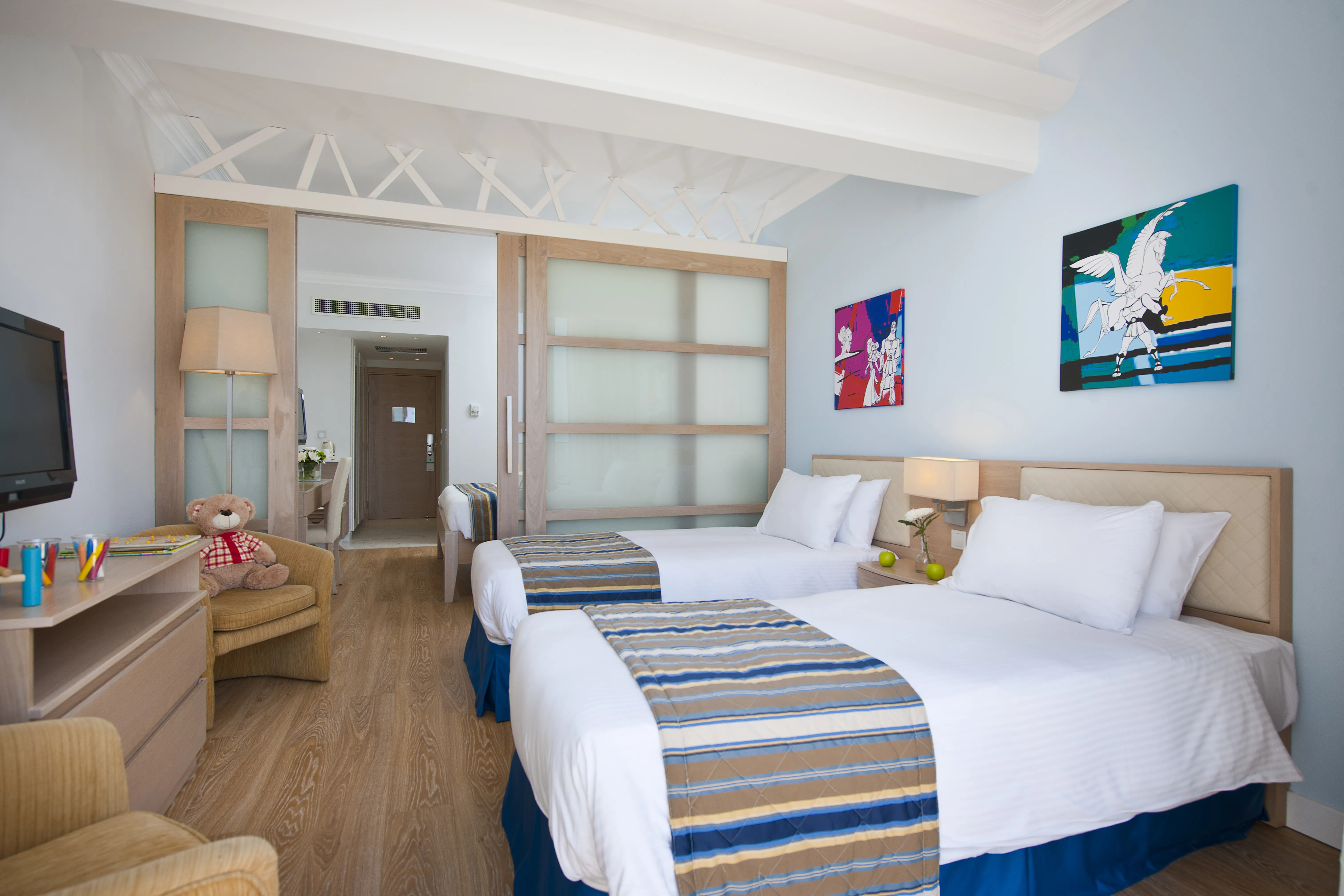 A unique concept of Luxury All-Inclusive pleasure, where you will enjoy the Cypriot hospitality at its best. This luxurious resort enjoys a privileged situation just a few steps from the beautiful Landa Golden Beach bathed in crystal-clear waters of the Mediterranean Sea and is located within ease of access to local attractions including Kato Paphos Archaeological Park and The House of Dionysus. Guests will be captivated by impressing facilities, superb décor and high quality customer service. The hotel offers different accommodation options, all of them tastefully appointed and featuring soothing hues and cosy furniture. Whether you are looking for a fun family holiday or a romantic getaway with your partner, the Olympic Lagoon Resort promises an unforgettable holiday experience. The hotel offers its guests 6 themed restaurants with à la carte menus, all-day snacks, premium ice-cream creations and themed buffet nights featuring unique culinary experiences and 5 themed bars, open from early morning until late evening serving unlimited premium alcoholic drinks and signature cocktails. The hotel also features 5 themed swimming pools, with waterfalls, waterslides, hydro-relaxation loungers and zero-level pool entries, a spa and wellness centre, tennis and basketball courts and a children's playground. Location:2007 Year of most recent renovation; 273 Total number of rooms; 224 Double rooms; 46 Junior suites; 3 Suites Hotel type:hotel Methods of payment:American Express; EC; JCB; Diners Club; MasterCard; Visa Distances (in meters):City centre (4000); Airport (6400) Room facilities (Standard room):Shower; Hairdryer; Toiletries; Bathrobes; Slippers; Wi-fi; Internet access; Mini fridge; Tea and coffee making facilities ; Individually adjustable air conditioning; Individually adjustable heating ; Safe; Smoking rooms; Housekeeping Facilities:Wheelchair-accessible; Car park; 24-hour reception; Check-in hour; Check-out hour; Wi-fi; Local and international calls; Airport Shuttle; Room service (Extra Fee); Laundry service (Extra Fee); Babysitting service; Multilingual staff; Bellboy service; Air conditioning in public areas; Smoke detector; Hotel safe; Currency exchange facilities; Cloakroom; Lift access; Shop; Garden; Terrace; Concierge; Gym; Newspapers; Luggage room; Dining area; Private beach area; Towels and bed linen Catering:Café; Bar; 6 Restaurant; Non-smoking area; Smoking area; Highchairs; Poolside snack bar; Show cooking; Swim-up bar; Air conditioning in Restaurant Business:Printer; Photocopier; Business centre Entertainment:1 Indoor freshwater pool; 3 Outdoor freshwater pool; 1 Children’s swimming area; Sun loungers; Parasols; WaterSlides; Children playground; Kids’ club; Entertainment programme for adults; Entertainment programme for children; Game room Health:Sauna; Steam bath; Massage (Extra Fee); Spa treatments (Extra Fee); Hairdressing salon (Extra Fee); Beauty salon (Extra Fee); Spa centre (Extra Fee)