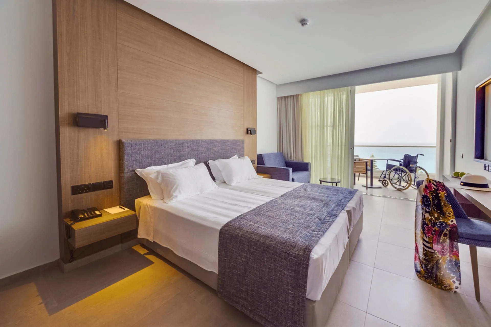 In the vicinity of the sandy beach lies the hotel Cavo Maris Beach Hotel. The city centre is around 1,5 km away. On the beach are beach towels available. The hotel is equipped with a 24h reception, Wi-Fi, internet access, 3 lifts, a hairdresser, a jacuzzi, showers and changing rooms as well as parking spaces. In the outdoor area you will find a garden as well as a pool (open all year). For children there is also a children's pool. Inside the hotel you can use a heated indoor pool. For very young guests, kid`s chairs can be provided. You can store your luggage in the hotel's storage room. There is also a laundry service. If necessary, you can contact the medical centre. The energy supply is 240 Volts. Due to its barrier-free facilities , such as barrier-free entrances and wheelchair-accessible bathrooms, the hotel is also suitable for wheelchair users. Catering As catering services the hotel offers all-inclusive, half board and full board. For the meals, there are a buffet restaurant (Italian dishes) and the cafeteria. For dinner, guests are asked to wear appropriate clothing in the restaurant. Distances