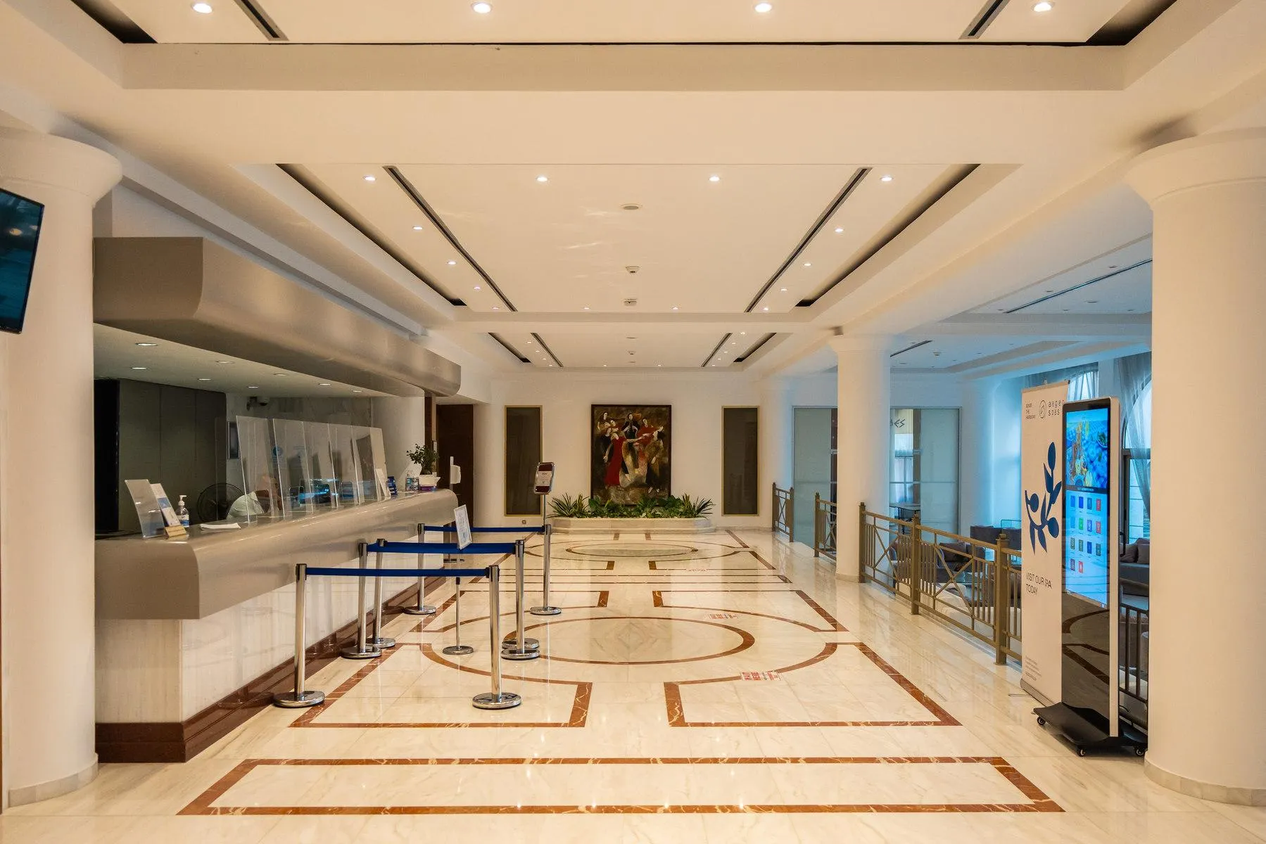 The 5-storey spa hotel consists of a main building and an adjoining building, and has 228 rooms in total. It offers its guests a 24h reception (check-in from 14:00, check-out until 12:00), a lobby with bar, 2 lifts, air conditioning, a safe (for free), coiffeur, a mini market, various other shops, a free parking area and a money changing facility. For the meals, there are three restaurants (air-conditioned). In a total 3 bars, you can relax in good company. WiFi is available for free. For guests dependent on a wheelchair the hotel has a number of wheelchair accessible bathrooms. Room cleaning, ironing service and concierge service are free of charge. Room service, laundry service and medical service are available for a fee. Pool: In the outdoor area of the hotel you will find one fresh water pool with a separate children´s pool. Here, there are sun umbrellas and sun loungers for free available. Refreshing beverages can be consumed directly at the pool bar.