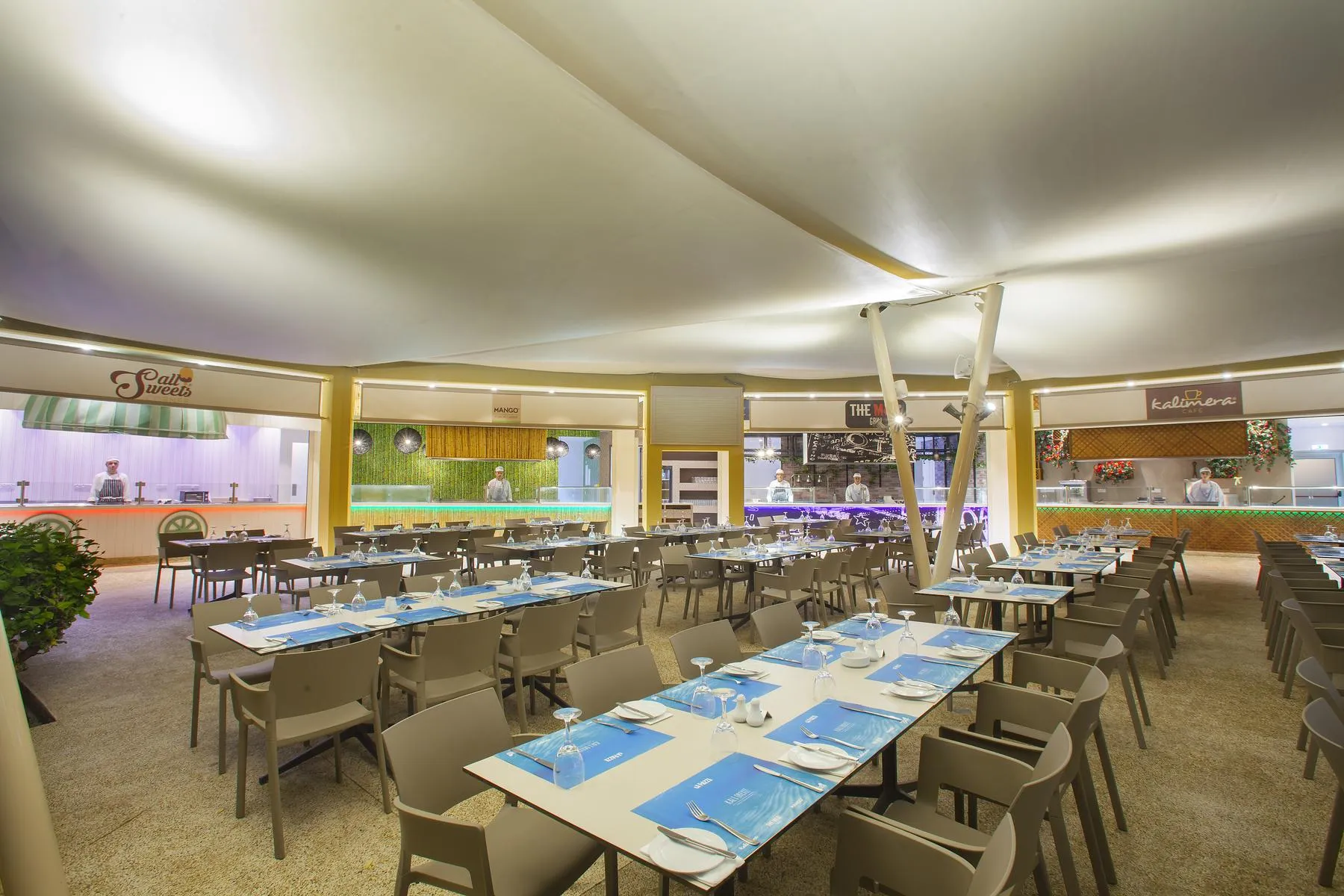 Breakfast (from 07:00 - 10:00) from the buffet. Half board: breakfast as well as lunch or dinner. All inclusive: breakfast, lunch and dinner. Breakfast and lunch and dinner only in selected restaurants or bars. Children`s menus are also available. Soft drinks (10:00 - 00:00), coffee and tea (10:00 - 00:00), cakes and pastries (16:00 - 18:00), small snacks (11:00 - 12:30), beer (10:00 - 00:00), wine (10:00 - 00:00), cocktails (10:00 - 00:00), national alcoholic drinks (10:00 - 00:00), Welcome Drink and free internet.