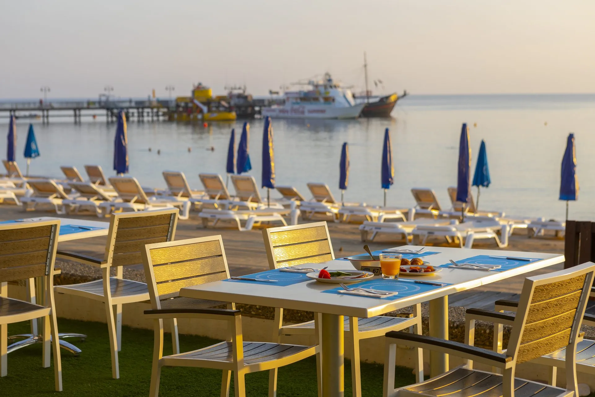 The hotel Vrissaki Beach Hotel is located next to a public sandy beach. The nearest bars and restaurants are located directly next to the building. The old town is around 5 km away. The nearest shops you can reach within around 200 m, a supermarket is just a few metres away from the hotel. The beach is patrolled by a lifeguard and awarded a blue flag. Here, there are sun loungers available. Cold drinks are served at the beach bar. There is also a promenade here where you can go for a stroll. The seasonally air-conditioned, GPS-verified hotel is equipped with a 24h reception (check-in is possible around the clock), a lobby bar, Wi-Fi, internet access, 2 lifts, a hairdresser, a jacuzzi, showers and changing rooms, a first aid kit, parking spaces as well as a TV lounge with satellite TV. In the outdoor area of the property you will find a garden as well as a seasonally heated and supervised pool that is open seasonally, where sun loungers, sun umbrellas and pool towels are available for free. There is also a separate children's pool with a non-swimming area. Inside the hotel you can use a heated indoor pool. You can store your valuables in the safe, and your luggage in the hotel`s storage room. In addition, the hotel Vrissaki Beach Hotel is video-monitored 24h a day. For very young guests, kid`s chairs and highchairs can be provided. There is also a laundry and ironing service. Ironing equipment can also be borrowed at the hotel. If necessary, you can contact the medical centre at any time. The energy supply is 220, 230 and 240 Volts. For conventions and other business meetings, the hotel offers a conference area with a total of 25 seats, a reception, lectern, tables, printer, scanner, internet access as well as a catering service. A photographer can also be ordered from the hotel for business events. If you want to explore the holiday region, you can use the car rental service close to the hotel. For guests on their honeymoon, the hotel has special offers such as a romantically-decorated room, personalised rooms/articles, rooms with a particularly romantic location and view, special honeymoon packages, romantic dishes in the restaurant, champagne, sparkling wine, a present, a basket of fruit or flowers in the room. In your hotel, a lot of focus is placed on sustainability. This includes waste segregation in the rooms, the hotel`s own recycling bins, the provision of soap and shampoo dispensers, organic food and ecological meals and environmentally-friendly cleaning. That is why the hotel Vrissaki Beach Hotel was also awarded a sustainability certificate. The hotel requires that all guests pay a deposit upon arrival. Euro/Master Card and Visa are accepted as means of payment. Due to its barrier-free facilities , such as a sliding door in the entrance area, an automatic hotel door, barrier-free entrances, wheelchair accessible rooms, a wheelchair accessible lift, a handrail in the elevator and wheelchair-accessible bathrooms, the hotel is also suitable for wheelchair users. Catering As catering services the hotel offers all-inclusive, half board, full board and self-catering. Breakfast is offered from the buffet. Lunch and dinner are also served as a set meal, à la carte or from the buffet with starters, salads and desserts (extras on request and at extra cost). Half board includes breakfast and dinner. All Inclusive Light includes coffee & tea, cake & pastries, beer as well as local and international alcoholic beverages. When booking all-inclusive, one welcome drink and one meal in the à la carte restaurant are included. As part of the all-inclusive service, water (24h), international alcoholic beverages (unlimited) as well as international alcoholic beverages (limited) are available at no extra charge. For the meals, there are a buffet restaurant with terrace (Italian, Mediterranean, calorie-reduced, gluten-free and vegetarian dishes) and several bars, the cafeteria as well as the pool bar. The drinks menu of the hotel includes water, soft drinks, coffee and tea, beer and wine. Alcoholic beverages are not served in the hotel. Appropriate clothing is required for lunch and dinner. Distances