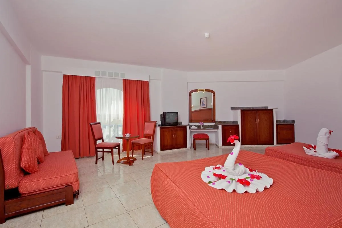 Descriere generală Hotelul Golden Beach Resort Ex. Movie Gate este locat in Hurghada North, la cca. 300 m de o plajă privată cu nisip. Pe plajă sunt disponibile gratuit șezlonguri și umbrele de soare. Centrul turistic al stațiunii se află la aprox. 15 km. Orașul DOWNTOWN este la aprox. 12 km (Cairo cca. 500 km, Luxor cca. 350 km). Puteți face cumpărături în diverse magazine și într-un supermarket aflat la cca. 5 km distanță. Cele mai apropiate baruri și restaurante sunt la cca. 10 km distanță. O discotecă aflată la aprox. 15 km vă invită la dans. Un cinematograf este situat în apropierea hotelului. Următoarele atracții pot fi accesate de la hotel: New Marine (cca. 10 km). Aveți la dispoziție o stație de autobuz (cca. 50 m) și o stație de taxi (direct la hotel) cea ce vă garantează mobilitatea în vacanța dumneavoastră. Pentru îngrijiri medicale în caz de urgență, există un spital la cca. 8 km distanță. Aeroportul (HRG) se află la aprox. 15 km. Un serviciu de transfer (contra cost) face legătura între hotel și aeroport. Un alt aeroport (RMF) este la cca. 230 km. Facilități Resortul, care a fost renovat parțial în 2022, dispune de 3 etaje și peste 425 camere repartizate între o clădire principală și de 3 clădiri secundare. Hotelul are recepție (check-in de la 14:00, check out până la 12:00), lobby cu bar, 2 lifturi, aer condiționat, seif (gratuit), chioșc, minimarket, alte magazine, cinematograf, discotecă (deschis între orele 22:00 - 02:00), parcare (gratuită), sistem securizat de intrare și birou de schimb valutar. Pentru a servi masa aveți la dispoziție 6 restaurante cu aer condiționat și un snackbar. Accesul la internet WiFi este disponibil gratuit pentru oaspeții hotelului. Pentru evenimente de afaceri, hotelul oferă o zonă de conferințe cu un total de 70 de locuri și cu acces la internet. Pentru oaspeții cu dizabilități fizice, unitatea de cazare oferă un lift accesibil pentru scaune cu rotile, băi parțial accesibile pentru scaune cu rotile și acces fără bariere. Serviciul de menaj este gratuit. Room service, spălătorie, călcat și serviciul medical sunt disponibile la un cost suplimentar. Piscină În grădinile acestui hotelul decorat în stil mediteranean cu parc acvatic și tobogan de apă există 6 piscine cu apă dulce precum și o piscină separată pentru copii (deschise din ianuarie până în decembrie). Acolo sunt disponibile gratuit șezlonguri și umbrele de soare. La barul de la piscină sunt disponibile băuturi răcoritoare (deschis între orele 10:00 - 17:00). Catering Mic dejun (între orele 07:00 - 10:00) bufet suedez. All Inclusive: micul dejun, prânzul și cina. Micul dejun, prânzul și cina pot fi servite numai în anumite restaurante. Apă și cocktailuri. Mic dejun târziu (între orele 10:00 - 12:30), băuturi răcoritoare (10:00 - 07:00), cafea și ceai (07:00 - 07:00), aperitive (15:30 - 17:00), bere (10:00 - 00:00), băuturi alcoolice naționale (10:00 - 00:00), gustări la miezul nopții (10:00 - 07:00), 1 masă în restaurantul à la carte și minibar gratuit în cameră (limitat). Este posibil check-in mai devreme și check-out mai târziu (în funcție de disponibilitate). Sport/Leisure Este disponibil: Tenis (contra cost, la cca. 50 m distanță), fitness, yoga, tenis de masă (gratuit), biliard (contra cost), fotbal, minigolf, darts (gratuit), volei pe plajă și aerobic. La cca. 300 m de hotel, sunt oferite sporturi nautice precum plimbări cu barca cu motor (unele de către furnizori locali). La cca. 15 km de hotel este un teren de golf. Oferte de wellness: Zonă de spa, saună, jacuzzi, baie turcească, hamam și masaje contra cost. Divertisment pentru adulți: program de animație. Loc de joacă pentru copii. Îngrijirea copiilor: program de animație pentru copii (de la 4 - 12 ani) și mini club. Sală de jocuri. Informații suplimentare Pentru anumite facilități sau activități se pot aplica taxe suplimentare. Unele servicii depind de anotimp și de condițiile climatice locale. Limbi de serviciu: engleză, germană, franceză, rusă și arabă. Carduri de credit: Visa și Euro/MasterCard. Doppel Premium Familienzimmer: Dotate cu pat king-size, pat suplimentar, pat pentru bebeluși (gratuit), pardoseală cu gresie, încălzire reglabilă individual, acces la internet (contra cost) și TV prin satelit precum și aer condiționat reglabil individual. Standard Familienzimmer: Cameră cu pat king-size, pat suplimentar, pat pentru bebeluși (gratuit), pardoseală cu gresie, încălzire reglabilă individual, acces la internet (contra cost) și TV prin satelit precum și aer condiționat reglabil individual. 2 Schlafzimmer Standard Familienzimmer: Dotate cu pat king-size sau pat twin, pat suplimentar, pat pentru bebeluși (gratuit), pardoseală cu gresie, încălzire reglabilă individual, ceainic (gratuit), acces la internet (contra cost), seif (gratuit) și TV prin satelit precum și aer condiționat reglabil individual. Baie cu duș. Prosoapele și lenjeria de pat se schimbă de 3 ori pe săptămână. Dimensiune: 37 m². 2 Schlafzimmer Standard Familienzimmer (Garten-Poolblick): Dotate cu pat king-size, pat suplimentar, pat pentru bebeluși (gratuit), pardoseală cu gresie, încălzire reglabilă individual, acces la internet (contra cost) și TV prin satelit precum și aer condiționat reglabil individual. Doppel Zimmer (Economy): Dotate cu pat king-size, pat dublu sau pat twin, pat suplimentar, pat pentru bebeluși (gratuit), pardoseală cu gresie, încălzire reglabilă individual, ceainic (gratuit), acces la internet (contra cost), seif (gratuit) și TV prin satelit precum și aer condiționat reglabil individual. Baie cu duș. Prosoapele și lenjeria de pat se schimbă de 3 ori pe săptămână. Dimensiune: 16 - 24 m². Einzelbelegung Zimmer (Economy): Cameră cu pat king-size, pat dublu sau pat twin, pat suplimentar, pat pentru bebeluși (gratuit), p