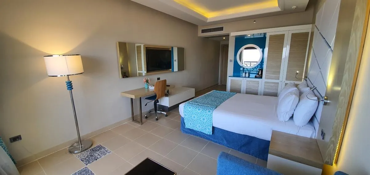Descriere generală La doar câțiva pași de o plajă privată cu nisip se găsește hotelul Gravity Hotel Aqua Park Hurghada ex Samra. Pe plajă sunt disponibile gratuit șezlonguri și umbrele de soare. Centrul turistic al stațiunii se află la aprox. 1 km. Orașul Cairo este la aprox. 500 km. Diverse magazine se află la aprox. 8 km de hotel, și chiar lângă hotel este un supermarket. Cele mai apropiate baruri și restaurante sunt la cca. 1 km distanță. De asemenea, la cca. 8 km de hotel este un cinematograf. Pentru îngrijiri medicale în caz de urgență, există un spital la cca. 1 km distanță. Aeroportul (HRG) se află la aprox. 6 km. Un serviciu de transfer (contra cost) face legătura între hotel și aeroport. Un alt aeroport (RMF) este la cca. 215 km. Facilități Hotelul, care a fost renovat în 2024, dispune de 6 etaje și peste 350 camere. Hotelul are recepție deschisă 24h (check-in de la 14:00, check out până la 12:00), lobby cu bar, un total de 6 lifturi, aer condiționat, seif (gratuit), minimarket, alte magazine, discotecă (deschis între orele 23:00 - 02:00), parcare (gratuită) și birou de schimb valutar. Pentru a servi masa vă stau la dispoziție 4 restaurante și un snackbar. Accesul la internet WiFi este disponibil gratuit pentru oaspeții hotelului. În plus, hotelul oferă o zonă de conferințe. Pentru oaspeții cu dizabilități fizice, unitatea de cazare oferă un lift accesibil pentru scaune cu rotile, băi parțial accesibile pentru scaune cu rotile și acces fără bariere. Serviciul de menaj și călcat sunt gratuite. Room service, spălătorie și serviciul medical sunt disponibile la un cost suplimentar. Piscină Zona exterioară a hotelului cu parc acvatic include 5 piscine cu apă dulce precum și o piscină separată pentru copii. La piscine sunt disponibile gratuit șezlonguri și umbrele de soare. Un bar lângă piscină oferă oaspeților băuturi răcoritoare (deschis între orele 10:00 - 17:00). Catering Mic dejun (între orele 07:00 - 10:00) bufet suedez. All Inclusive: micul dejun, prânzul și cina. Micul dejun și prânzul pot fi servite numai în anumite restaurante. Sunt disponibile și meniuri pentru copii. Bere, vin și băuturi alcoolice naționale. Băutură de bun venit, băuturi răcoritoare (00:00 - 23:59), aperitive (11:00 - 17:00), gustări la miezul nopții (22:00 - 00:00), 1 masă în restaurantul à la carte, internet gratuit, minibar gratuit în cameră (limitat) și utilizarea gratuită a seifului (în baza unei garanții). Este posibil check-in mai devreme și check-out mai târziu (în funcție de disponibilitate). Sport/Leisure Este disponibil: Biliard (gratuit), fitness, fotbal, aerobic, darts (gratuit), tenis de masă (gratuit), Pilates, volei pe plajă și yoga. La cca. 50 m de hotel, sunt oferite sporturi nautice (unele de către furnizori locali). Oferte de wellness: Zonă de spa, saună, jacuzzi și masaje contra cost. Baie turcească și hamam posibil contra cost. Divertisment pentru adulți: program de animație cu spectacole de seară. Teren de joacă. Îngrijirea copiilor: program de animație pentru copii (de la 4 - 12 ani), mini club pentru copii (de la 4 - 12 ani) și babysitting (contra cost). Informații suplimentare Pentru anumite facilități sau activități se pot aplica taxe suplimentare. Unele servicii depind de anotimp și de condițiile climatice locale. Limbi de serviciu: engleză, germană, franceză, rusă și arabă. Carduri de credit: Visa, Euro/MasterCard și American Express. Familienzimmer (Gartenblick): Camerele moderne cu living sunt echipate cu pat king-size sau pat twin, pat suplimentar, pat pentru bebeluși (gratuit), pardoseală cu gresie, încălzire reglabilă individual, ceainic (gratuit), minibar (gratuit), balcon sau terasă, acces la internet (gratuit), seif (gratuit) și TV cu ecran plat precum și aer condiționat reglabil individual. Baie cu duș. Prosoapele se schimbă zilnic, lenjeria de pat de 4 ori pe săptămână. Dimensiune: 45 - 90 m². Familienzimmer (Meerblick): Camerele moderne cu living sunt echipate cu pat king-size sau pat twin, pat suplimentar, pat pentru bebeluși (gratuit), pardoseală cu gresie, încălzire reglabilă individual, ceainic (gratuit), minibar (gratuit), balcon sau terasă, acces la internet (gratuit), seif (gratuit) și TV cu ecran plat precum și aer condiționat reglabil individual. Baie cu duș. Prosoapele se schimbă zilnic, lenjeria de pat de 4 ori pe săptămână. Dimensiune: 45 - 90 m². Doppel Deluxe Zimmer (Meerblick): Camerele moderne sunt echipate cu pat king-size sau pat twin, pat suplimentar, pat pentru bebeluși (gratuit), pardoseală cu gresie, încălzire reglabilă individual, ceainic (gratuit), minibar (gratuit), balcon sau terasă, acces la internet (gratuit), seif (gratuit) și TV cu ecran plat precum și aer condiționat reglabil individual. Baie cu duș. Prosoapele se schimbă zilnic, lenjeria de pat de 4 ori pe săptămână. Dimensiune: 45 - 60 m². Einzelbelegung Deluxe Zimmer (Meerblick): Camerele moderne sunt echipate cu pat king-size sau pat twin, pat suplimentar, pat pentru bebeluși (gratuit), pardoseală cu gresie, încălzire reglabilă individual, ceainic (gratuit), minibar (gratuit), balcon sau terasă, acces la internet (gratuit), seif (gratuit) și TV cu ecran plat precum și aer condiționat reglabil individual. Baie cu duș. Prosoapele se schimbă zilnic, lenjeria de pat de 4 ori pe săptămână. Doppel Superior Zimmer (Gartenblick): Camerele moderne sunt echipate cu pat king-size sau pat twin, pat suplimentar, pat pentru bebeluși (gratuit), pardoseală cu gresie, încălzire reglabilă individual, ceainic (gratuit), minibar (gratuit), balcon sau terasă, acces la internet (gratuit), seif (gratuit) și TV cu ecran plat precum și aer condiționat reglabil individual. Baie cu duș. Prosoapele se schimbă zilnic, lenjeria de pat de 4 ori pe săptămână. Dimensiune: 45 m². Doppel Superior Zim
