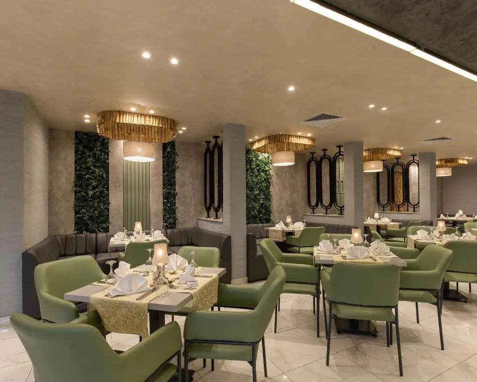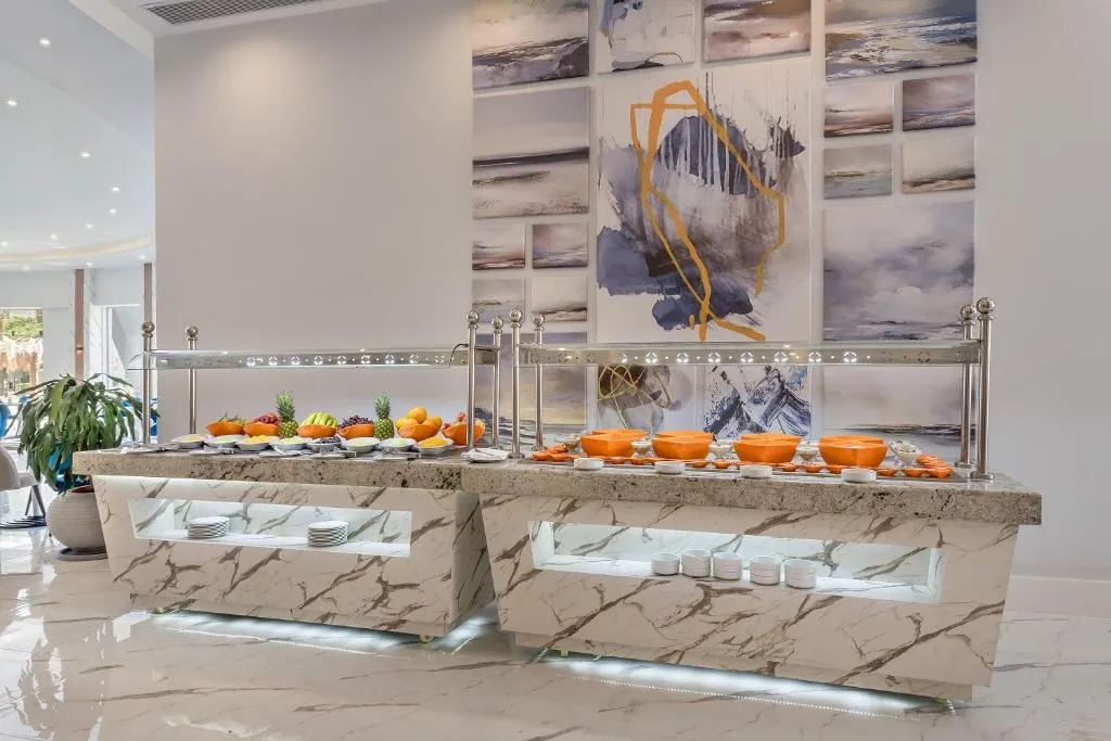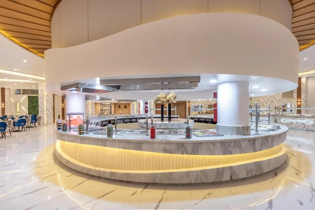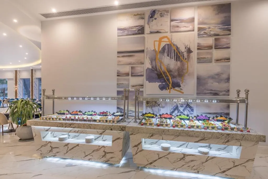Restaurant principal, tip bufet- “Lotus”(cu secţiune pentru copii), restaurant cu specific mediteranean- “Al Dente”, “Podium Restaurant”, restaurant á la carte cu specific egiptean şi oriental- “Marhaba”, Pool Bar, Beach Bar, Vienna Bar, Aqua Lounge.