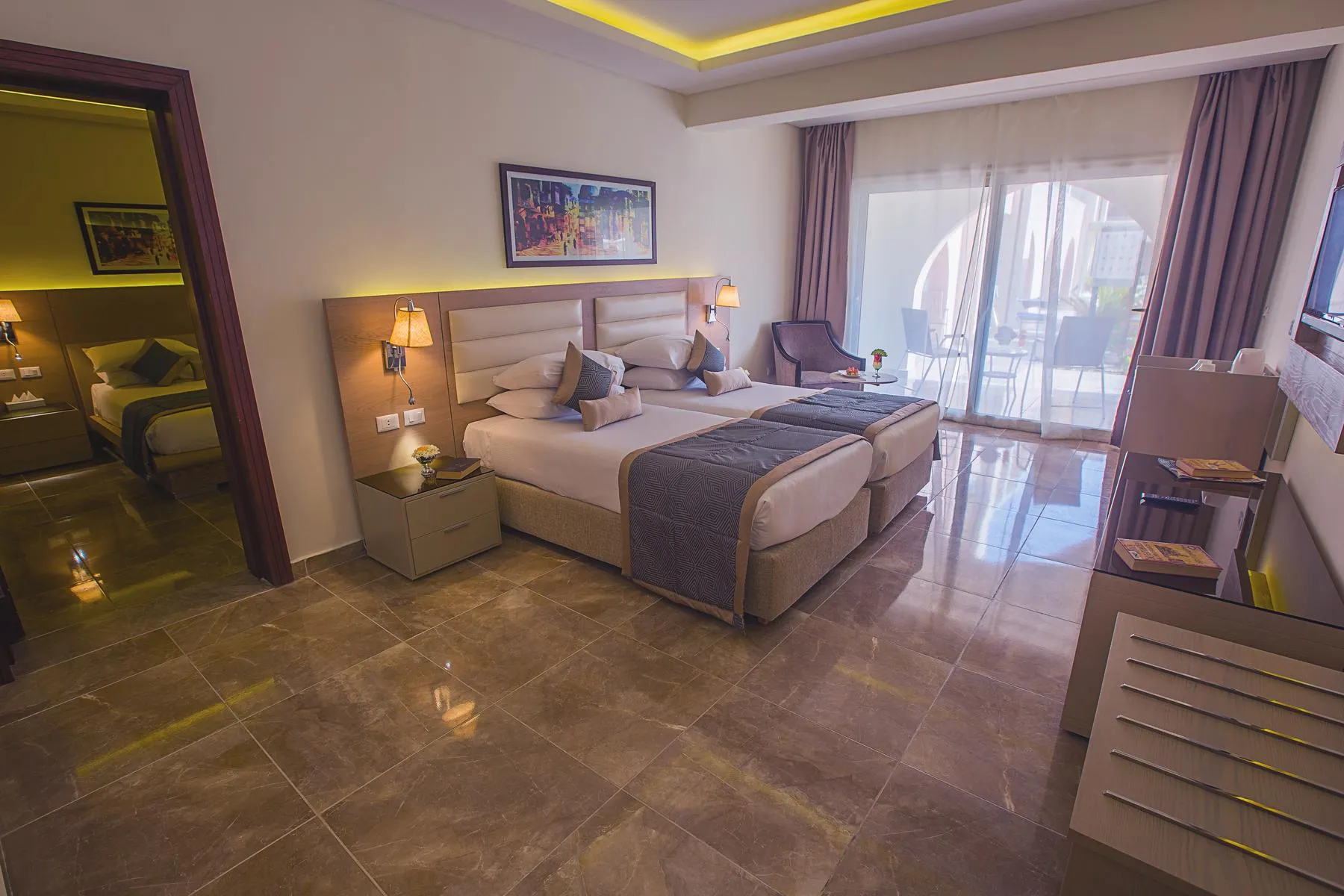Aqua Park (approx. 1 km away) and Hurghada New Marina (approx. 12 km away). For mobility during your holiday, there are a taxi rank as well as a bus stop in a distance of around 50 m. For medical treatment in emergencies there is a hospital around 1 km away. The airport (HRG) is approx. 6 km away. The hotel and airport are linked by a chargeable shuttle. Another airport (RMF) is located approx. 215 km away.