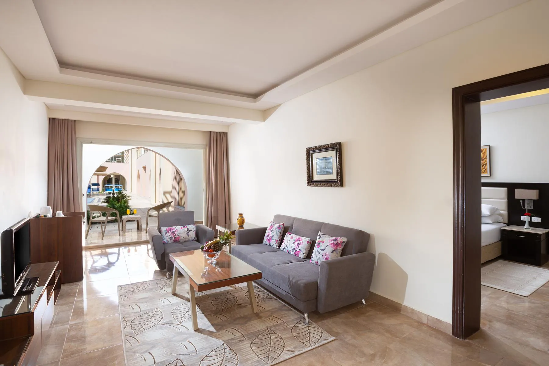 The hotel Alf Leila Wa Leila by Neverland is located approx. 900 m from the Dana Beachl, a private sandy beach, linked by a free shuttle service. At the beach, there are sun umbrellas and sun loungers free of charge. The town Downtown is around 17 km away (El Gouna around 40 km, Luxor around 250 km). A supermarket and other shopping facilities can be reached after 500 m. It is 17 km from the hotel to the nearest bars and restaurants. Also the nearest disco is around 17 km away.