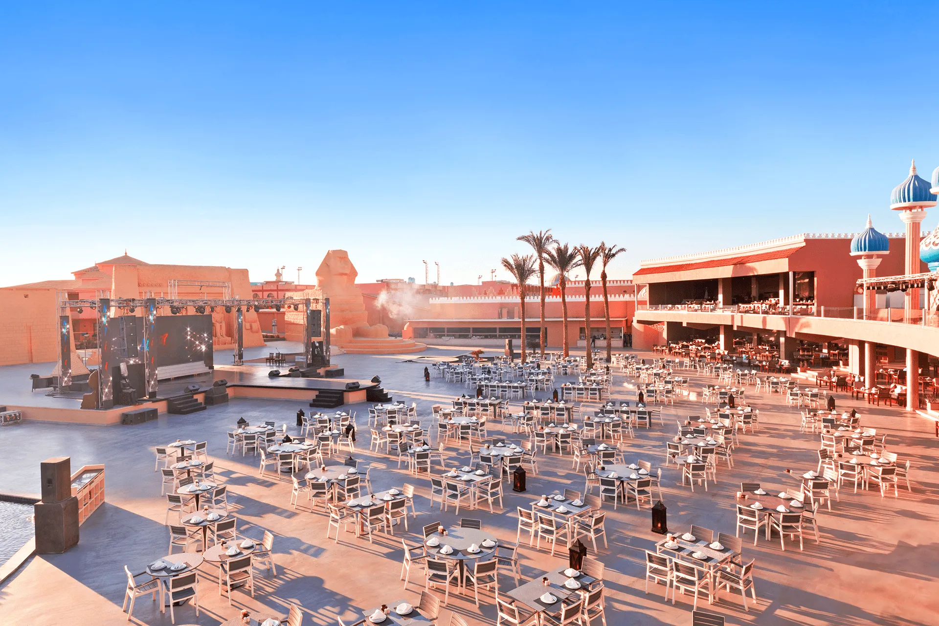 About 900 m from the hotel`s own beach lies the 4 star hotel Pickalbatros Alf Leila Wa Leila Resort - Neverland Hurghada****. The old town is around 20 km away. There is a shuttle between the hotel and the airport (for a fee). The beach is patrolled by a lifeguard. Here, there are sun loungers, sun umbrellas and beach towels available. At the beach there is a bar serving refreshing drinks. To reach the beach a shuttle is provided. The hotel is equipped with a 24h reception (check-in is possible around the clock), a lobby bar, a supermarket and other shops, a boutique, cash machine, a hairdresser, a jacuzzi, a first aid kit as well as parking spaces. In the outdoor area you will find a seasonally heated pool, where sun loungers and pool towels are available for free. Outside there is a separate children's pool with 5 water slides. Furthermore, you can relax outdoors on the terrace. Your valuables can be stored in the hotel safe. For your entertainment, the hotel offers a theatre and a disco. For very young guests, kid`s chairs can be provided. For the smallest children prams can be rented in the hotel. There is also a laundry service available at an additional cost to customers. For your comfort, in addition to the concierge service the hotel page will ensure you are looked after. If necessary, you can contact the medical centre at any time (for a fee). Guests at the accommodation can get a wake-up call from the hotel personnel. In your hotel, a lot of focus is placed on sustainability. This includes among others a central room air-conditioning. Due to its barrier-free facilities , such as barrier-free entrances and wheelchair accessible rooms, the hotel is also suitable for wheelchair users. Catering As catering services the hotel offers all-inclusive and self-catering. Breakfast is offered from the buffet. Lunch and dinner are also served from the buffet. As part of the all-inclusive service, local alcoholic beverages (24h) are available around the clock and at no extra charge. For the meals, there are a buffet restaurant with terrace (Italian, calorie-reduced and vegetarian dishes) and several bars, a 24h snackbar as well as the pool bar. For dinner, guests are asked to wear appropriate clothing in the restaurant. Distances