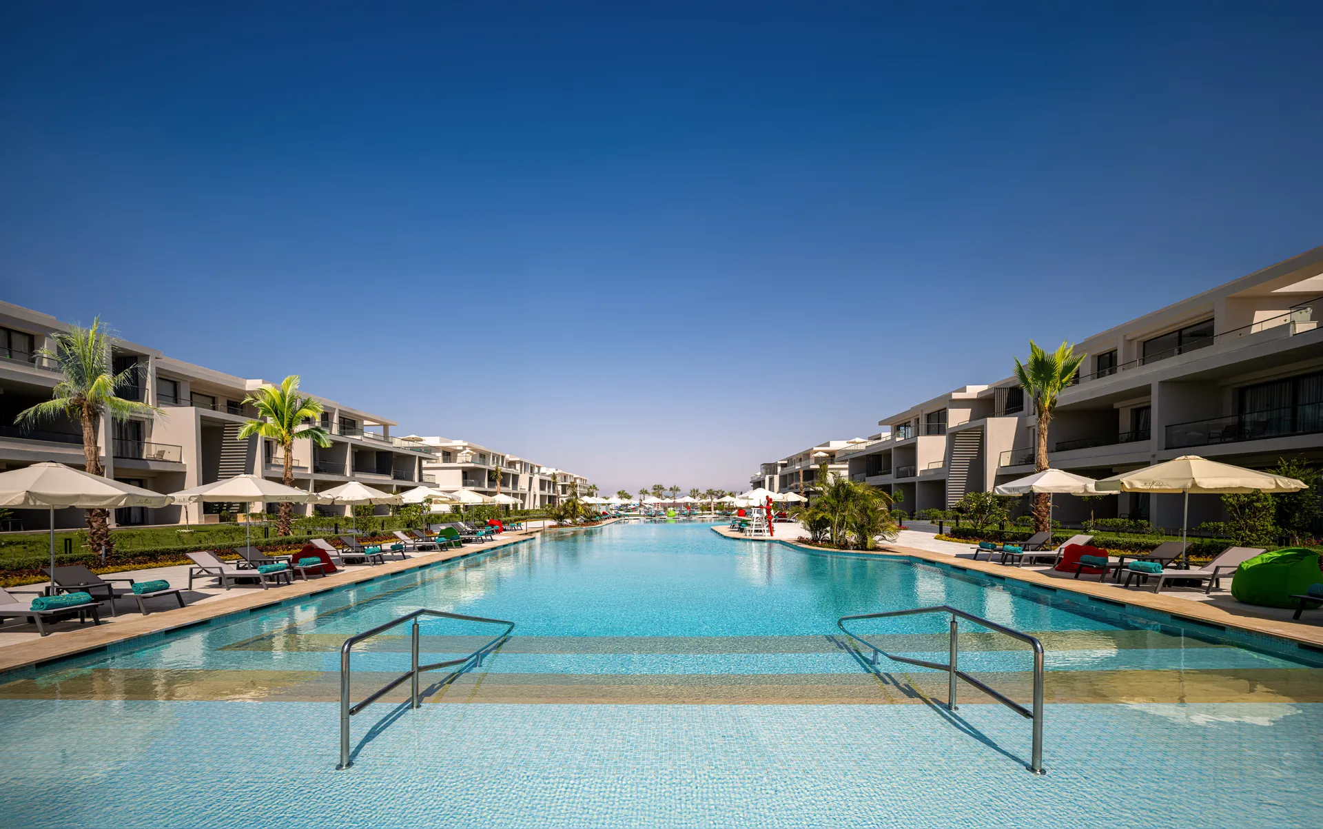 Sports & Leisure To keep your fitness up on holiday, there is a gym for guests to use. In the surrounding you can also take advantage of a range of water sports, including bananaboat riding , catamaran sailing and water aerobics. In addition, there is an all-purpose sports field in the surroundings of the hotel. During your holiday you can also take part in aerobics courses, in Zumba courses and in yoga courses. There is also the option to play badminton. With beach volleyball, darts and volleyball various other sports offer a lot of variety on holiday. In addition to 2 nearby tennis courts (hard court) there is also a tennis school and a tennis rental. Also boccia is offered as a further leisure activity. Furthermore, various water sports such as windsurfing and diving are offered in the area. For snorkelers equipment is provided at a diving rental shop. Beginners as well as advanced divers can improve their skills under water with an instructor at a diving school. Kiting is also possible in the surroundings of the hotel. A sauna awaits you for relaxation. The hotel also offers massages (extra fee) and beauty treatments (extra fee). Let yourself be pampered in the Hamam (extra fee) and find peace and quiet in the relaxation room. Spend some healthy and relaxing hours with heat therapy as well as hot stone therapy. Infants can be looked after in the hotel`s own baby club. For older children the care takes place in the children`s club. Junior hotel guests can also let off steam in the mini disco. In terms of adult entertainment, evening shows and live music are presented and there is a games room available to use. Some of the sports are already included in the price. Additional information The 4-storey accommodation, newly built in 2021, has a total of 410 rooms. Of these, 4 rooms have disabled access. Here only guests from the age of 0 years are accepted. The hotel staff speak English, German, French, Russian, Arabic, Chinese and Turkish.