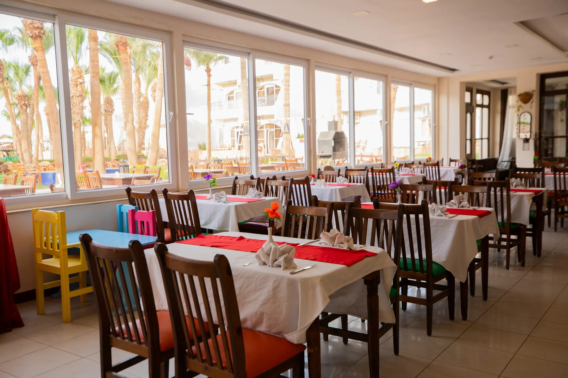 The hotel Empire Beach Aqua Park is situated about 12 km from the airport. There is a shuttle between the hotel and the airport (for a fee). Cold drinks are served at the beach bar. The hotel has a 24h reception, a lobby bar as well as a hairdresser. In the outdoor area you will find a pool (open all year), where sun loungers, sun umbrellas and pool towels are available for free. For your entertainment, the hotel offers a library/reading room. Kid`s chairs are available. There is also a laundry service available at an additional cost to customers. Catering As catering services the hotel offers all-inclusive. Breakfast is offered from the buffet. Dinner is also served as a buffet. For the meals, there are a restaurant (Italian dishes) and several bars. Sports & Leisure During your holiday you can take part in aerobics courses. Also beach volleyball is offered at the hotel. A sauna (extra fee) awaits you in the wellness area. The hotel also offers massages (extra fee). Infants can be looked after in the hotel`s own baby club. Additional information The 3-storey hotel has a total of 163 rooms.