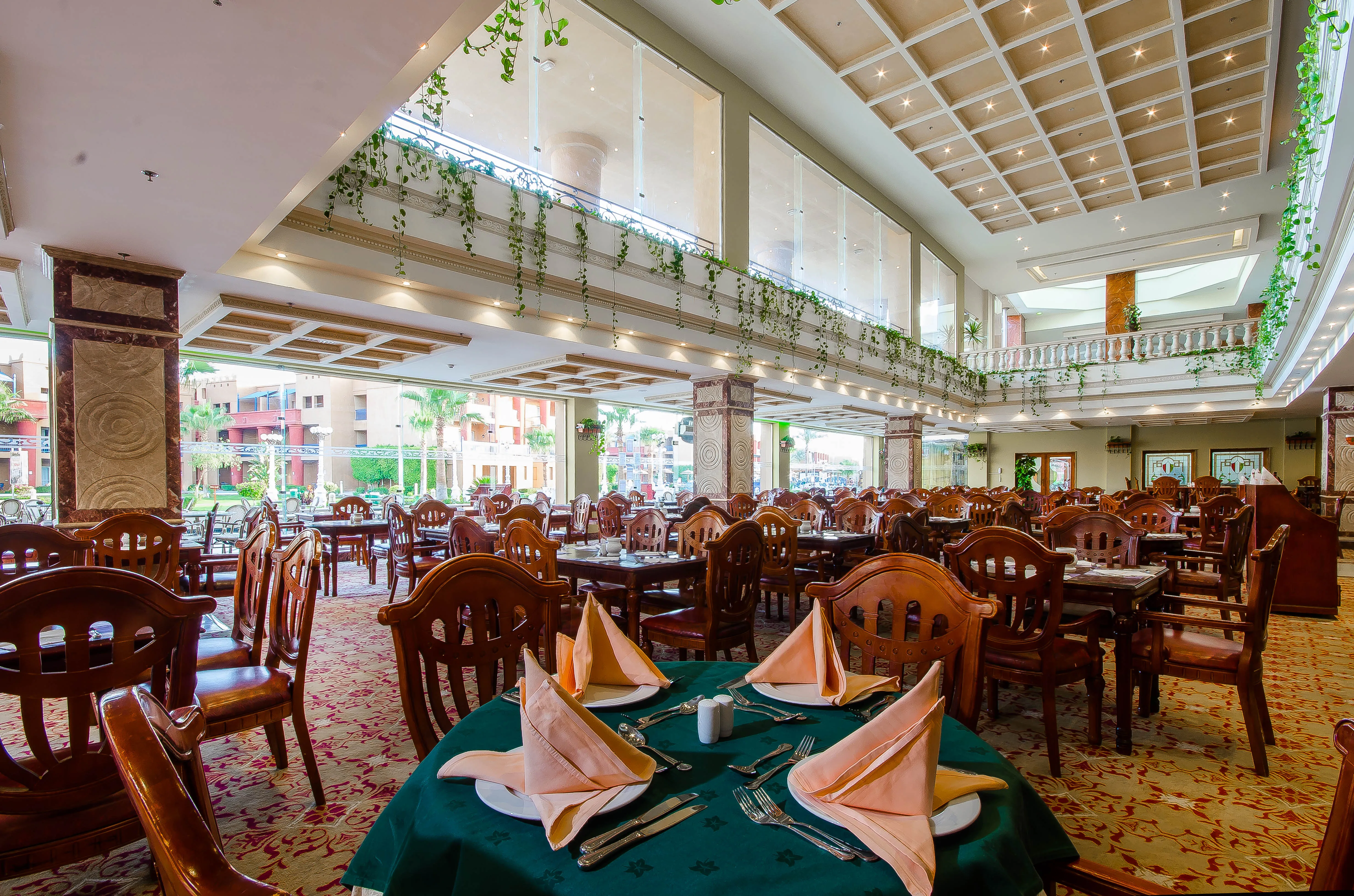 The spa complex has the biggest aqua park in Hurghada, and with its numerous water slides, wave pool and rafting river, it is an endless adventure of pleasure. The crystal-clear outdoor swimming pools have a children's swimming area and a poolside snack bar where guests can relax with a tropical drink on the sun loungers or parasols provided. Sun loungers and parasols are also available on the beautiful private sandy beach. Guests may also take part in an aqua fit or aerobics session, enjoy a vigorous work-out in the state-of-the-art gym, relax in the sauna, or choose from a selection of spa and massage treatments. A range of water sports, such as water skiing, jet skiing, diving, surfing, windsurfing, motor boating, banana boating and sailing, are available on the beach, and guests may also play tennis, table tennis, pool/snooker, basketball, handball, volleyball or beach volleyball. Entertainment programmes for both adults and children are organised by the hotel and guests may wish to explore the surrounding area on horseback. Location:630 Total number of rooms; 3 Number of floors (main building); 3 Annexe (s); 3 Number of floors (annexe) Hotel type:hotel Methods of payment:Diners Club; MasterCard; Visa; Visa Electrón Distances (in meters):City centre (15000) Facilities:Wheelchair-accessible; Car park; 24-hour reception; Check-in hour; Check-out hour; Mobile phone coverage; Wired Internet (Extra Fee); Wi-fi; Room service; Laundry service; Medical service; Air conditioning in public areas; Hotel safe; Currency exchange facilities; Lift access; Supermarket; Shop; Garden; Gym Catering:Bar; Restaurant; Poolside snack bar Business:Conference room Entertainment:Sun loungers; Children playground; Kids’ club; Entertainment programme for adults; Entertainment programme for children; Casino; Theatre / auditorium; Nightclub Health:Sauna; Massage; Spa treatments; Hairdressing salon