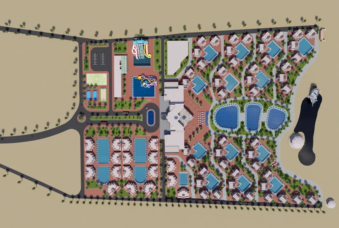 Hotelul detine o plaja privata cu nisip, ponton de 365 m, 15 piscine (1 încălzită iarna) + 6 piscine pentru copii & 1 jacuzzi, laguna cu apa sarata, Aqua Park pentru adulți (6 tobogane). Umbrelutele si sezlongurile sunt gratuite atat la piscina cat si la plaja.