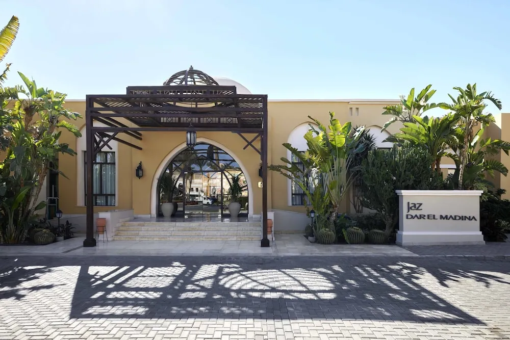 About 500 m from a beach lies the hotel Jaz Dar El Madina. There is a shuttle between the hotel and the airport (for a fee). On the beach are cushions, sun umbrellas and beach towels available. Cold drinks are served at the beach bar. The hotel has a 24h reception, a lobby bar, Wi-Fi (for a fee), a supermarket, a hairdresser, a jacuzzi as well as parking spaces. In the outdoor area of the property you will find a heated pool (open all year), where sun loungers, sun umbrellas and pool towels are available for free. There is also a children's pool. For your entertainment, the hotel offers a theatre. For the young hotel guests there is a playground. To clean your clothes there is a laundry service (extra fee). If necessary, you can contact the medical centre (for a fee). The energy supply is 220 Volts. American Express is accepted as means of payment. Catering As catering services the hotel offers all-inclusive. Breakfast is offered from the buffet. Dinner is also served as a buffet. All Inclusive Light includes snacks. For the meals, there are a restaurant (Italian, calorie-reduced and vegetarian dishes) and the pool bar. The drinks menu of the hotel includes water and coffee and tea. Distances