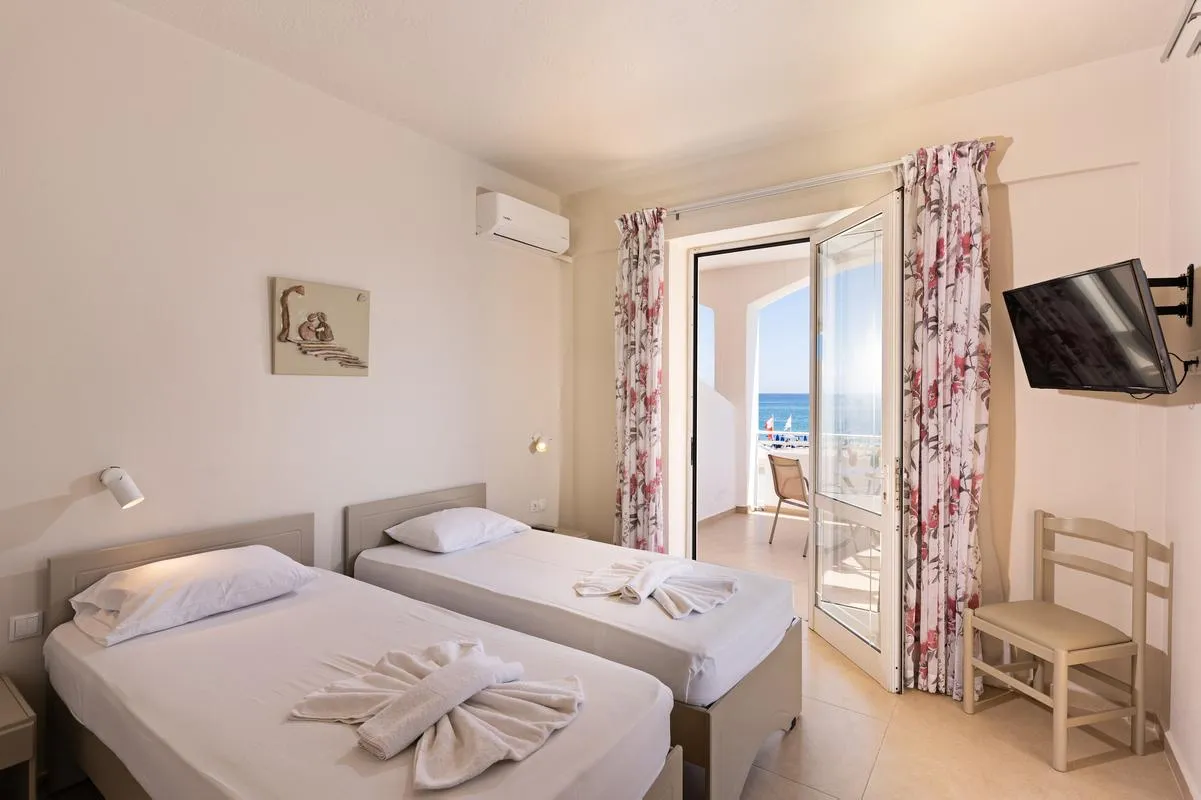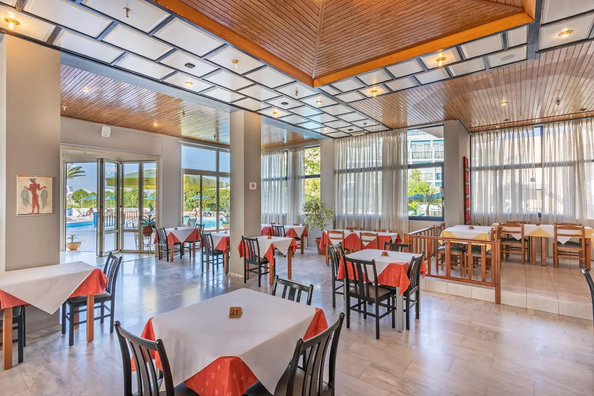 The one-storey beach hotel has 113 rooms, and spread over one main building and 3 adjoining buildings. The rooms were last renovated in 2023. It offers its guests a reception (check-in from 15:00, check-out until 11:00), a lobby, air conditioning, a safe (for a fee), a mini market and a free parking area. For the meals, there is a restaurant (air-conditioned) and a snack bar. You can relax in good company in the hotel bar. WiFi is available for free. Room cleaning is free of charge. Laundry / ironing service and medical service are available for a fee. Pool: In the outdoor area of the mediterranean-style hotel you will find one fresh water pool with a separate children´s pool. Here, there are sun umbrellas and sun loungers for free available. At the pool bar you can get refreshing beverages.