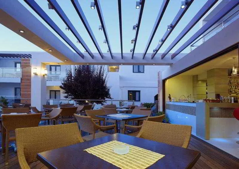 This hotel is located 400 m from a cosmopolitan beach resort with the endless sandy beach, the numerous restaurants and the intense nightlife. Links to the public transport network are around 300 m from the hotel. It is also about 9 km from the town of Chania and some 26 km from Chania International Airport. The beautiful gardens in the exterior part of the block offer a serene and relaxing atmosphere. Those arriving by car may take advantage of the parking. The tasteful rooms and flats are roomy and perfectly equipped to offer relaxation. They are decorated in soft summer colours that emit tranquillity. They are spacious, tasteful and arranged with style. The rooms are equipped and furnished to a high standard. Location:2015 Year of most recent renovation; 36 Total number of rooms; 2 Number of floors (main building); 5 Annexe (s); 3 Number of floors (annexe); 15 Double rooms; 1 Suites; 20 Apartments; 15 Studios Hotel type:hotel Methods of payment:MasterCard; Visa; Maestro; Visa Electrón Distances (in meters):City centre (300); Bus/Train station (9000); Nearest Bus / Metro Stop (300); Airport (25000); Harbour (20000); Beach (350); Entertainment Area (350) Facilities:Small pets allowed (under 5 kg) (Extra Fee); Wheelchair-accessible; Car park (Extra Fee); Key Collection; 24-hour reception; Check-in hour; Check-out hour; Wired Internet (Extra Fee); Wi-fi (Extra Fee); Car hire (Extra Fee); Airport Shuttle; Room service (Extra Fee); Laundry service; Launderette (Extra Fee); Medical service (Extra Fee); Bicycle hire service; Babysitting service (Extra Fee); Multilingual staff; 24-hour security (Extra Fee); Air conditioning in public areas; Fireplace (Extra Fee); Smoke detector; Hotel safe (Extra Fee); Currency exchange facilities; Lift access (Extra Fee); Newspaper stand; Supermarket; Shop (Extra Fee); Garden; Terrace; Bicycle storage; Concierge; Luggage room; Clothes dryer; BBQ facilities; Private beach area; Library; Towels and bed linen (Extra Fee) Catering:Café; Bar; Restaurant; Non-smoking area; Smoking area (Extra Fee); Highchairs; Poolside snack bar; Air conditioning in Restaurant Entertainment:1 Outdoor freshwater pool; 1 Children’s swimming area; Sun loungers; Parasols; Children playground; Kids’ club (Extra Fee); Casino (Extra Fee); TV lounge; Game room; Nightclub (Extra Fee) Health:Sauna (Extra Fee); Hot tub (Extra Fee); Solarium (Extra Fee); Massage (Extra Fee); Spa centre (Extra Fee) Green Programmes - Worldwide:Green Key (FEE)