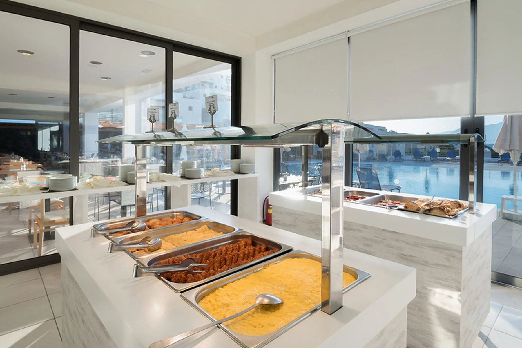 The 2-storey hotel has 149 rooms, and spread over one main building and 7 adjoining buildings. It is equipped with a reception (check-in from 14:00, check-out until 12:00), a lobby with bar, an air conditioning, a safe (for a fee), a mini market as well as a parking area (for free). For the meals, there are two restaurants (air-conditioned) and a snack bar (open from 10:00 - 18:00). You will be warmly welcomed in both the hotel’s bars. WiFi is available for free. Room cleaning is free of charge. Room service, laundry / ironing service and medical service are available for a fee. For the concierge service the hotel charges a fee (where applicable). Pool: In the outdoor area of the hotel you will find 3 fresh water pools with a separate children´s pool. Here, there are sun loungers and sun umbrellas for free available. Refreshing beverages can be consumed directly at the pool bar (open from 10:00 - 18:00).