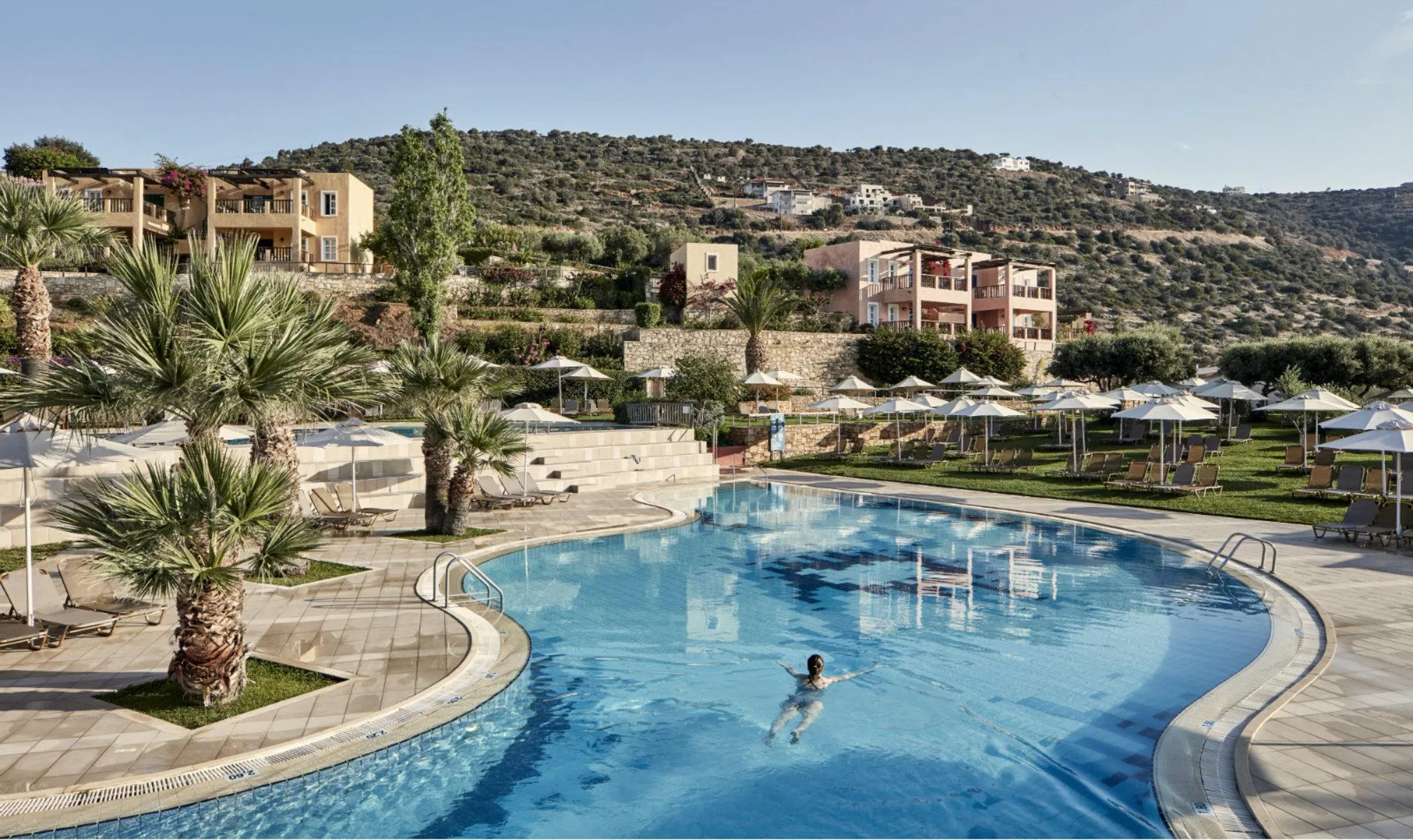 The hotel Candia Park Village lies approx. 50 m from a sandy/shingle beach. At the beach are sun loungers and sun umbrellas free of charge. The nearest town is Agios Nikolaos (Elounda around 8 km, Heraklion around 65 km). In the vicinity of the hotel are a number of shopping facilities and a supermarket. In the evening, you can go dancing in a nightclub in the hotel’s surroundings.
