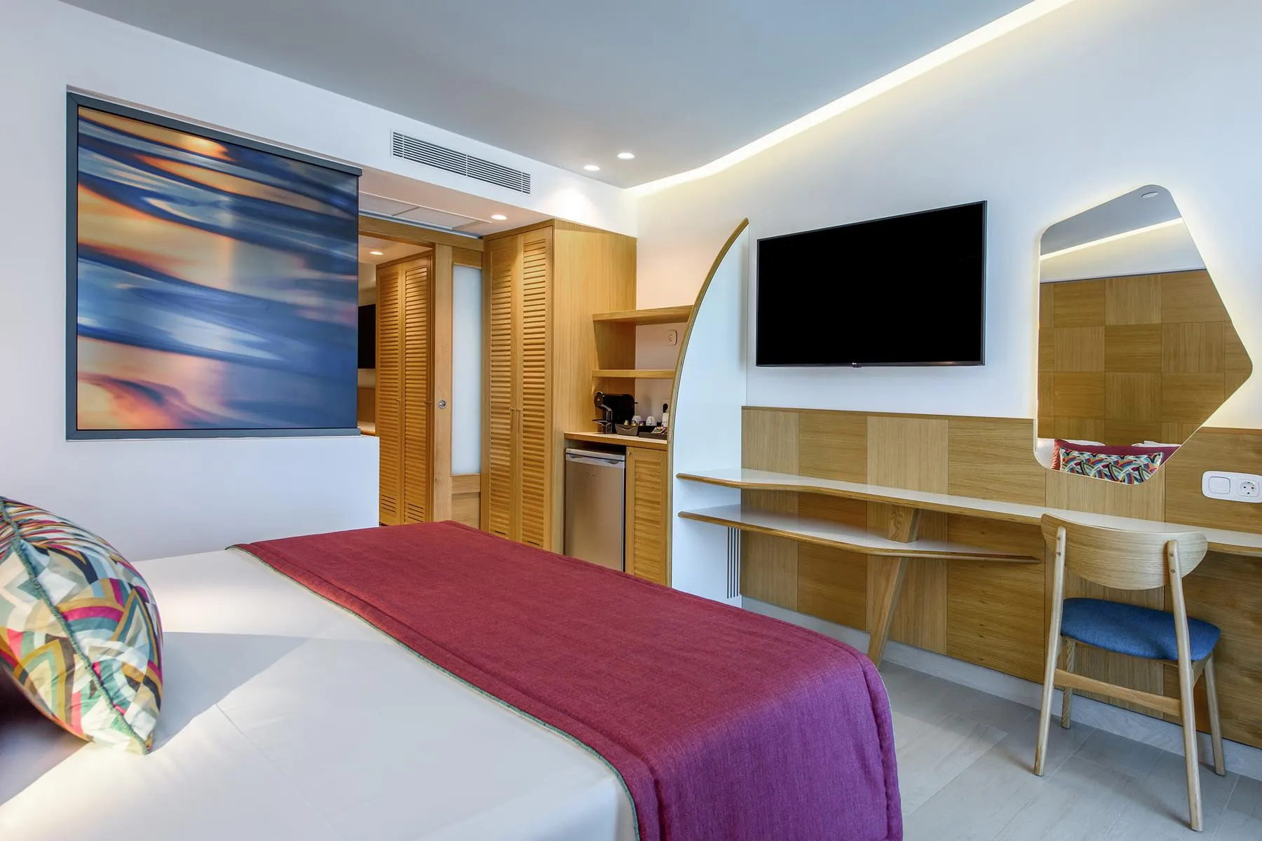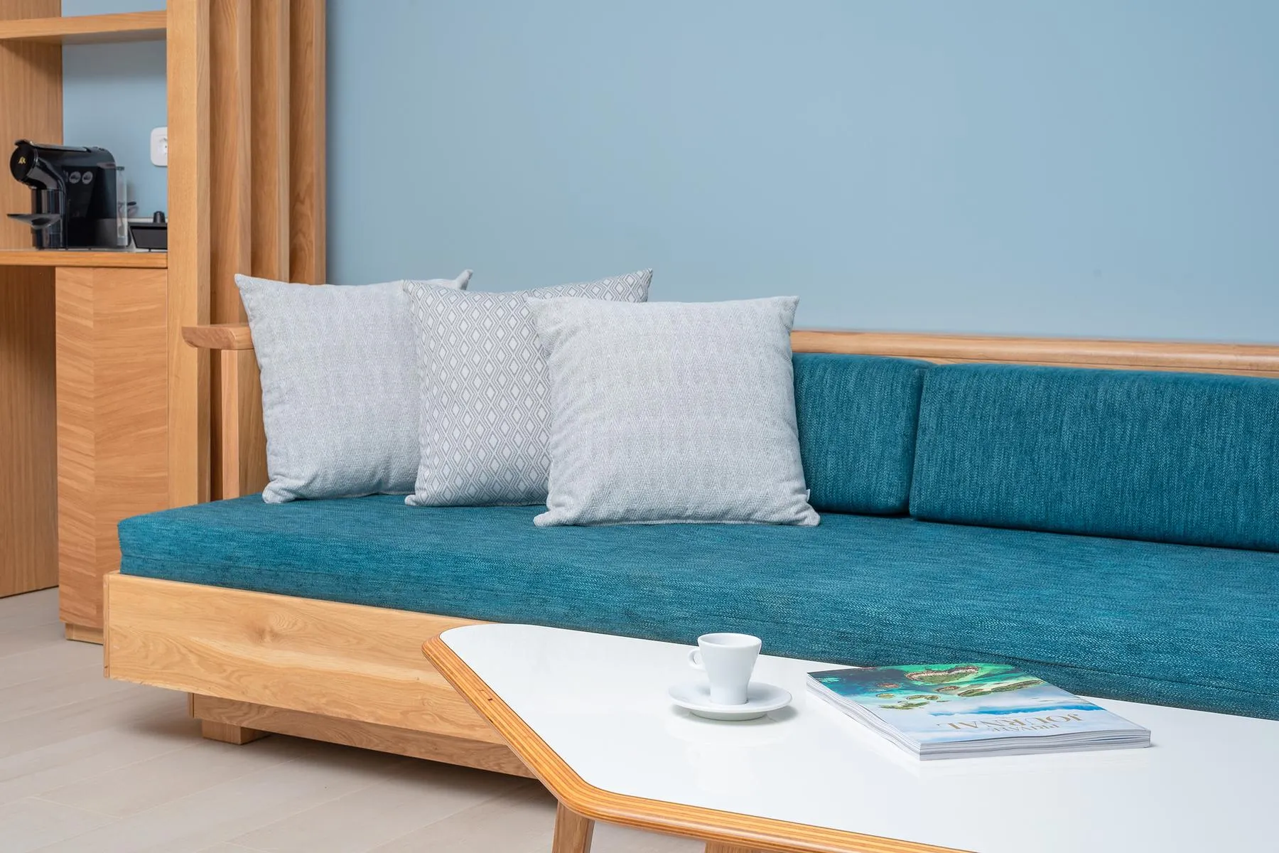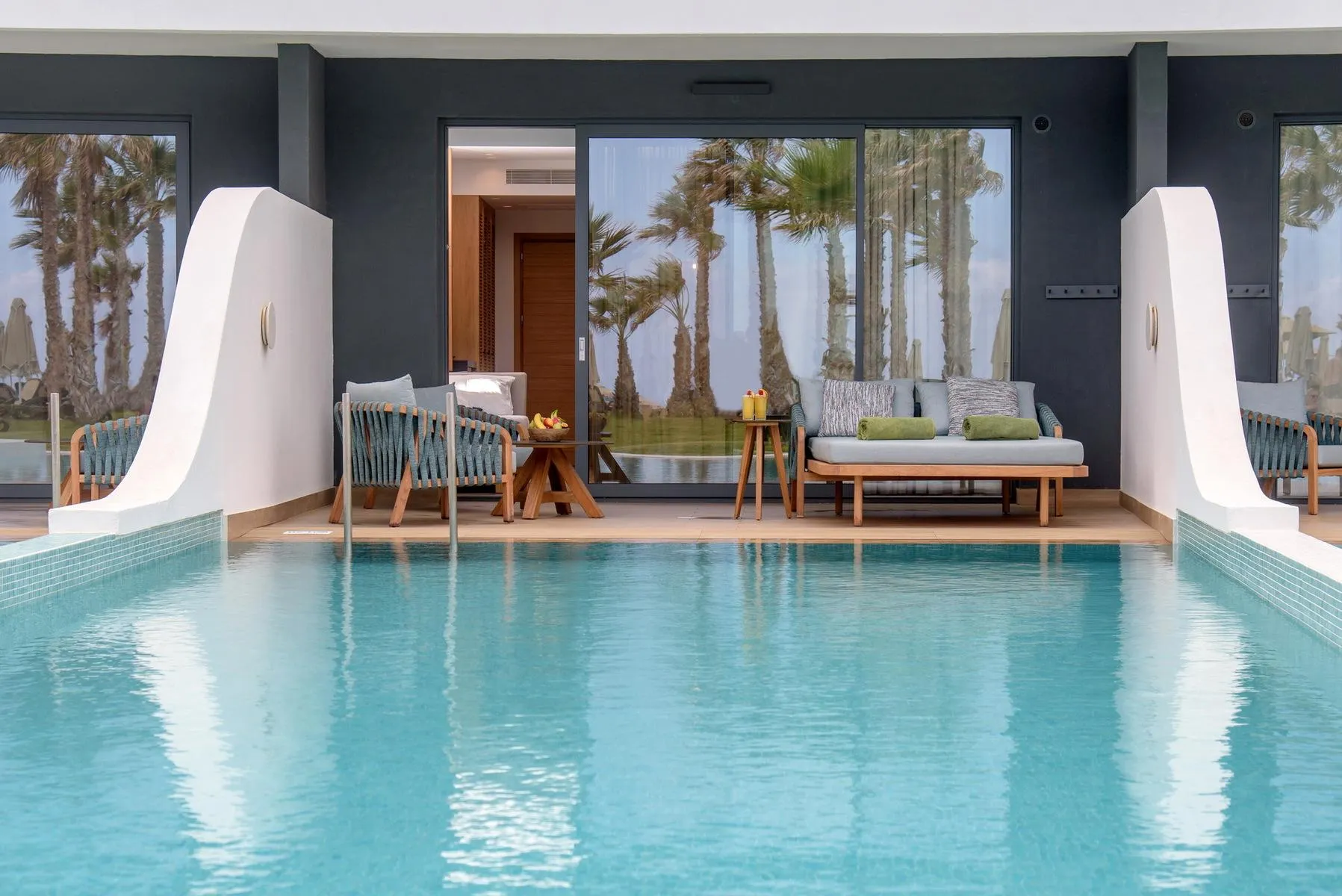 Visa, American Express, Diners Club and Euro / MasterCard. 2 Bedroom FamilyRoom (Private Pool ): The rooms are equipped with double bed, single bed or king size bed, extra bed (sofa bed), baby cot (where applicable, for a fee), tiled floor, kettle (for free), capsule coffee machine (for free), balcony or terrace, private pool, internet (for free), safe (for free) and flat screen sat TV as well as individually adjustable air conditioning. Bathroom with shower (room size: 36 m²). Towels are changed daily (free of charge). 2 Bedroom FamilyRoom (GardenView): The rooms are equipped with double bed, single bed or king size bed, extra bed (sofa bed), baby cot (where applicable, for a fee), tiled floor, kettle (for free), capsule coffee machine (for free), balcony or terrace, internet (for free), safe (for free) and flat screen sat TV as well as individually adjustable air conditioning. Bathroom with shower (room size: 36 m²). Towels are changed daily (free of charge). Bed linen is changed 3 times a week (free of charge). 2 Bedroom FamilyRoom (Sea or Pool View): The rooms are equipped with double bed, single bed or king size bed, extra bed (sofa bed), baby cot (where applicable, for a fee), tiled floor, kettle (for free), capsule coffee machine (for free), balcony or terrace, internet (for free), safe (for free) and flat screen sat TV as well as individually adjustable air conditioning. Bathroom with shower (room size: 36 m²). Towels are changed daily (free of charge). Bed linen is changed 3 times a week (free of charge). 2 Bedroom Grand FamilyRoom (Inland View): The rooms are equipped with double bed or king size bed, extra bed (sofa bed), baby cot (where applicable, for a fee), tiled floor, kettle (for free), capsule coffee machine (for free), balcony or terrace, internet (for free), safe (for free) and flat screen sat TV as well as individually adjustable air conditioning. Bathroom with shower (room size: 36 m²). Towels are changed daily (free of charge). Bed linen is changed 3 times a week (free of charge). Deluxe Junior Suite (Beachfront, Private Pool ): The rooms are equipped with double bed, queen size bed or king size bed, extra bed (sofa bed), baby cot (where applicable, for a fee), tiled floor, kettle (for free), capsule coffee machine (for free), balcony or terrace, private pool, internet (for free), safe (for free) and flat screen sat TV as well as individually adjustable air conditioning. Bathroom with shower (room size: 37 m²). Towels are changed daily (free of charge). Bed linen is changed 3 times a week (free of charge). Double Room (Sea or Pool View): The rooms are equipped with double bed or king size bed, extra bed (sofa bed), baby cot (where applicable, for a fee), tiled floor, kettle (for free), capsule coffee machine (for free), balcony or terrace, internet (for free), safe (for free) and flat screen sat TV as well as individually adjustable air conditioning. Bathroom with shower (room size: 32 m²). Towels are changed daily (free of charge). Bed linen is changed 3 times a week (free of charge). SingleUse Room (Sea or Pool View): The rooms are equipped with double bed or king size bed, extra bed (sofa bed), baby cot (where applicable, for a fee), tiled floor, kettle (for free), capsule coffee machine (for free), balcony or terrace, internet (for free), safe (for free) and flat screen sat TV as well as individually adjustable air conditioning. Bathroom with shower (room size: 32 m²). Towels are changed daily (free of charge). Bed linen is changed 3 times a week (free of charge). Double Deluxe Room (Sea or Pool View, Private Pool ): The rooms are equipped with double bed or king size bed, extra bed (sofa bed), baby cot (where applicable, for a fee), tiled floor, kettle (for free), capsule coffee machine (for free), balcony or terrace, private pool, internet (for free), safe (for free) and flat screen sat TV as well as individually adjustable air conditioning. Bathroom with shower (room size: 32 m²). Towels are changed daily (free of charge). Bed linen is changed 3 times a week (free of charge). Exclusive Room (Sea or Pool View): The rooms with living room are equipped with double bed or king size bed, extra bed (sofa bed), baby cot (where applicable, for a fee), tiled floor, kettle (for free), capsule coffee machine (for free), balcony or terrace, internet (for free), safe (for free) and flat screen sat TV as well as individually adjustable air conditioning. Bathroom with shower (room size: 36 m²). Towels are changed daily (free of charge). Bed linen is changed 3 times a week (free of charge). Exclusive Room (Sea or Pool View, With Jacuzzi): The rooms with living room are equipped with double bed or king size bed, extra bed (sofa bed), baby cot (where applicable, for a fee), kettle (for free), balcony or terrace, jacuzzi, internet (for free), safe (for free) and flat screen sat TV. Bathroom with shower (room size: 36 m²). Towels are changed daily (free of charge). Exclusive Room (Sea or Pool View, Private Pool ): The rooms with living room are equipped with double bed or king size bed, extra bed (sofa bed), baby cot (where applicable, for a fee), tiled floor, kettle (for free), capsule coffee machine (for free), balcony or terrace, private pool, internet (for free), safe (for free) and flat screen sat TV as well as individually adjustable air conditioning. Bathroom with shower (room size: 36 m²). Towels are changed daily (free of charge). Bed linen is changed 3 times a week (free of charge).
