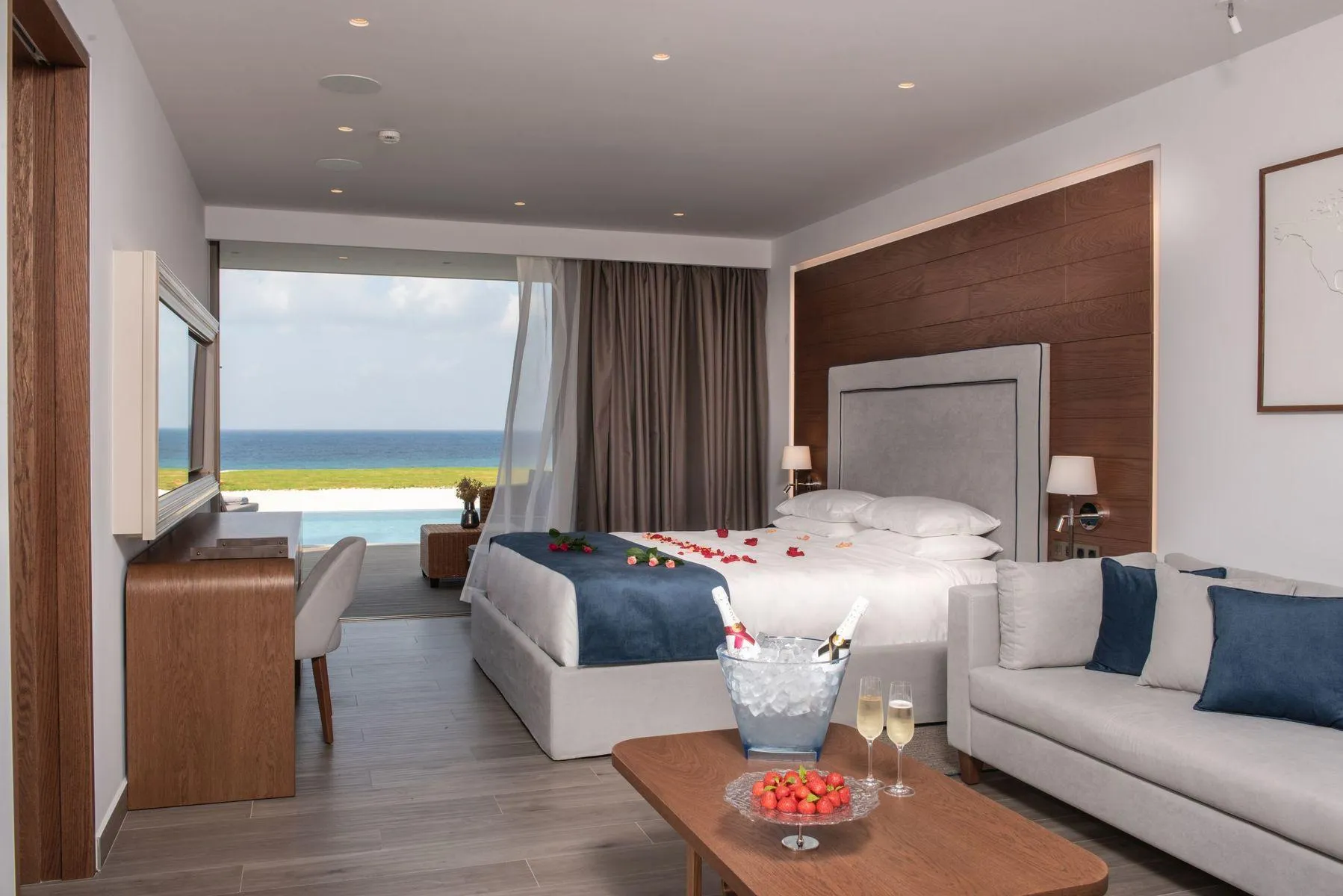 American Express, Visa, Diners Club and Euro / MasterCard. Deluxe JuniorSuite (Pool Front, Private-PoolTerrace): With king size bed, baby cot (where applicable, for a fee), balcony, heating (individually adjustable), kettle (for free), minibar (where applicable, for a fee), capsule coffee machine (for free), internet (for free), safe (for free) and flat screen TV as well as individually adjustable air conditioning. Bathroom with bathtub and shower (room size: 42 m²). Towels are changed daily. Deluxe JuniorSuite (SeaView, Private-PoolTerrace): With king size bed, baby cot (where applicable, for a fee), heating (individually adjustable), kettle (for free), minibar (where applicable, for a fee), capsule coffee machine (for free), internet (for free), safe (for free) and flat screen TV as well as individually adjustable air conditioning. Bathroom with bathtub and shower (room size: 42 m²). Towels are changed daily. Suite (SeaView, Private-PoolTerrace Honeymooners): With king size bed, baby cot (where applicable, for a fee), balcony or terrace, heating (individually adjustable), kettle (for free), minibar (where applicable, for a fee), capsule coffee machine (for free), internet (for free), safe (for free) and flat screen TV as well as individually adjustable air conditioning. Bathroom with bathtub and shower (room size: 78 m²). Towels are changed daily. Ambassador Suite (SeaView, Private-PoolTerrace): With baby cot (where applicable, for a fee), balcony or terrace, heating (individually adjustable), kettle (for free), minibar (where applicable, for a fee), capsule coffee machine (for free), internet (for free), safe (for free) and flat screen TV as well as individually adjustable air conditioning. Bathroom with shower. Towels are changed daily. Deluxe Suite (SeaView, Private-PoolTerrace): With king size bed, baby cot (where applicable, for a fee), balcony or terrace, heating (individually adjustable), kettle (for free), minibar (where applicable, for a fee), capsule coffee machine (for free), internet (for free), safe (for free) and flat screen TV as well as individually adjustable air conditioning. Bathroom with bathtub and shower. Towels are changed daily. Double Deluxe Suite (SeaFront, With Jacuzzi): With king size bed, baby cot (where applicable, for a fee), balcony or terrace, heating (individually adjustable), kettle (for free), minibar (where applicable, for a fee), capsule coffee machine (for free), internet (for free), safe (for free) and flat screen TV as well as individually adjustable air conditioning. Bathroom with bathtub and shower (room size: 82 m²). Towels are changed daily. Executive Suite (SeaView, Private-PoolTerrace): With king size bed, baby cot (where applicable, for a fee), heating (individually adjustable), kettle (for free), minibar (where applicable, for a fee), capsule coffee machine (for free), internet (for free), safe (for free) and flat screen TV as well as individually adjustable air conditioning. Bathroom with bathtub and shower (room size: 75 m²). Towels are changed daily. Premium Suite (SeaView, Private-PoolTerrace): With king size bed, baby cot (where applicable, for a fee), heating (individually adjustable), kettle (for free), minibar (where applicable, for a fee), capsule coffee machine (for free), internet (for free), safe (for free) and flat screen TV as well as individually adjustable air conditioning. Bathroom with bathtub and shower (room size: 70 m²). Towels are changed daily. Prestige Suite (SeaView, Private-PoolTerrace): With heating (individually adjustable), kettle (for free), minibar (where applicable, for a fee), capsule coffee machine (for free), internet (for free), safe (for free) and flat screen TV as well as individually adjustable air conditioning. Towels are changed daily. Wellness Suite (SeaView, Private Pool ): With heating (individually adjustable), kettle (for free), minibar (where applicable, for a fee), capsule coffee machine (for free), internet (for free), safe (for free) and flat screen TV as well as individually adjustable air conditioning. Towels are changed daily. 2 Bedroom Deluxe Villa (SeaView, Private-PoolTerrace): With king size bed, baby cot (where applicable, for a fee), heating (individually adjustable), kettle (for free), minibar (where applicable, for a fee), capsule coffee machine (for free), internet (for free), safe (for free) and flat screen TV as well as individually adjustable air conditioning. Bathroom with bathtub and shower. Towels are changed daily. 3 Bedroom Elegance Villa (SeaView, Private Pool ): With heating (individually adjustable), kettle (for free), minibar (where applicable, for a fee), capsule coffee machine (for free), internet (for free), safe (for free) and flat screen TV as well as individually adjustable air conditioning. Towels are changed daily. 2 Bedroom Premium Villa (SeaView, Private-PoolTerrace): With king size bed, baby cot (where applicable, for a fee), heating (individually adjustable), kettle (for free), minibar (where applicable, for a fee), capsule coffee machine (for free), internet (for free), safe (for free) and flat screen TV as well as individually adjustable air conditioning. Bathroom with bathtub and shower. Towels are changed daily. Presidential Villa (SeaView, Private-PoolTerrace): With king size bed, baby cot (where applicable, for a fee), heating (individually adjustable), kettle (for free), minibar (where applicable, for a fee), capsule coffee machine (for free), internet (for free), safe (for free) and flat screen TV as well as individually adjustable air conditioning. Bathroom with bathtub and shower. Towels are changed daily. 3 Bedroom Royal Villa (SeaView, Private-PoolTerrace): With king size bed, baby cot (where applicable, for a fee), heating (individually adjustable), kettle (for free), minibar (where applicable, for a fee), capsule coffee machine (for free), internet (for free), safe (for free) and flat screen TV as well as individually adjustable air 