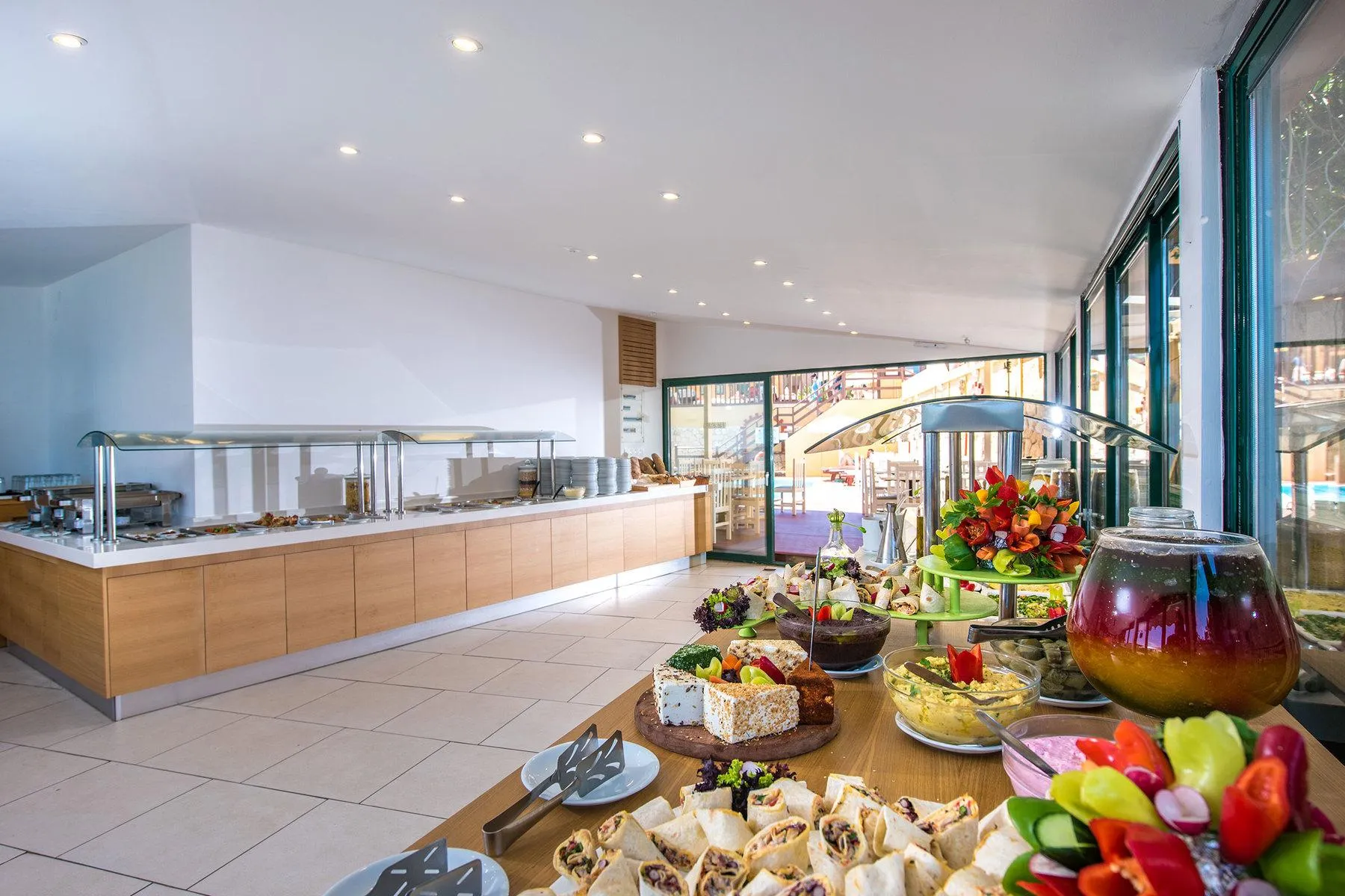 Partially renovated in 2022, the 3-storey resort consists of a main building and 13 adjoining buildings, and has 291 rooms in total. It offers its guests a 24h reception (check-in from 15:00, check-out until 11:00), a lobby with bar, air conditioning, a safe (for a fee), a mini market, a free parking area , a security entry system and a money changing facility. For the meals, there are three restaurants. You will be warmly welcomed in both the hotel’s bars. WiFi is available for free. Room cleaning is free of charge. Room service, laundry service and medical service are available for a fee. Ironing service is against a deposit. Pool: In the outdoor area of the mediterranean-style hotel you will find 4 heatable pools with a separate children´s pool (open from April to November). Here, there are sun umbrellas and sun loungers for free available. Refreshing beverages can be consumed directly at the pool bar (open from 10:00 - 23:00).