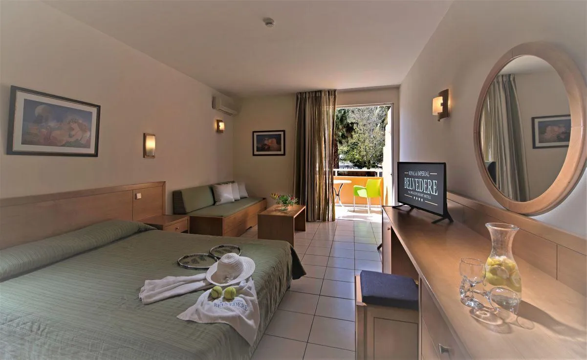 Descriere generală Hotelul Royal and Imperial Belvedere, care este deosebit de popular printre cei aflați în luna de miere, este situat la cca. 1 km de Chersonissos (Malia cca. 6 km, Heraklion cca. 31 km). Cea mai apropiată plajă, o plajă cu nisip se află la cca. 500 m distanță (serviciu de transfer către plajă gratuit). Pe plajă sunt disponibile șezlonguri și umbrele de soare la un cost suplimentar. Centrul turistic al stațiunii se află la aprox. 1 km. Magazinele sunt la aprox. 500 m de hotel, și veți găsi un supermarket la cca. 300 m. Cele mai apropiate baruri și restaurante sunt la cca. 300 km distanță. O discotecă aflată la aprox. 300 m vă invită la dans. Următoarele atracții pot fi accesate de la hotel: Aquarium (cca. 15 km), Knossos Palace (cca. 33 km), Lassithi Plateau (cca. 45 km) și Agios Nikolaos (cca. 40 km). Hotelul dispune de serviciu de rentacar. De asemenea, aveți în apropiere o stație de autobuz (cca. 400 m) și o stație de taxi (cca. 300 m) cea ce vă garantează mobilitatea în timpul vacanțelor. Pentru îngrijiri medicale în caz de urgență, există un spital la cca. 1 km distanță. Aeroportul (CHQ) se află la aprox. 170 km. Un serviciu de transfer (posibil contra cost) face legătura între hotel și aeroport. Un alt aeroport (HER) este la cca. 27 km. Facilități Complexul de cluburi, care a fost renovat parțial în 2023, dispune de 5 etaje și peste 730 camere repartizate între o clădire principală și o clădire secundară. Hotelul are recepție (check-in de la 15:00, check out până la 11:00), lobby cu bar, 3 lifturi, aer condiționat, seif (gratuit), chioșc, minimarket, alte magazine, parcare (gratuită) și birou de schimb valutar. Pentru a satisface apetitul vă stau la dispoziție 2 restaurante cu aer condiționat și un snackbar. Accesul la internet WiFi este disponibil gratuit pentru oaspeții hotelului. Pentru evenimente de afaceri, hotelul oferă o zonă de conferințe cu un total de 550 de locuri și cu acces la internet. Pentru oaspeții care depind de un scaun cu rotile, hotelul oferă un lift accesibil pentru scaune cu rotile, băi parțial accesibile pentru scaune cu rotile și acces fără bariere. Serviciul de menaj este gratuit. Spălătorie, călcat și serviciul medical (între orele 09:00 - 11:00) sunt disponibile la un cost suplimentar. Piscină În grădinile acestui hotelul există 3 piscine cu apă sărată precum și o piscină pentru copii (deschise din aprilie până în octombrie) și un tobogan de apă. Acolo sunt disponibile gratuit șezlonguri și umbrele de soare. La barul de la piscină sunt disponibile băuturi răcoritoare (deschis între orele 10:00 - 01:00). Catering Mic dejun (între orele 07:30 - 10:00) bufet suedez. All Inclusive: micul dejun, prânzul și cina. Micul dejun, prânzul și cina pot fi servite numai în anumite restaurante. Sunt disponibile și meniuri pentru copii. Cocktailuri. Mic dejun târziu (între orele 10:00 - 11:00), băuturi răcoritoare (10:00 - 01:00), cafea și ceai (10:00 - 01:00), prăjituri și produse de patiserie (10:00 - 21:30), aperitive (10:00 - 21:30), bere (10:00 - 01:00), vin (10:00 - 01:00), băuturi alcoolice naționale (10:00 - 01:00), 1 masă în restaurantul à la carte și internet gratuit. Este posibil check-in mai devreme și check-out mai târziu (în funcție de disponibilitate). Sport/Leisure Oferte pentru sport și divertisment: Aerobic, minigolf, biliard (contra cost), darts (gratuit), volei, tenis de masă (gratuit), yoga, volei pe plajă, tenis (gratuit), baschet și fitness. La cca. 10 km de hotel este un teren de golf. Oferte de wellness: Jacuzzi gratuit. Zonă de spa, saună și masaje contra cost. Divertisment pentru adulți: program de animație cu spectacole de seară. Loc de joacă pentru copii. Îngrijirea copiilor: program de animație pentru copii, mini club și babysitting (contra cost). Sală de jocuri. Informații suplimentare Pentru anumite facilități sau activități se pot aplica taxe suplimentare. Unele servicii depind de anotimp și de condițiile climatice locale. Nu se servește alcool în acest hotel. Limbi de serviciu: engleză, germană, franceză, italiană, rusă și greacă. Carduri de credit: Visa și Euro/MasterCard. Familienzimmer (Mountain or Garden View): Dotate cu 2 paturi suplimentare, pardoseală cu gresie, seif (contra cost) și aparat de cafea cu capsule (posibil contra cost) precum și aer condiționat controlat central (din aprilie până în octombrie). Baie cu cadă. Prosoapele se schimbă de 4 ori pe săptămână, lenjeria de pat de 2 ori pe săptămână. Fünfer Familienzimmer (Blick auf das Inland, Economy): Cameră cu 2 paturi suplimentare, pardoseală cu gresie, seif (contra cost) și aparat de cafea cu capsule (posibil contra cost) precum și aer condiționat controlat central (din aprilie până în octombrie). Baie cu cadă. Prosoapele se schimbă de 4 ori pe săptămână, lenjeria de pat de 2 ori pe săptămână. Vierer Familienzimmer (Blick auf das Inland, Economy): Dotate cu 2 paturi suplimentare, pardoseală cu gresie, seif (contra cost) și aparat de cafea cu capsule (posibil contra cost) precum și aer condiționat controlat central (din aprilie până în octombrie). Baie cu cadă. Prosoapele se schimbă de 4 ori pe săptămână, lenjeria de pat de 2 ori pe săptămână. Deluxe Familienzimmer (Blick auf das Inland): Dotate cu 2 paturi suplimentare, pardoseală cu gresie, seif (contra cost) și aparat de cafea cu capsule (posibil contra cost) precum și aer condiționat controlat central (din aprilie până în octombrie). Baie cu cadă. Prosoapele se schimbă de 4 ori pe săptămână, lenjeria de pat de 2 ori pe săptămână. Deluxe Familienzimmer (Mountain or Garden View): Dotate cu 2 paturi suplimentare, pardoseală cu gresie, ceainic (gratuit), balcon sau terasă, acces la internet (gratuit), seif (contra cost), aparat de cafea cu capsule (posibil contra cost) și