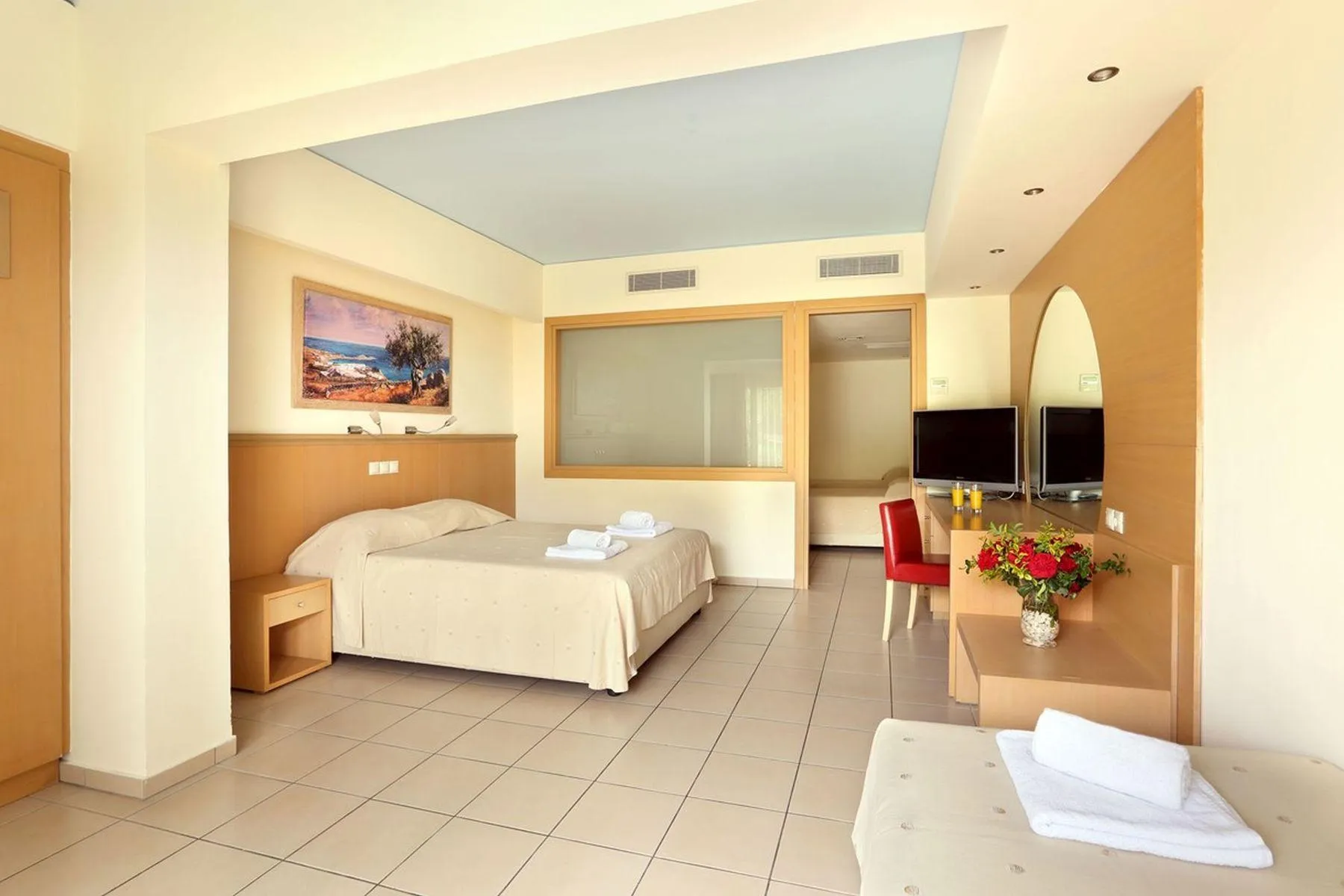 American Express, Visa and Euro / MasterCard. Standard FamilyRoom: With double bed or twin bed, baby cot (for free), tiled floor, kitchenette, balcony or terrace, kettle (for free), internet (for free), safe (for free) and flat screen sat TV as well as individually adjustable air conditioning. Bathroom with shower (room size: 34 - 38 m²). Towels are changed. Superior FamilyRoom: With double bed or twin bed, baby cot (for free), tiled floor, kitchenette, balcony or terrace, kettle (for free), internet (for free), safe (for free) and flat screen sat TV as well as individually adjustable air conditioning. Bathroom with shower (room size: 45 - 52 m²). Towels are changed. Annex Room: With double bed, single bed or twin bed, tiled floor, balcony or terrace, kettle (for free), internet (for free), safe (for free) and flat screen sat TV as well as individually adjustable air conditioning. Bathroom with shower (room size: 18 - 25 m²). Towels are changed. Standard Room: With double bed or twin bed, baby cot (for free), tiled floor, kitchenette, balcony or terrace, kettle (for free), internet (for free), safe (for free) and flat screen sat TV as well as individually adjustable air conditioning. Bathroom with shower (room size: 20 - 28 m²). Towels are changed. Standard Room (SeaView): With double bed or twin bed, baby cot (for free), tiled floor, kitchenette, balcony or terrace, kettle (for free), internet (for free), safe (for free) and flat screen sat TV as well as individually adjustable air conditioning. Bathroom with shower (room size: 20 - 28 m²). Towels are changed. SingleUse Standard Room: With double bed or twin bed, tiled floor, kitchenette, balcony or terrace, kettle (for free), internet (for free), safe (for free) and flat screen sat TV as well as individually adjustable air conditioning. Bathroom with shower (room size: 20 - 28 m²). Towels are changed. Suite: With double bed or twin bed, baby cot (for free), tiled floor, kitchenette, balcony or terrace, kettle (for free), internet (for free), safe (for free) and flat screen sat TV as well as individually adjustable air conditioning. Bathroom with shower (room size: 20 - 28 m²). Towels are changed. *No half board basis available. *The Annex building is 150 m away from the reception and 250 m away from the beach. There is an under path connecting the streets a few meters away from the Hotels reception.