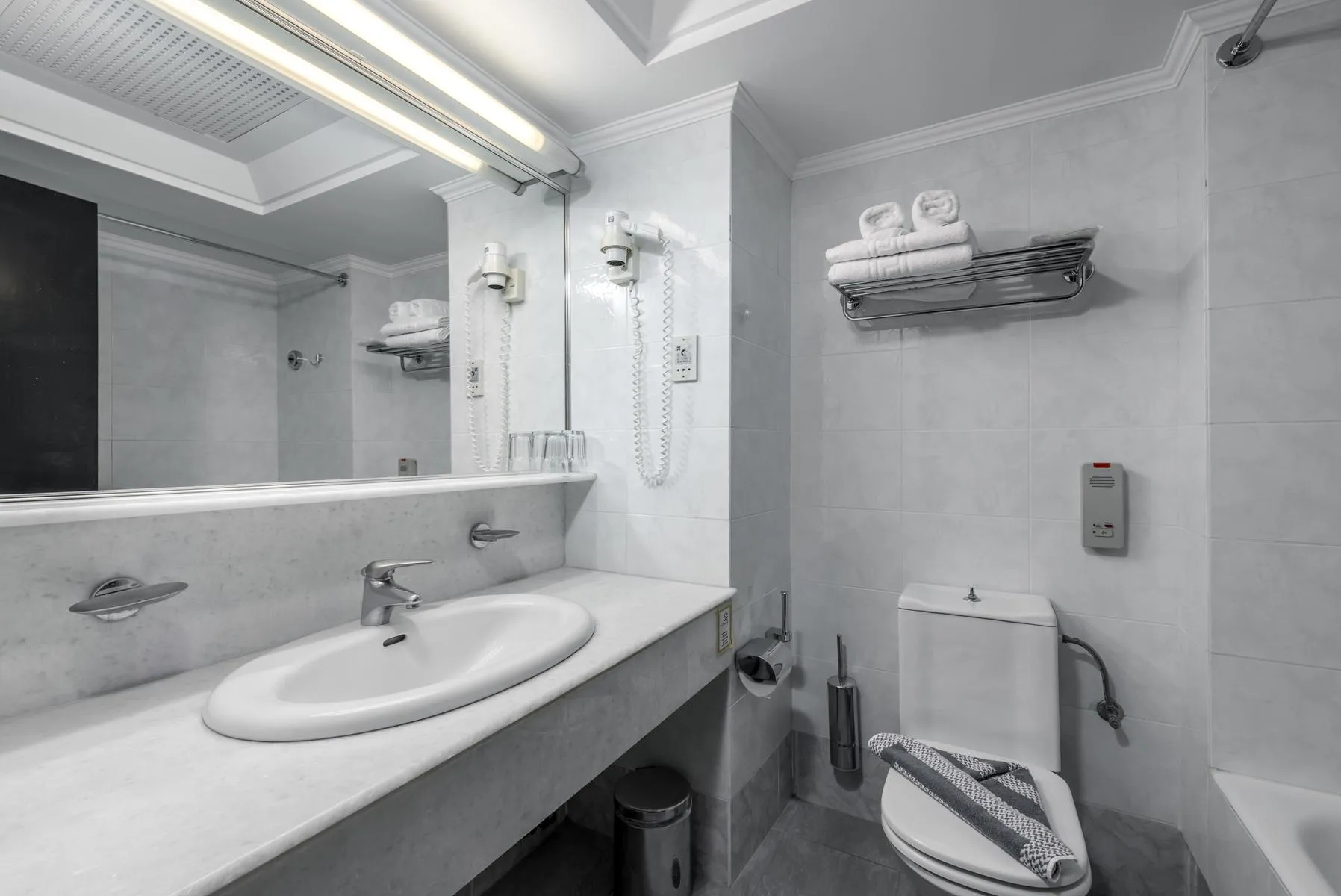 Partially renovated in 2021, the 4-storey beach hotel consists of a main building and an adjoining building, and has 310 rooms in total. It offers its guests a 24h reception (check-in from 15:00, check-out until 11:00), a lobby with bar, 4 lifts, air conditioning, a safe (for a fee), coiffeur, a mini market and a free parking area. For the meals, there is a restaurant (air-conditioned). You will be warmly welcomed in both the hotel’s bars. WiFi is available for free. Room cleaning and concierge service are free of charge. Room service, laundry / ironing service and medical service are available for a fee. Pool: In the outdoor area of the hotel you will find one fresh water pool (approx. 310 m²) with a separate children´s pool (open from April to October). Here, there are sun loungers and sun umbrellas for free available. At the pool bar you can get refreshing beverages.