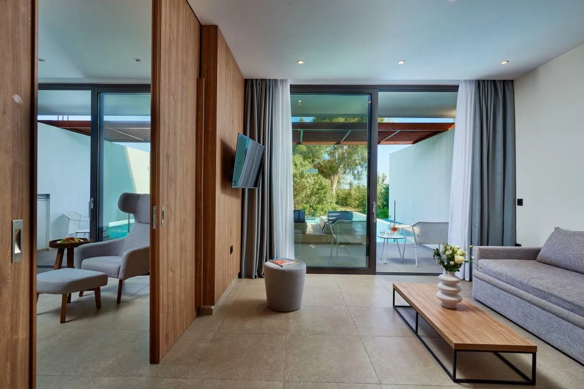 Visa, American Express and Euro / MasterCard. Beachfront JuniorSuite (Private Pool ): The modern furnished rooms are equipped with king size bed or twin bed, tiled floor and balcony or terrace. Bathroom with shower (room size: 40 m²). Standard JuniorSuite (GardenView): The modern furnished rooms are equipped with king size bed or twin bed, sofa bed as extra bed, baby cot (for free), tiled floor, balcony or terrace, kettle (for free), minibar (for a fee), internet (for free), safe (for free) and flat screen sat TV as well as centrally controlled air conditioning. Bathroom with shower (room size: 40 m²). Standard JuniorSuite (GardenView, Private-PoolTerrace): The modern furnished rooms are equipped with king size bed or twin bed, sofa bed as extra bed, baby cot (for free), tiled floor, private pool, balcony or terrace, kettle (for free), minibar (for a fee), internet (for free), safe (for free) and flat screen sat TV as well as centrally controlled air conditioning. Bathroom with shower (room size: 40 m²). Standard JuniorSuite (SeaView): The modern furnished rooms are equipped with king size bed or twin bed, sofa bed as extra bed, baby cot (for free), tiled floor, balcony or terrace, kettle (for free), minibar (for a fee), internet (for free), safe (for free) and flat screen sat TV as well as centrally controlled air conditioning. Bathroom with shower (room size: 40 m²). Standard JuniorSuite (SeaView, Promotion): The modern furnished rooms are equipped with king size bed or twin bed and balcony or terrace. Standard JuniorSuite (SeaView, Private-PoolTerrace): The modern furnished rooms are equipped with king size bed or twin bed, sofa bed as extra bed, baby cot (for free), tiled floor, private pool, balcony or terrace, kettle (for free), minibar (for a fee), internet (for free), safe (for free) and flat screen sat TV as well as centrally controlled air conditioning. Bathroom with shower (room size: 40 m²). Double Standard Room (GardenView): The modern furnished rooms are equipped with king size bed or twin bed, tiled floor, balcony or terrace, kettle (for free), minibar (for a fee), internet (for free), safe (for free) and flat screen sat TV as well as centrally controlled air conditioning. Bathroom with shower (room size: 30 m²). Double Standard Room (GardenView, Economy): The modern furnished rooms are equipped with king size bed or twin bed, tiled floor, balcony or terrace, kettle (for free), minibar (for a fee), internet (for free), safe (for free) and flat screen sat TV as well as centrally controlled air conditioning. Bathroom with shower (room size: 30 m²). Double Standard Room (GardenView, Promotion): The modern furnished rooms are equipped with king size bed or twin bed, balcony or terrace. Double Standard Room (GardenView, Private-PoolTerrace): The modern furnished rooms are equipped with king size bed or twin bed, tiled floor, private pool, balcony or terrace, kettle (for free), minibar (for a fee), internet (for free), safe (for free) and flat screen sat TV as well as centrally controlled air conditioning. Bathroom with shower (room size: 30 m²). Double Standard Room (SeaView, Private-PoolTerrace): The modern furnished rooms are equipped with king size bed or twin bed, tiled floor, private pool, balcony or terrace, kettle (for free), minibar (for a fee), internet (for free), safe (for free) and flat screen sat TV as well as centrally controlled air conditioning. Bathroom with shower (room size: 30 m²). SingleUse Standard Room (GardenView): The modern furnished rooms are equipped with king size bed or twin bed, tiled floor, balcony or terrace, kettle (for free), minibar (for a fee), internet (for free), safe (for free) and flat screen sat TV as well as centrally controlled air conditioning. Bathroom with shower (room size: 30 m²). 2 Bedroom Suite (GardenView, Private-PoolTerrace): The modern furnished rooms are equipped with king size bed or twin bed, sofa bed as extra bed, baby cot (for free), tiled floor, private pool, balcony or terrace, kettle (for free), minibar (for a fee), internet (for free), safe (for free) and flat screen sat TV as well as centrally controlled air conditioning. Bathroom with shower (room size: 80 m²). 2 Bedroom Suite (SeaView, Private-PoolTerrace): The modern furnished rooms are equipped with king size bed or twin bed, sofa bed as extra bed, baby cot (for free), tiled floor, private pool, balcony or terrace, kettle (for free), minibar (for a fee), internet (for free), safe (for free) and flat screen sat TV as well as centrally controlled air conditioning. Bathroom with shower (room size: 80 m²). Standard Suite (GardenView): The modern furnished rooms are equipped with king size bed or twin bed, sofa bed as extra bed, baby cot (for free), tiled floor, balcony or terrace, kettle (for free), minibar (for a fee), internet (for free), safe (for free) and flat screen sat TV as well as centrally controlled air conditioning. Bathroom with shower (room size: 47 m²). Standard Suite (GardenView, Promotion): The modern furnished rooms are equipped with king size bed or twin bed and balcony or terrace. Standard Suite (GardenView, Private-PoolTerrace): The modern furnished rooms are equipped with king size bed or twin bed, sofa bed as extra bed, baby cot (for free), tiled floor, private pool, balcony or terrace, kettle (for free), minibar (for a fee), internet (for free), safe (for free) and flat screen sat TV as well as centrally controlled air conditioning. Bathroom with shower (room size: 47 m²). Standard Suite (SeaView): The modern furnished rooms are equipped with king size bed or twin bed, sofa bed as extra bed, baby cot (for free), tiled floor, balcony or terrace, kettle (for free), minibar (for a fee), internet (for free), safe (for free) and flat screen sat TV as well as centrally controlled air conditioning. Bathroom with shower (room size: 47 m²). Standard Suite (SeaView, Private-PoolTerrace): The modern furnished rooms are equipped with kin