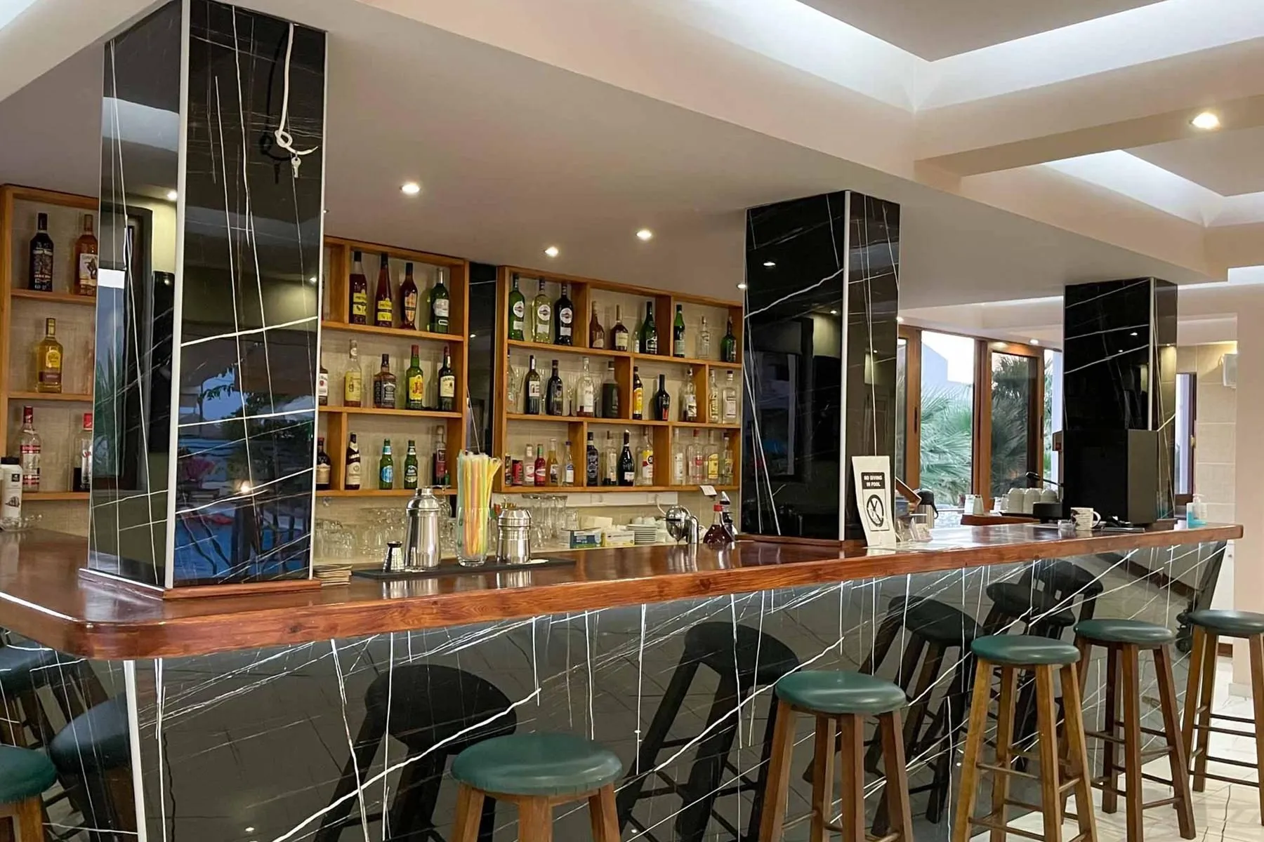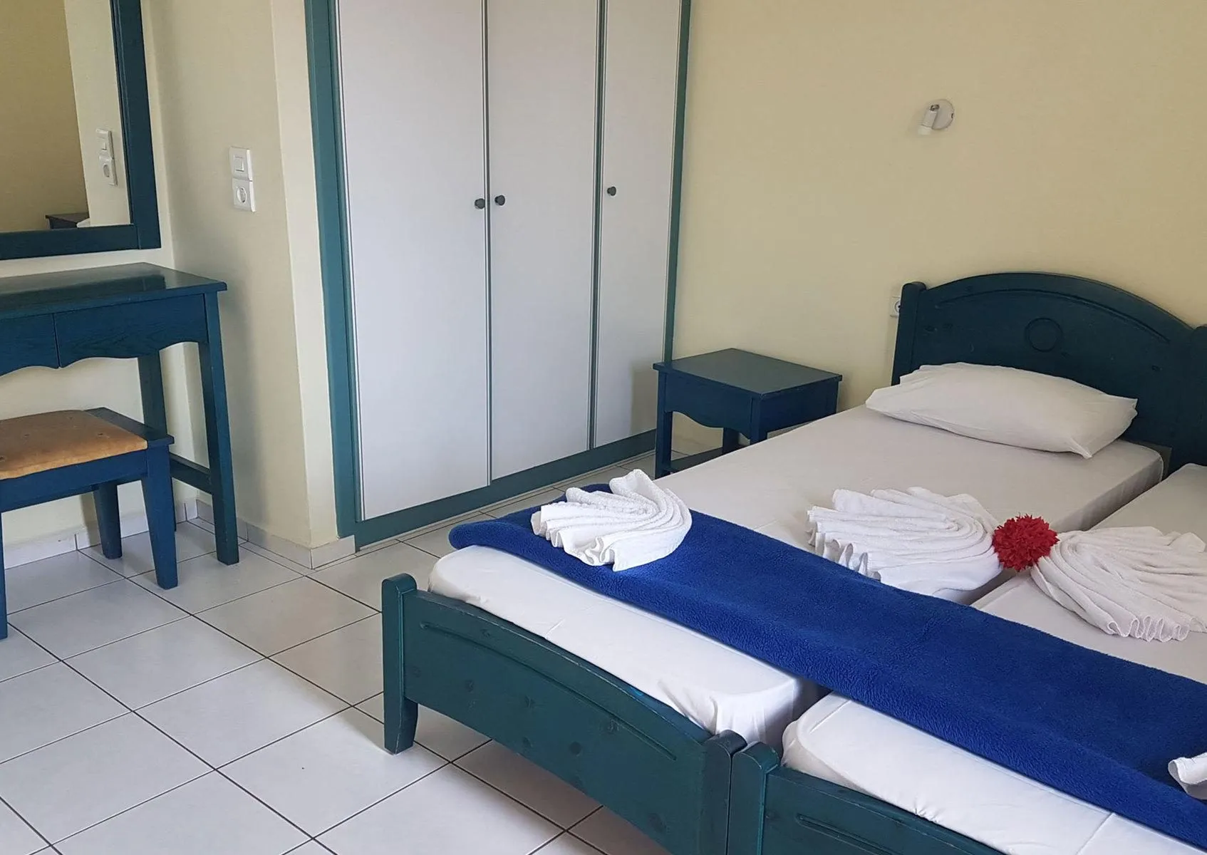 Descriere generală La cca. 120 m de o plajă cu nisip veți găsi hotelul Blue Sky Hotel Apts. Pe plajă sunt disponibile șezlonguri și umbrele de soare la un cost suplimentar. Locul de cazare se află la doar câțiva metri de centrul turistic al stațiunii. Orașul Agios nikolaos este la aprox. 50 km (Heraklion cca. 16 km, Hersonisos cca. 7 km). Chiar lângă hotel sunt diverse magazine și un magazin alimentar. La cele mai apropiate baruri și restaurante se poate ajunge într-un timp foarte scurt. O discotecă aflată la aprox. 1 km vă invită la dans. Următoarele atracții pot fi accesate de la hotel: watersports (cca. 120 m), Aquarium, Dinosavria și Planetarium. Hotelul dispune de serviciu de rentacar. De asemenea, aveți în apropiere o stație de autobuz (cca. 1 km) și o stație de taxi (cca. 50 m) cea ce vă garantează mobilitatea în timpul vacanțelor. Pentru îngrijiri medicale în caz de urgență, există un spital la cca. 18 km distanță. Aeroportul (CHQ) se află la aprox. 163 km. Un alt aeroport (HER) este la cca. 17 km. Facilități Hotelul familiar, care a fost renovat parțial în 2020, dispune de un singur etaj și peste 16 camere repartizate între o clădire principală și o clădire secundară. Acesta oferă oaspeților săi recepție (check-in de la 14:00, check out până la 12:00), lobby, lift, aer condiționat, seif (gratuit) și parcare (gratuită). Pentru a servi masa aveți la dispoziție un restaurant și un snackbar. Accesul la internet WiFi este disponibil gratuit pentru oaspeții hotelului. Pentru oaspeții cu dizabilități fizice, unitatea de cazare oferă acces fără bariere. Serviciul de menaj și călcat sunt gratuite. Spălătorie și serviciul medical sunt disponibile la un cost suplimentar. Piscină Zona exterioară a hotelului decorat în stil mediteranean include o piscină cu apă dulce precum și o piscină separată pentru copii. Acolo sunt disponibile gratuit șezlonguri și umbrele de soare. Un bar lângă piscină oferă oaspeților băuturi răcoritoare. Catering Mic dejun bufet suedez. Demipensiunea include micul dejun și cina. Sport/Leisure La cca. 120 m de hotel, sunt oferite sporturi nautice precum jet ski, schi nautic și plimbări cu barca cu motor (unele de către furnizori locali). La cca. 7 km de hotel este un teren de golf. Există serviciu de închiriere de biciclete. Oferte de wellness: Masaje contra cost. Îngrijirea copiilor: babysitting (posibil contra cost). Informații suplimentare Pentru anumite facilități sau activități se pot aplica taxe suplimentare. Unele servicii depind de anotimp și de condițiile climatice locale. Limbi de serviciu: engleză, italiană, suedeză și greacă. Carduri de credit: Visa și Euro/MasterCard. Standard Apartment: Camerele confortabile sunt echipate cu pat twin sau pat single, pat suplimentar, pat pentru bebeluși (gratuit), pardoseală cu gresie, ceainic (gratuit), balcon, acces la internet (gratuit), seif (gratuit), TV cu ecran plat și canale locale precum și aer condiționat reglabil individual (contra cost). Baie cu duș. Prosoapele se schimbă de 3 ori pe săptămână, lenjeria de pat de 2 ori pe săptămână. Dimensiune: 45 m². Dreifach Studio: Dotate cu pat twin și , pat suplimentar precum și aer condiționat reglabil individual (contra cost). Standard Studio: Camerele confortabile sunt echipate cu pat twin sau pat single, pat suplimentar, pat pentru bebeluși (gratuit), pardoseală cu gresie, ceainic (gratuit), balcon, acces la internet (gratuit), seif (gratuit), TV cu ecran plat și canale locale precum și aer condiționat reglabil individual (contra cost). Baie cu duș. Prosoapele se schimbă de 3 ori pe săptămână, lenjeria de pat de 2 ori pe săptămână. Dimensiune: 35 m². Einzelbelegung Standard Studio: Camerele confortabile sunt echipate cu pat twin sau pat single, pat suplimentar, pat pentru bebeluși (gratuit), pardoseală cu gresie, ceainic (gratuit), balcon, acces la internet (gratuit), seif (gratuit), TV cu ecran plat și canale locale precum și aer condiționat reglabil individual (contra cost). Baie cu duș. Prosoapele se schimbă de 3 ori pe săptămână, lenjeria de pat de 2 ori pe săptămână. Dimensiune: 35 m².