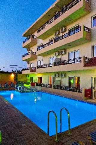 About 1 km from a beach lies the hotel Alea Hotel. The hotel has a reception, a lobby bar, Wi-Fi, parking spaces as well as a TV lounge with satellite TV. At the pool, deck chairs and parasols are available for free. Furthermore, you can relax outdoors on the terrace. Your valuables can be stored in the hotel safe (extra fee). The energy supply is 220 Volts. If you want to explore the holiday region, you can use the car rental service close to the hotel (extra fee). Catering Breakfast is offered from the buffet. Distances