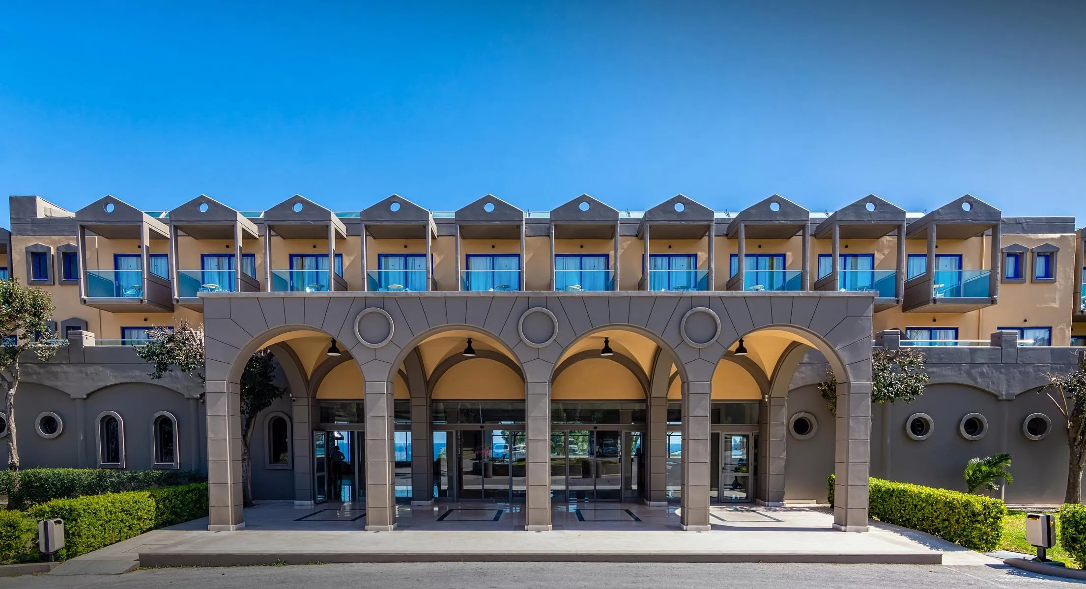 The hotel Kresten Palace lies approx. 200 m from the Kavourakia, a shingle/rocky beach. At the beach are sun umbrellas and sun loungers free of charge available. The tourist centre is about 1 km away. The town Rhodes is around 6 km away (Faliraki around 4 km, Lindos around 44 km). You can find a food store and other shopping facilities approx. 1 km away. It is 1 km from the hotel to the nearest bars and restaurants. For evening dancing you will find a nightclub in a distance of approx. 4 km. Further entertainment facilities such as a cinema are approx. 6 km away. For mobility during your holiday, there are a taxi rank as well as a bus stop in a distance of around 50 m, a car rental company and a motorcycle rental. For medical treatment in emergencies there is a hospital around 6 km away. The airport (RHO) is approx. 18 km away.