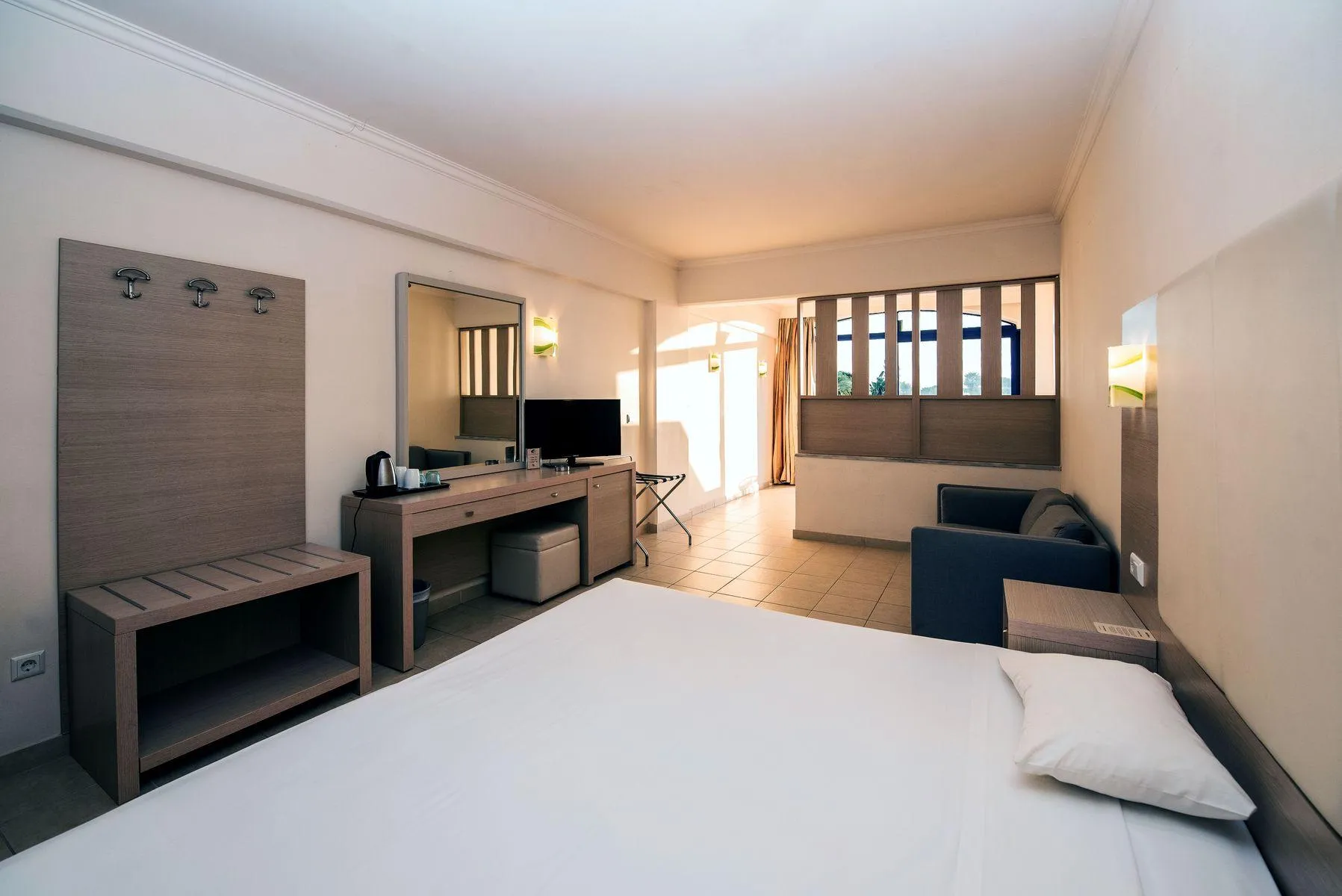 The 3-storey resort has 285 rooms, and spread over one main building and 3 adjoining buildings. It is equipped with a 24h reception (check-in from 15:00, check-out until 11:00), a lobby, 5 lifts, an air conditioning, a mini market, a parking area (for free) as well as a money changing facility. For the meals, there are two restaurants (air-conditioned). You will be warmly welcomed in both the hotel’s bars. WiFi is available for free. For guests dependent on a wheelchair the accommodation provides a barrier-free access and a wheelchair accessible lift. Room cleaning is free of charge. Laundry / ironing service and medical service are available for a fee. For the room service the hotel charges a fee (where applicable). Pool: In the outdoor area of the hotel you will find one fresh water pool with a children´s pool integrated into the main pool. Here, there are sun umbrellas and sun loungers for free available. A bar at the pool offers guests refreshing beverages (open from 10:00 - 18:00).
