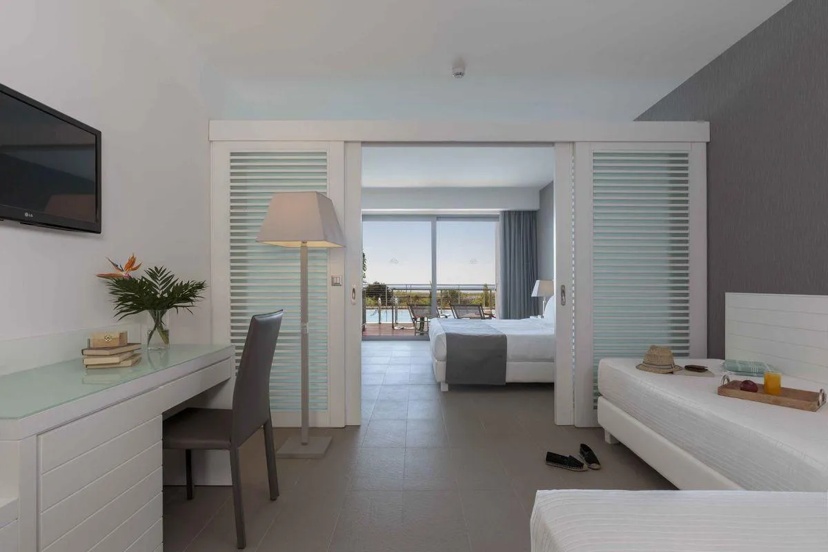 Euro / MasterCard and Visa. Standard FamilyRoom: Bed linen is changed daily (free of charge). Standard FamilyRoom (GardenView): The modern furnished rooms are equipped with double bed or twin bed, extra bed (folding bed), sofa bed as extra bed, baby cot (for free), tiled floor, kettle (for free), minibar (for free), balcony, internet (for free), safe (for free) and flat screen sat TV as well as individually adjustable air conditioning (from April to November). Bathroom with bathtub (room size: 41 m²). Towels are changed daily (free of charge). Bed linen is changed daily (free of charge). Superior FamilyRoom (Shared-PoolTerrace): The modern furnished rooms are equipped with double bed, extra bed (folding bed), sofa bed as extra bed, baby cot (for free), tiled floor, kettle (for free), minibar (for free), shared pool, internet (for free), safe (for free) and flat screen sat TV as well as individually adjustable air conditioning (from April to November). Towels are changed daily (free of charge). Bed linen is changed daily (free of charge). Room size: 41 m². Standard JuniorSuite: The modern furnished rooms are equipped with extra bed (folding bed), sofa bed as extra bed, baby cot (for free), tiled floor, kettle (for free), minibar (for free), balcony, internet (for free), safe (for free) and flat screen sat TV as well as individually adjustable air conditioning (from April to November). Towels are changed daily (free of charge). Bed linen is changed daily (free of charge). Room size: 41 m². Standard JuniorSuite (GardenView): The modern furnished rooms are equipped with double bed or king size bed, extra bed (folding bed), sofa bed as extra bed, baby cot (for free), tiled floor, kettle (for free), minibar (for free), balcony, internet (for free), safe (for free) and flat screen sat TV as well as individually adjustable air conditioning (from April to November). Bathroom with bathtub (room size: 37 m²). Towels are changed daily (free of charge). Bed linen is changed daily (free of charge). Standard JuniorSuite (SeaView, Balcony): The modern furnished rooms are equipped with double bed, extra bed (folding bed), sofa bed as extra bed, baby cot (for free), tiled floor, kettle (for free), minibar (for free), balcony, internet (for free), safe (for free) and flat screen sat TV as well as individually adjustable air conditioning (from April to November). Towels are changed daily (free of charge). Bed linen is changed daily (free of charge). Room size: 41 m². Standard JuniorSuite (SeaView, Shared-PoolTerrace): The modern furnished rooms are equipped with double bed, extra bed (folding bed), sofa bed as extra bed, baby cot (for free), tiled floor, kettle (for free), minibar (for free), shared pool, internet (for free), safe (for free) and flat screen sat TV as well as individually adjustable air conditioning (from April to November). Towels are changed daily (free of charge). Bed linen is changed daily (free of charge). Room size: 41 m². Superior JuniorSuite (Private-PoolTerrace): The modern furnished rooms are equipped with king size bed, extra bed (folding bed), sofa bed as extra bed, baby cot (for free), tiled floor, kettle (for free), minibar (for free), private pool, internet (for free), safe (for free) and flat screen sat TV as well as individually adjustable air conditioning (from April to November). Bathroom with bathtub (room size: 37 m²). Towels are changed daily (free of charge). Bed linen is changed daily (free of charge). Deluxe Room (LateralSeaView): The modern furnished rooms are equipped with double bed or twin bed, extra bed (folding bed), sofa bed as extra bed, baby cot (for free), tiled floor, kettle (for free), minibar (for free), balcony, internet (for free), safe (for free) and flat screen sat TV as well as individually adjustable air conditioning (from April to November). Bathroom with bathtub (room size: 28 - 29 m²). Towels are changed daily (free of charge). Bed linen is changed daily (free of charge). Deluxe Room (PoolView): The modern furnished rooms are equipped with double bed or twin bed, extra bed (folding bed), sofa bed as extra bed, baby cot (for free), tiled floor, kettle (for free), minibar (for free), balcony or terrace, internet (for free), safe (for free) and flat screen sat TV as well as individually adjustable air conditioning (from April to November). Towels are changed daily (free of charge). Bed linen is changed daily (free of charge). Room size: 28 - 29 m². Deluxe Room (SeaView): The modern furnished rooms are equipped with double bed or twin bed, extra bed (folding bed), sofa bed as extra bed, baby cot (for free), tiled floor, kettle (for free), minibar (for free), balcony, internet (for free), safe (for free) and flat screen sat TV as well as individually adjustable air conditioning (from April to November). Bathroom with bathtub (room size: 28 - 29 m²). Towels are changed daily (free of charge). Bed linen is changed daily (free of charge). Double Standard Room (Private-PoolTerrace Honeymooners): The modern furnished rooms are equipped with double bed, extra bed (folding bed), sofa bed as extra bed, baby cot (for free), tiled floor, kettle (for free), minibar (for free), private pool, internet (for free), safe (for free) and flat screen sat TV as well as individually adjustable air conditioning (from April to November). Bathroom with bathtub (room size: 27 m²). Towels are changed daily (free of charge). Bed linen is changed daily (free of charge). Twin Standard Room (Private-PoolTerrace Honeymooners): The modern furnished rooms are equipped with king size bed, extra bed (folding bed), sofa bed as extra bed, baby cot (for free), tiled floor, kettle (for free), minibar (for free), private pool, internet (for free) and flat screen sat TV as well as individually adjustable air conditioning (from April to November). Bathroom with bathtub (room size: 27 m²). Towels are changed daily (free of charge). Bed linen is changed daily (free of charge). Exec