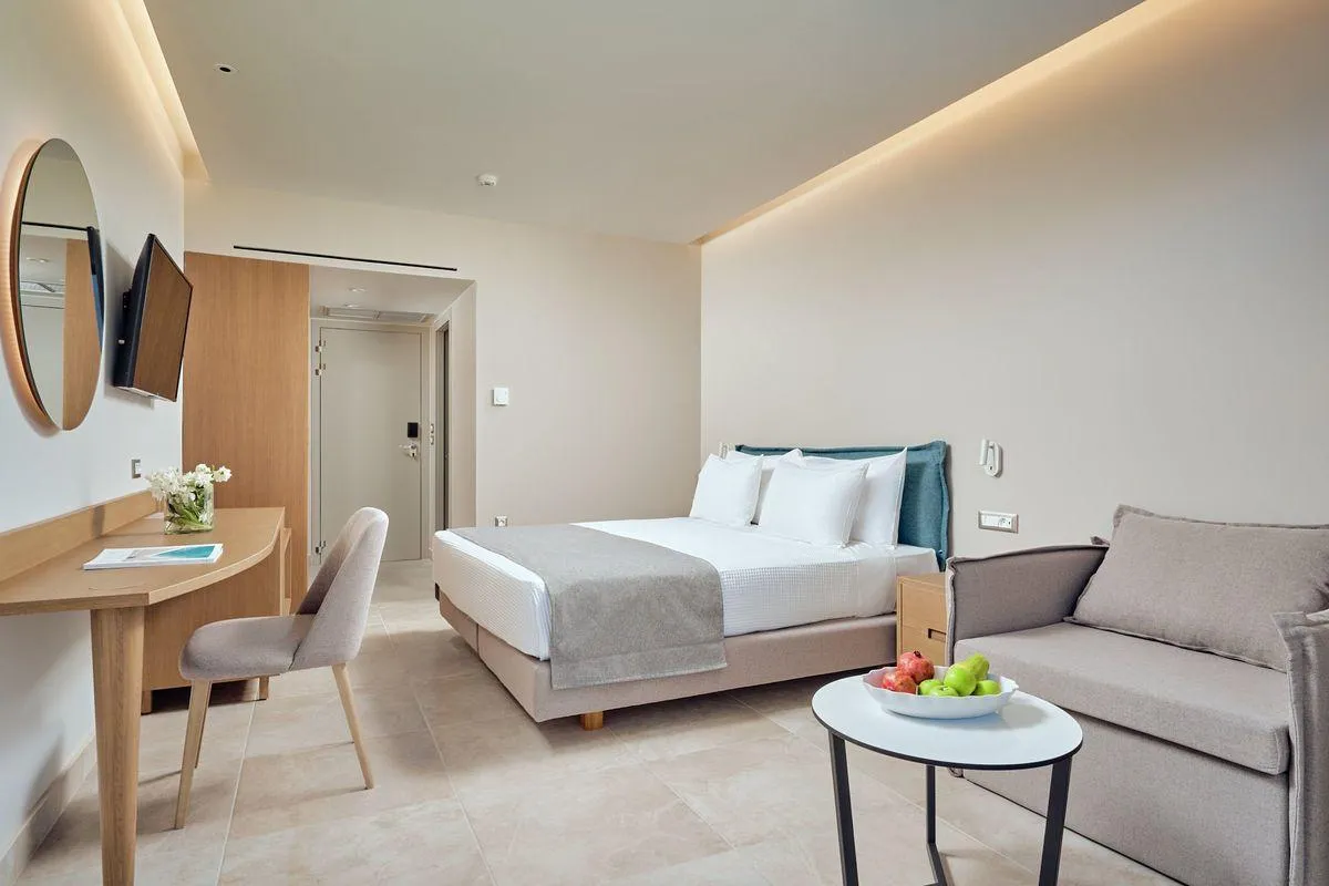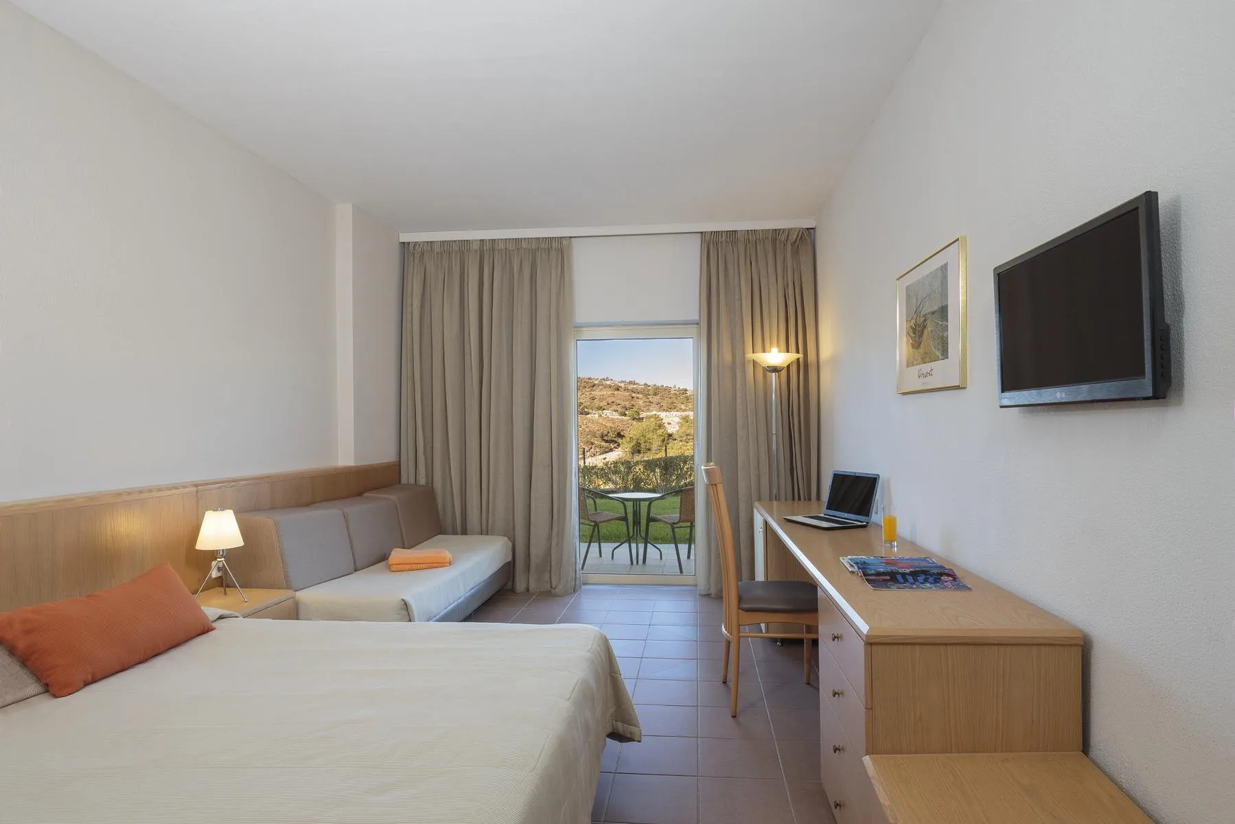 Visa and Euro / MasterCard. Standard FamilyRoom (GardenView): The modern furnished rooms are equipped with double bed or twin bed, sofa bed as extra bed, baby cot (for free), tiled floor, kettle (for free), internet (for free), safe (for free) and flat screen sat TV as well as individually adjustable air conditioning. Towels are changed 3 times a week. Room size: 30 m². Standard FamilyRoom (SeaView): The modern furnished rooms with living room are equipped with double bed or twin bed, sofa bed as extra bed, baby cot (for free), tiled floor, balcony, kettle (for free), internet (for free), safe (for free) and flat screen sat TV as well as individually adjustable air conditioning. Bathroom with shower (room size: 30 m²). Towels are changed 3 times a week. JuniorSuite (SeaView): The modern furnished rooms are equipped with double bed, sofa bed as extra bed, baby cot (for free), tiled floor, balcony, kettle (for free), internet (for free), safe (for free) and flat screen sat TV as well as individually adjustable air conditioning. Bathroom with shower (room size: 28 m²). Towels are changed 3 times a week. SingleUse Room (MountainView): The modern furnished rooms are equipped with double bed or twin bed, tiled floor, balcony or terrace, kettle (for free), internet (for free), safe (for free) and flat screen sat TV as well as individually adjustable air conditioning. Bathroom with shower (room size: 23 m²). Towels are changed 3 times a week. Standard Room (MountainView): The modern furnished rooms are equipped with double bed or twin bed, sofa bed as extra bed, baby cot (for free), tiled floor, balcony or terrace, kettle (for free), internet (for free), safe (for free) and flat screen sat TV as well as individually adjustable air conditioning. Bathroom with shower (room size: 23 m²). Towels are changed 3 times a week. Standard Room (SeaView): The modern furnished rooms are equipped with double bed or twin bed, sofa bed as extra bed, baby cot (for free), tiled floor, balcony, kettle (for free), internet (for free), safe (for free) and flat screen sat TV as well as individually adjustable air conditioning. Towels are changed 3 times a week. Room size: 23 m². Double Standard Room (PoolView, Terrace): The modern furnished rooms are equipped with double bed or twin bed, sofa bed as extra bed, baby cot (for free), tiled floor, kettle (for free), internet (for free), safe (for free) and flat screen sat TV as well as individually adjustable air conditioning. Bathroom with shower (room size: 23 m²). Towels are changed 3 times a week.