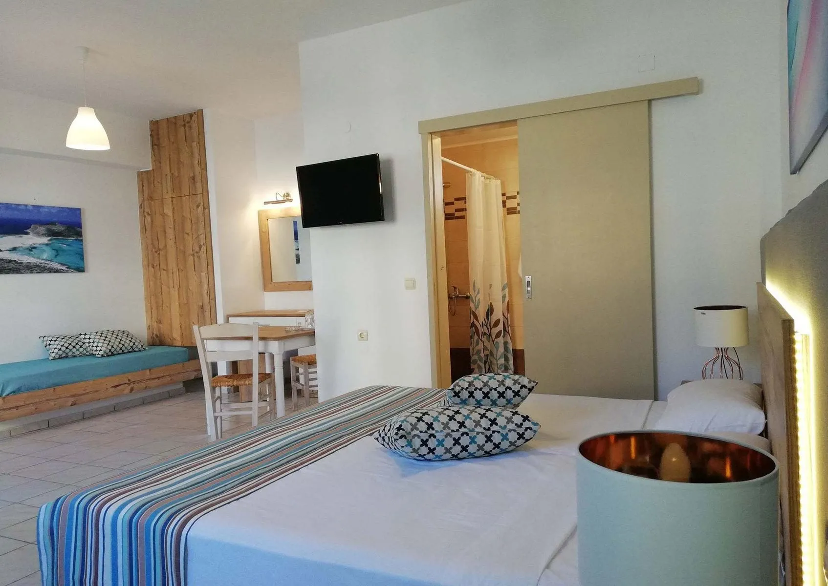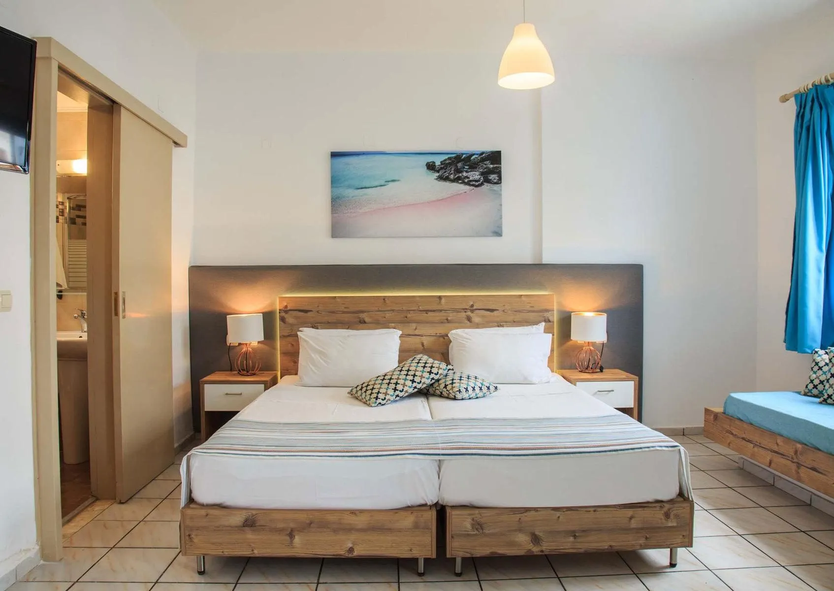 Descriere generală Hotelul Almare Beach Hotel este situat direct pe o plajă. Orașul Heraklion este la aprox. 12 km (Hersonissos cca. 9 km). Magazinele sunt la aprox. 500 m de hotel, și veți găsi un supermarket la cca. 200 m. O discotecă aflată la aprox. 500 m vă invită la dans. Următoarele atracții pot fi accesate de la hotel: Crete Aquarium (cca. 4 km) și Watercity (cca. 4 km). Există posibilitatea de a închiria mașini și motociclete. De asemenea, aveți în apropiere o stație de autobuz (cca. 70 m) și o stație de taxi (cca. 50 m) cea ce vă oferă mobilitate în timpul vacanței. Pentru îngrijiri medicale în caz de urgență, există un spital la cca. 12 km distanță. Aeroportul (CHQ) se află la aprox. 156 km. Un alt aeroport (HER) este la cca. 10 km. Facilități Hotelul dispune de 2 etaje și peste 12 camere. Acesta oferă oaspeților săi aer condiționat. Serviciul de menaj este gratuit. Este posibil să se perceapă un cost suplimentar pentru spălătorie și călcat. Piscină În grădinile acestui hotelul există o piscină. La piscină sunt disponibile gratuit șezlonguri și umbrele de soare. La barul piscinei va puteți bucura de o băutura răcoritoare (deschis între orele 10:00 - 23:00). Catering Mic dejun (între orele 07:45 - 09:30). Demipensiunea include micul dejun și cina. Sport/Leisure Oferte pentru sport și divertisment: Tenis (posibil contra cost, la cca. 8 km distanță). La cca. 9 km de hotel este un teren de golf. Există serviciu de închiriere de biciclete. Oferte de wellness: Masaje posibil contra cost. Informații suplimentare Pentru anumite facilități sau activități se pot aplica taxe suplimentare. Unele servicii depind de anotimp și de condițiile climatice locale. Check-in este disponibil începând cu ora 14:00, și check-out până la ora 11:00. Doppel Zimmer (Gartenblick): Dotate cu balcon sau terasă și acces la internet (gratuit). Dimensiune: 70 m². Doppel Zimmer (Seitlicher Meerblick): Dotate cu balcon sau terasă și acces la internet (gratuit). Dimensiune: 70 m².