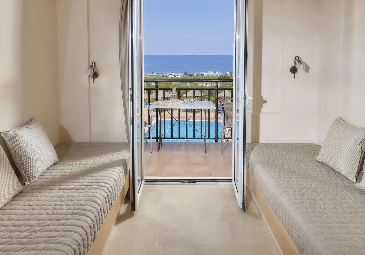 Euro / MasterCard, Visa and American Express. 1 Bedroom Premium Apartment: The rooms are equipped with queen size bed, extra bed (sofa bed), baby cot (for free), tiled floor, kitchenette, microwave, kettle (for free), balcony or terrace, internet (for free), safe (for free) and flat screen sat TV as well as individually adjustable air conditioning. Bathroom with shower (room size: 36 m²). Towels are changed 3 times a week (free of charge). Bed linen is changed 3 times a week (free of charge). 1 Bedroom Superior Apartment: The rooms are equipped with queen size bed, extra bed (sofa bed), baby cot (for free), tiled floor, kitchenette, microwave, kettle (for free), balcony or terrace, internet (for free), safe (for free) and flat screen sat TV as well as individually adjustable air conditioning. Bathroom with shower (room size: 42 m²). Towels are changed 3 times a week (free of charge). Bed linen is changed 3 times a week (free of charge). JuniorSuite: The rooms are equipped with queen size bed, extra bed (sofa bed), baby cot (for free), tiled floor, kitchenette, microwave, kettle (for free), balcony or terrace, internet (for free), safe (for free) and flat screen sat TV as well as individually adjustable air conditioning. Bathroom with shower (room size: 25 m²). Towels are changed 3 times a week (free of charge). Bed linen is changed 3 times a week (free of charge). Studio (Private Pool ): The rooms are equipped with queen size bed, extra bed (sofa bed), baby cot (for free), tiled floor, kitchenette, microwave, kettle (for free), internet (for free), safe (for free) and flat screen sat TV as well as individually adjustable air conditioning. Bathroom with shower. Towels are changed 3 times a week (free of charge). Bed linen is changed 3 times a week (free of charge). Premium Studio: The rooms are equipped with queen size bed, extra bed (sofa bed), baby cot (for free), tiled floor, kitchenette, microwave, kettle (for free), balcony or terrace, internet (for free), safe (for free) and flat screen sat TV as well as individually adjustable air conditioning. Bathroom with shower (room size: 22 m²). Towels are changed 3 times a week (free of charge). Bed linen is changed 3 times a week (free of charge). Superior Studio: The rooms are equipped with queen size bed, extra bed (sofa bed), baby cot (for free), tiled floor, kitchenette, microwave, kettle (for free), internet (for free), safe (for free) and flat screen sat TV as well as individually adjustable air conditioning. Bathroom with shower (room size: 25 m²). Towels are changed 3 times a week (free of charge). Bed linen is changed 3 times a week (free of charge).