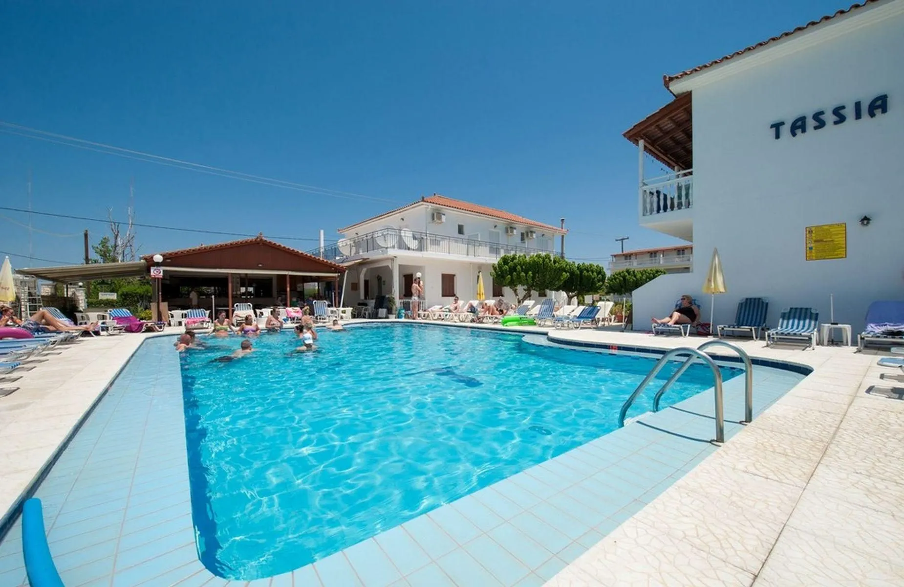 Descriere generală Hotelul Tassia Hotel, care este deosebit de popular printre cei aflați în luna de miere, este situat in Laganas, la cca. 3 km de plajă. Centrul turistic al orașului se află la aprox. 5 km. Magazinele sunt la aprox. 6 km de hotel, și veți găsi un supermarket la cca. 500 m. De asemenea, cele mai apropiate baruri și restaurante sunt la cca. 500 m. Pentru îngrijiri medicale în caz de urgență, există un spital la cca. 1 km distanță. Aeroportul (ZTH) se află la aprox. 5 km. Facilități Hotelul familiar dispune de 2 etaje și peste 32 camere repartizate între o clădire principală și de 2 clădiri secundare. Acesta oferă oaspeților săi recepție (check-in de la 14:00, check out până la 10:00), lobby, aer condiționat și seif (gratuit). Room service și serviciul de concierge sunt gratuite. Piscină Zona exterioară a hotelului include o piscină cu apă dulce. La piscină sunt disponibile șezlonguri gratuite. Sport/Leisure Este disponibil: Tenis de masă (gratuit), biliard (contra cost) și darts (gratuit). Informații suplimentare Pentru anumite facilități sau activități se pot aplica taxe suplimentare. Unele servicii depind de anotimp și de condițiile climatice locale. Limbi de serviciu: engleză, italiană și greacă. Carduri de credit: Visa și Euro/MasterCard. Standard Studio (Balkon oder Terrasse): Cameră cu pat twin sau pat single, ceainic (gratuit), balcon, seif (contra cost), TV și canale locale precum și aer condiționat reglabil individual. Baie cu duș. Prosoapele se schimbă de 2 ori pe săptămână. Dimensiune: 23 m².