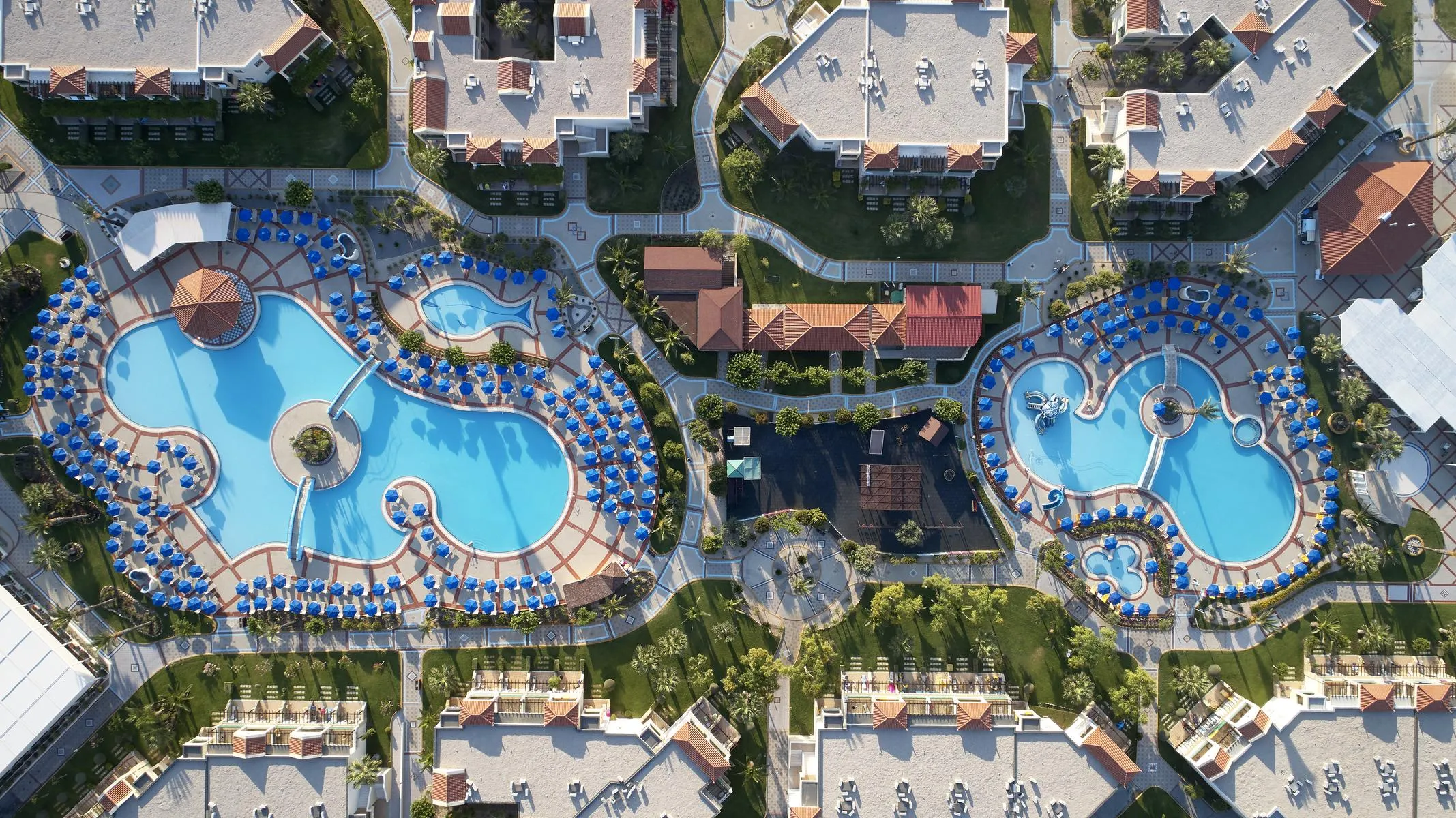 The 3-storey resort consists of a main building and 14 adjoining buildings, and has 639 rooms in total. It offers its guests a reception (check-in from 15:00, check-out until 12:00), a lobby with bar, 2 lifts, air conditioning, coiffeur, a mini market, various other shops, a free parking area and a money changing facility. For the meals, there are 4 restaurants (air-conditioned) and a snack bar. In a total 4 bars, you can relax in good company. WiFi is available for free. For guests dependent on a wheelchair the accommodation provides a barrier-free access, a wheelchair accessible lift and a number of wheelchair accessible bathrooms. Room cleaning is free of charge. Laundry / ironing service and medical service (from 10:00 - 13:00) are available for a fee. Pool: In the outdoor area of the hotel you will find 5 fresh water pools with a separate children´s pool (open from April to October). Here, there are sun loungers and sun umbrellas for free available. Refreshing beverages can be consumed directly at the pool bar (open from 10:00 - 00:00).
