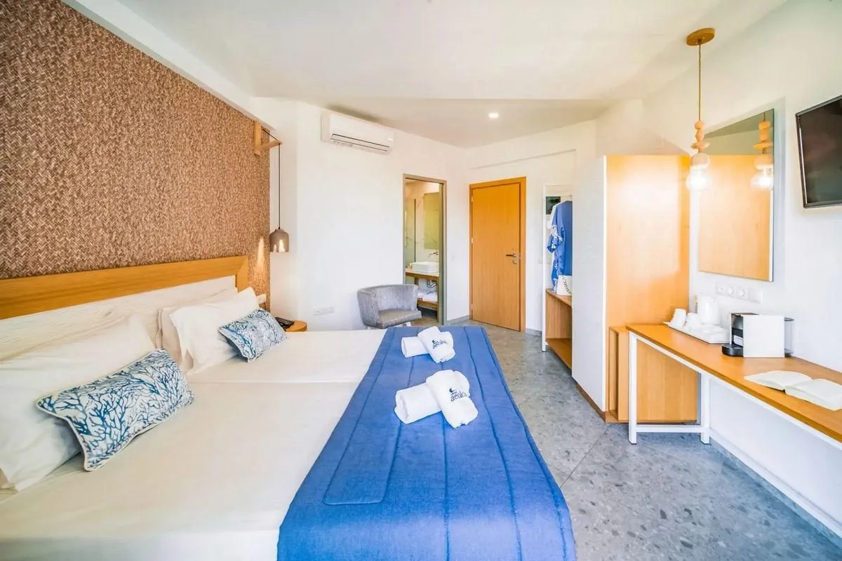 Euro / MasterCard and Visa. Twin Deluxe Room: The modern furnished rooms are equipped with single bed, baby cot (for free), tiled floor, kettle (for free), balcony or terrace, internet (for free), safe (for a fee) and sat TV. Bathroom with shower (room size: 20 m²). Towels are changed 2 times a week (free of charge). Bed linen is changed weekly (free of charge). Twin Deluxe Room (Non-Refundable): The modern furnished rooms are equipped with single bed, baby cot (for free), tiled floor, kettle (for free), balcony or terrace, internet (for free), safe (for a fee) and sat TV. Bathroom with shower (room size: 20 m²). Towels are changed 2 times a week (free of charge). Bed linen is changed weekly (free of charge). Standard Room (LateralSeaView): The rooms are equipped with single bed, baby cot (for free), tiled floor, kettle (for free), balcony or terrace, internet (for free), safe (for a fee) and sat TV as well as individually adjustable air conditioning (extra fee). Bathroom with shower (room size: 18 m²). Towels are changed 2 times a week (free of charge). Bed linen is changed weekly (free of charge). Superior Room: The rooms are equipped with single bed, baby cot (for free), tiled floor, kettle (for free), balcony or terrace, internet (for free), safe (for a fee) and sat TV as well as individually adjustable air conditioning (extra fee). Bathroom with shower (room size: 20 m²). Towels are changed 2 times a week (free of charge). Bed linen is changed weekly (free of charge). Triple Superior Room: The rooms are equipped with single bed, baby cot (for free), tiled floor, kettle (for free), balcony or terrace, internet (for free), safe (for a fee) and sat TV as well as individually adjustable air conditioning (extra fee). Bathroom with shower (room size: 20 m²). Towels are changed 2 times a week (free of charge). Bed linen is changed weekly (free of charge). Triple Superior Room (LateralSeaView): The rooms are equipped with single bed, baby cot (for free), tiled floor, kettle (for free), balcony or terrace, internet (for free), safe (for a fee) and sat TV as well as individually adjustable air conditioning (extra fee). Bathroom with shower (room size: 20 m²). Towels are changed 2 times a week (free of charge). Bed linen is changed weekly (free of charge). Triple Superior Room (LateralSeaView, Non-Refundable): The rooms are equipped with single bed, baby cot (for free), tiled floor, kettle (for free), balcony or terrace, internet (for free), safe (for a fee) and sat TV as well as individually adjustable air conditioning (extra fee). Bathroom with shower (room size: 20 m²). Towels are changed 2 times a week (free of charge). Bed linen is changed weekly (free of charge). * TWIN DELUXE ROOM has Aircondition Free of charge