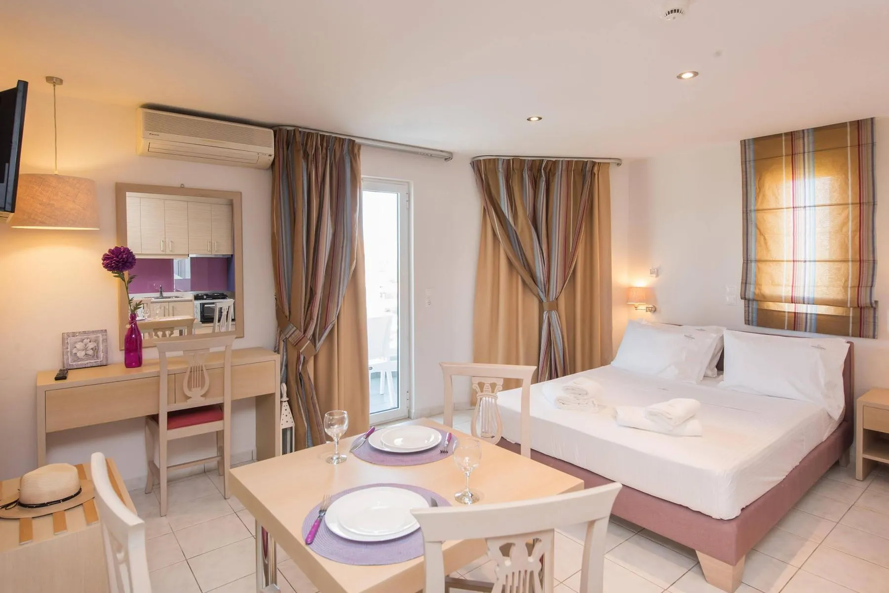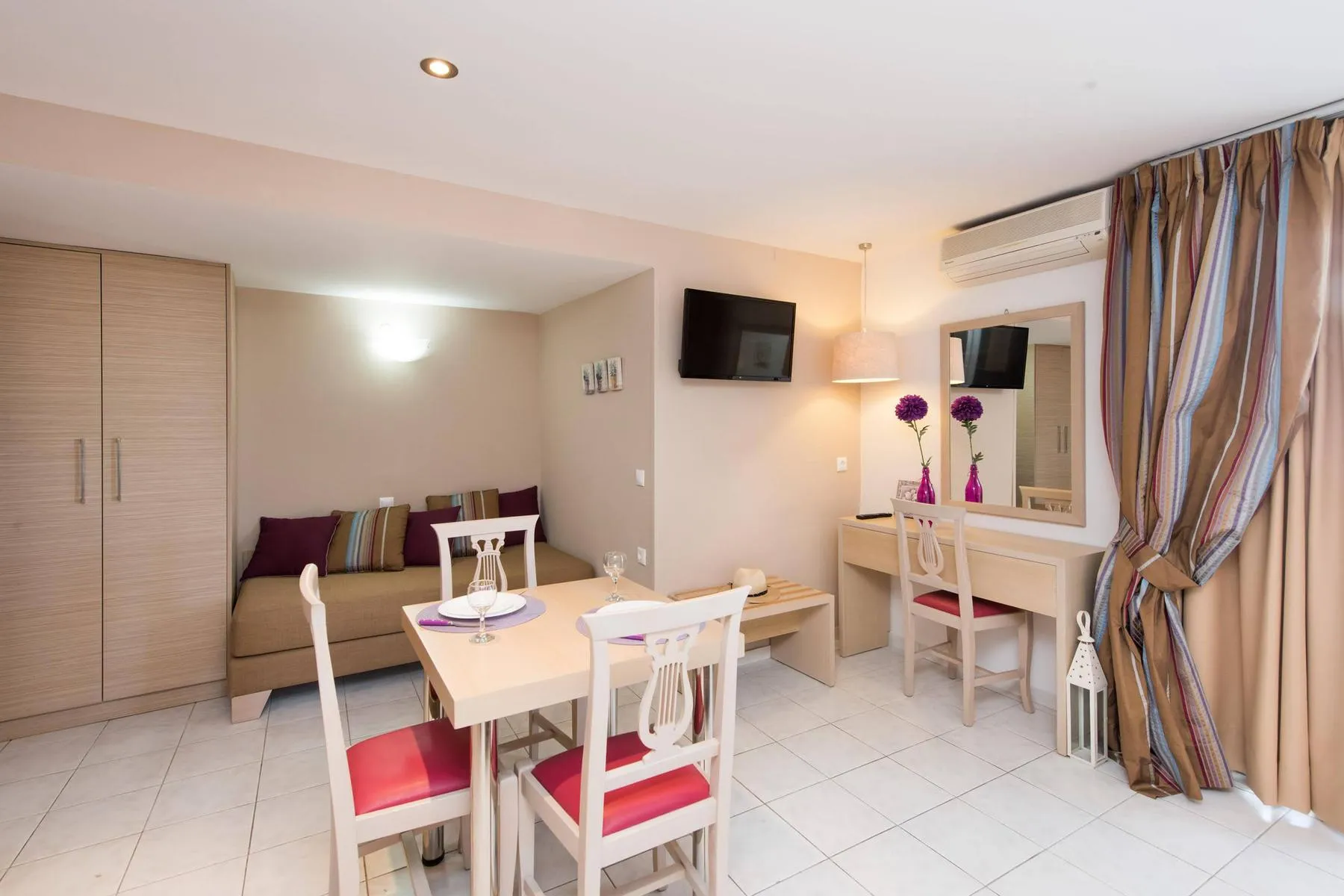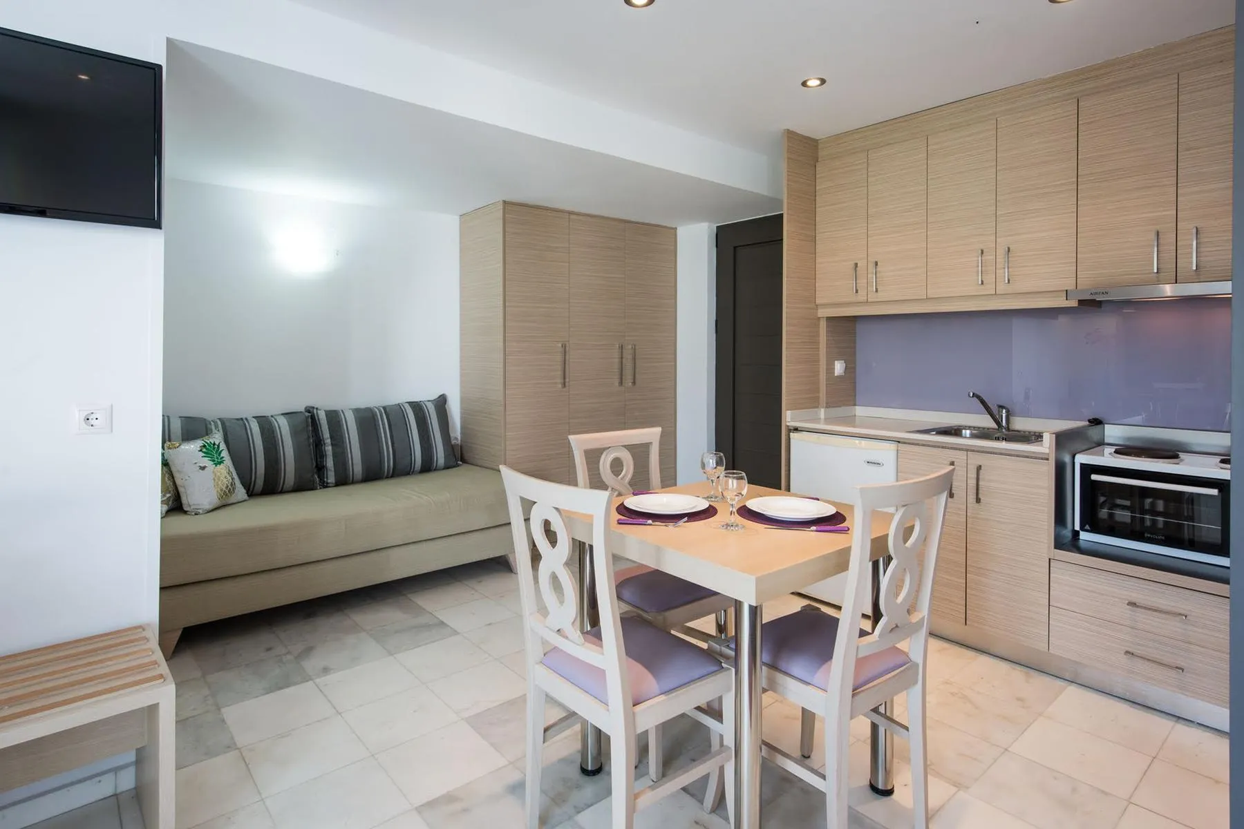 Visa and Euro / MasterCard. Triple JuniorSuite (GardenView): The modern furnished rooms are equipped with double bed or twin bed, sofa bed as extra bed, baby cot (for free), tiled floor, kitchenette, balcony, kettle (for free), internet (for free), safe (for free) and flat screen sat TV as well as individually adjustable air conditioning (extra fee). Bathroom with shower (room size: 27 m²). Towels are changed 2 times a week. Double Superior Studio (GardenView): The modern furnished rooms are equipped with double bed or twin bed, baby cot (for free), tiled floor, kitchenette, balcony or terrace, kettle (for free), internet (for free), safe (for free) and flat screen sat TV as well as individually adjustable air conditioning (extra fee). Bathroom with shower (room size: 18 m²). Towels are changed 2 times a week. Double Superior Studio (PoolView): The modern furnished rooms are equipped with double bed or twin bed, baby cot (for free), tiled floor, kitchenette, balcony or terrace, kettle (for free), internet (for free), safe (for free) and flat screen sat TV as well as individually adjustable air conditioning (extra fee). Bathroom with shower (room size: 18 m²). Towels are changed 2 times a week.