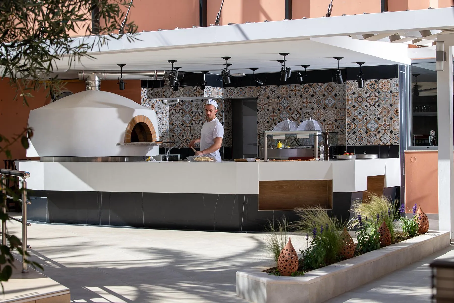 Recently renovated in 2025, the 3-storey beach hotel consists of a main building and 9 adjoining buildings, and has 144 rooms in total. It is equipped with a reception (check-in from 15:00, check-out until 11:00), a lobby, 3 lifts, a safe (for free), a parking area (for free) as well as the Sunset Signature Cocktails Bar sky bar (19:00 - 00:00), open from May to October. For the meals, there are three restaurants (air-conditioned). In a total 4 bars, you can relax in good company. WiFi is available for free. Room cleaning is free of charge. Room service, laundry service and medical service are available for a fee. For the concierge service the hotel charges a fee (where applicable). Pool: In the outdoor area of the hotel you will find 4 fresh water pools. Here, there are sun loungers and sun umbrellas for free available. At the pool bar you can get refreshing beverages (open from 10:30 - 18:00).