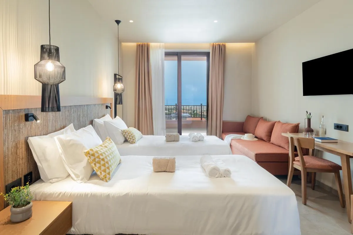 Descriere generală Hotelul Pyria Hotel, care este deosebit de popular printre cei aflați în luna de miere, este la doar aprox. 200 m de cele mai apropiate baruri și restaurante. Cea mai apropiată plajă, o plajă cu nisip/cu stânci se află la cca. 2 km distanță. Pe plajă sunt disponibile șezlonguri și umbrele de soare la un cost suplimentar. Centrul turistic al orașului se află la aprox. 1 km. Orașul Heraklion este la aprox. 25 km (Agios Nikolaos cca. 41 km, Chania cca. 164 km). Diverse magazine se află la aprox. 1 km de hotel, și chiar lângă hotel este un supermarket. O discotecă aflată la aprox. 500 km vă invită la dans. Următoarele atracții pot fi accesate de la hotel: Lychnostatis Open Air Museum (cca. 3 km), Acqua Plus Water Park (cca. 4 km), Museum of Rural Life și Church of Mary. Există posibilitatea de a închiria mașini și motociclete. De asemenea, aveți în apropiere o stație de autobuz și o stație de taxi (cca. 1 km) cea ce vă oferă mobilitate în timpul vacanței. Pentru îngrijiri medicale în caz de urgență, există un spital la cca. 2 km distanță. Aeroportul (CHQ) se află la aprox. 171 km. Un serviciu de transfer (contra cost) face legătura între hotel și aeroport. Un alt aeroport (HER) este la cca. 25 km. Facilități Hotelul de tip boutique, care a fost complet renovat în 2024, dispune de 2 etaje și peste 56 camere repartizate între o clădire principală și de 5 clădiri secundare. Acesta oferă oaspeților săi recepție (check-in de la 14:00, check out până la 11:00), lobby cu bar, lift, aer condiționat, seif (gratuit), parcare (gratuită) și sistem securizat de intrare. Pentru a satisface apetitul vă stau la dispoziție un restaurant și un snackbar. Accesul la internet WiFi este disponibil gratuit pentru oaspeții hotelului. Pentru oaspeții cu dizabilități fizice, unitatea de cazare oferă un lift accesibil pentru scaune cu rotile, băi parțial accesibile pentru scaune cu rotile și acces fără bariere. Serviciul de menaj și serviciul de concierge sunt gratuite. Spălătorie, călcat și serviciul medical (între orele 00:00 - 23:59) sunt disponibile la un cost suplimentar. Piscină Zona exterioară a hotelului decorat în stil mediteranean include 4 piscine cu apă dulce (deschise din aprilie până în octombrie). La piscine sunt disponibile gratuit șezlonguri și umbrele de soare. La barul piscinei va puteți bucura de o băutura răcoritoare (deschis între orele 09:00 - 00:00). Catering Mic dejun (între orele 07:30 - 10:00) bufet suedez. Demipensiunea include micul dejun și cina. Sport/Leisure La cca. 2 km de hotel, sunt oferite sporturi nautice precum jet ski, schi nautic și plimbări cu barca cu motor (unele de către furnizori locali). La cca. 3 km de hotel este un teren de golf. Există serviciu de închiriere de biciclete. În plus parcare pentru biciclete (contra cost). Divertisment pentru adulți: spectacole de seară și muzică live. Informații suplimentare Pentru anumite facilități sau activități se pot aplica taxe suplimentare. Unele servicii depind de anotimp și de condițiile climatice locale. Limbi de serviciu: engleză, germană și franceză. Carduri de credit: Euro/MasterCard și Visa. Doppel Zimmer: Camerele moderne sunt echipate cu pat dublu sau pat twin, pardoseală cu gresie, încălzire controlată centralizat, ceainic (gratuit), balcon sau terasă, acces la internet (gratuit), seif (gratuit) și TV cu ecran plat prin satelit precum și aer condiționat controlat central (din aprilie până în octombrie). Baie cu duș. Prosoapele și lenjeria de pat se schimbă de 2 ori pe săptămână. Dimensiune: 17 - 26 m². Doppel Zimmer (Economy): Camerele moderne sunt echipate cu pat dublu, pardoseală cu gresie, încălzire controlată centralizat, ceainic (gratuit), acces la internet (gratuit), seif (gratuit) și TV cu ecran plat prin satelit precum și aer condiționat controlat central (din aprilie până în octombrie). Baie cu duș. Prosoapele și lenjeria de pat se schimbă de 2 ori pe săptămână. Dimensiune: 18 - 20 m². Doppel Zimmer (Meerblick): Camerele moderne sunt echipate cu pat twin, pardoseală cu gresie, încălzire controlată centralizat, ceainic (gratuit), balcon sau terasă, acces la internet (gratuit), seif (gratuit) și TV cu ecran plat prin satelit precum și aer condiționat controlat central (din aprilie până în octombrie). Baie cu duș. Prosoapele și lenjeria de pat se schimbă de 2 ori pe săptămână. Dimensiune: 25 - 25 m². Suite (Gartenblick): Camerele moderne cu living sunt echipate cu pat dublu sau pat twin, o canapea extensibilă ca pat suplimentar, pardoseală cu gresie, încălzire controlată centralizat, ceainic (gratuit), balcon sau terasă, acces la internet (gratuit), seif (gratuit), aparat de cafea cu capsule (posibil contra cost) și TV cu ecran plat prin satelit precum și aer condiționat controlat central (din aprilie până în octombrie). Baie cu duș. Prosoapele și lenjeria de pat se schimbă de 2 ori pe săptămână. Dimensiune: 35 - 35 m². Suite (Meerblick): Camerele moderne cu living sunt echipate cu pat twin, o canapea extensibilă ca pat suplimentar, pardoseală cu gresie, încălzire controlată centralizat, ceainic (gratuit), balcon sau terasă, acces la internet (gratuit), seif (gratuit), aparat de cafea cu capsule (posibil contra cost) și TV cu ecran plat prin satelit precum și aer condiționat controlat central (din aprilie până în octombrie). Baie cu duș. Prosoapele și lenjeria de pat se schimbă de 2 ori pe săptămână. Dimensiune: 35 - 35 m². Superior Suite: sunt echipate cu living, pat dublu sau pat twin, o canapea extensibilă ca pat suplimentar, pardoseală cu gresie, încălzire controlată centralizat, ceainic (gratuit), balcon sau terasă, acces la internet (gratuit), seif (gratuit), aparat de cafea cu capsule (posibil contra cost) și TV cu ecran plat prin satelit precum și aer condiționat 