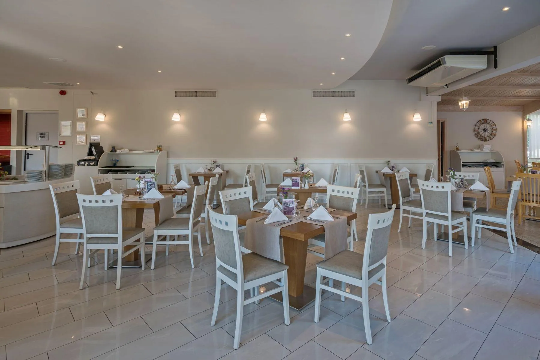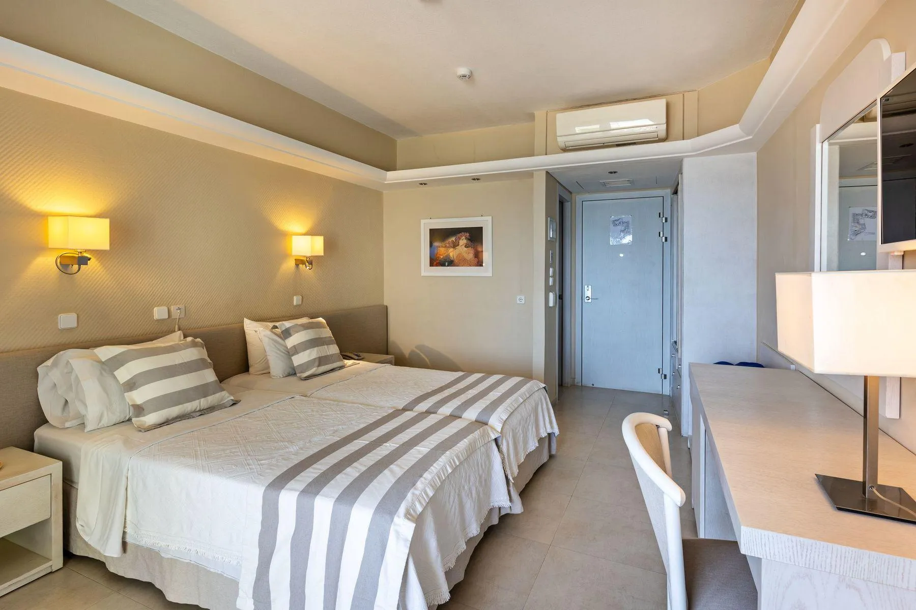 The 3-storey beach hotel has 148 rooms, and spread over one main building and 3 adjoining buildings. It offers its guests a reception (check-in from 14:00, check-out until 11:00), a lobby with bar, 4 lifts, air conditioning, a safe (for free), kiosk, a free parking area and a money changing facility. For the meals, there is a restaurant (air-conditioned) and a snack bar. You will be warmly welcomed in both the hotel’s bars. WiFi is available for free. For guests dependent on a wheelchair the accommodation provides a barrier-free access and a wheelchair accessible lift. Room cleaning and concierge service are free of charge. Room service and laundry / ironing service are available for a fee. Pool: In the outdoor area of the hotel you will find one fresh water pool with a children´s pool. Here, there are sun loungers and sun umbrellas for free available.