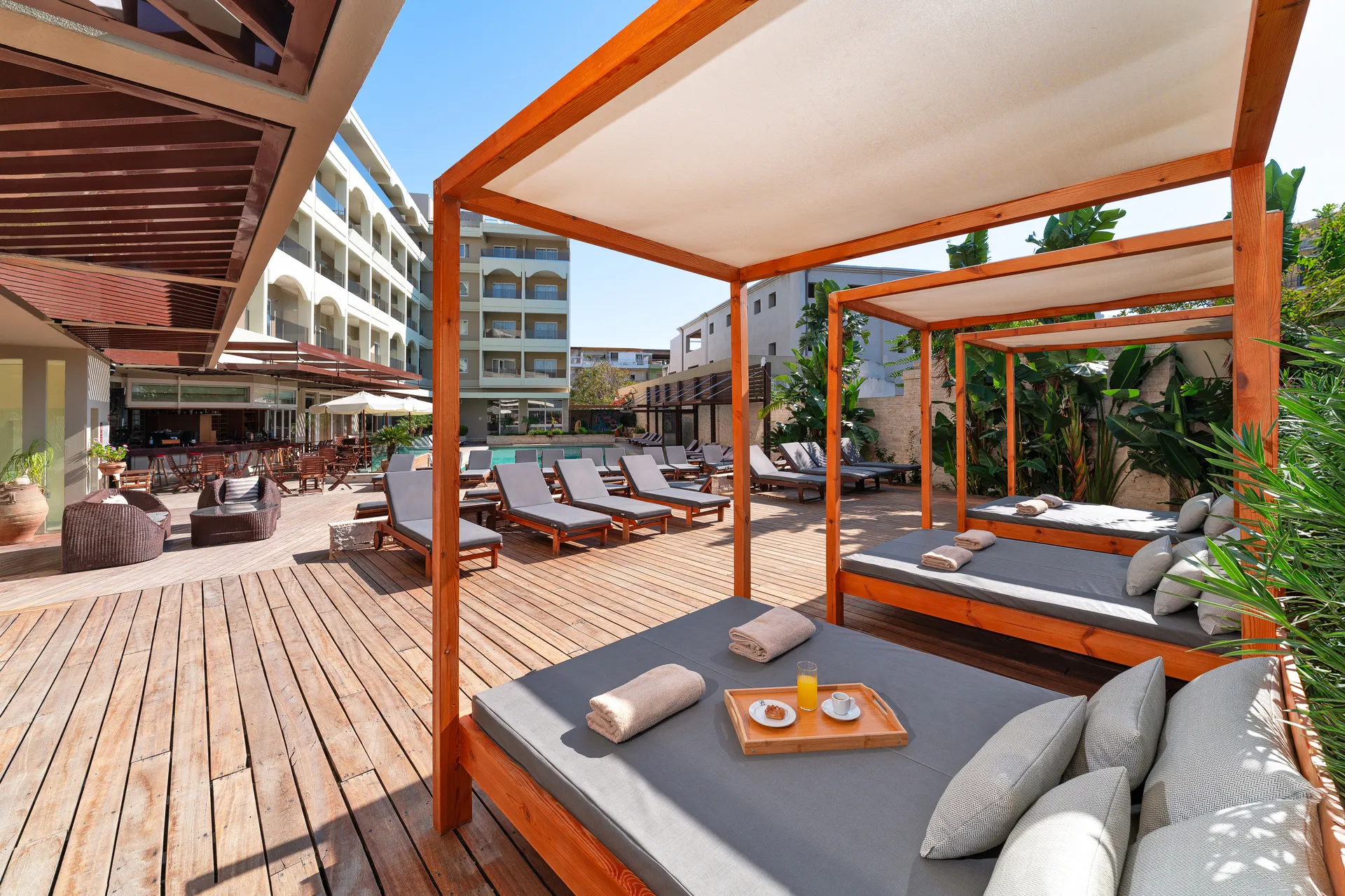 Around 50 m from a beach is located the apart hotel ATHINEON. The nearest bars and restaurants are located directly next to the building. The old town is around 6 km away. A supermarket is just a few metres away from the hotel. There is a shuttle between the hotel and the airport (for a fee). The air-conditioned hotel is equipped with a 24h reception (check-in is possible around the clock), a lobby bar, Wi-Fi, internet access, a shop, cash machine, showers and changing rooms, a first aid kit, parking spaces as well as a TV lounge. At the pool, deck chairs are available for free. Furthermore, you can relax outdoors on a terrace. For very young guests, kid`s chairs can be provided). For the smallest children prams can be rented in the hotel. You can store your luggage in the hotel's storage room. There is also a laundry service available at an additional cost to customers. Ironing equipment can be rented at the hotel for a fee. If necessary, you can contact the medical centre at any time (for a fee). At the reception, tickets are offered for excursions in the area. For smokers there are special smoking zones in the hotel. For guests on their honeymoon, the hotel has special offers such as special honeymoon packages. In your hotel, a lot of focus is placed on sustainability. This includes among others a central room air-conditioning. Due to its barrier-free facilities , such as separate, barrier-free entrances, wheelchair accessible rooms and a wheelchair accessible lift, the hotel is also suitable for wheelchair users. Catering Breakfast is offered American, from the buffet, à la carte or as brunch. Enjoy your lunch as a set meal. Dinner is also served as a set meal or à la carte. For the meals, there are a buffet restaurant with terrace (Mediterranean, calorie-reduced, gluten-free and vegetarian dishes) and a bar as well as the pool bar (open from 4). Distances